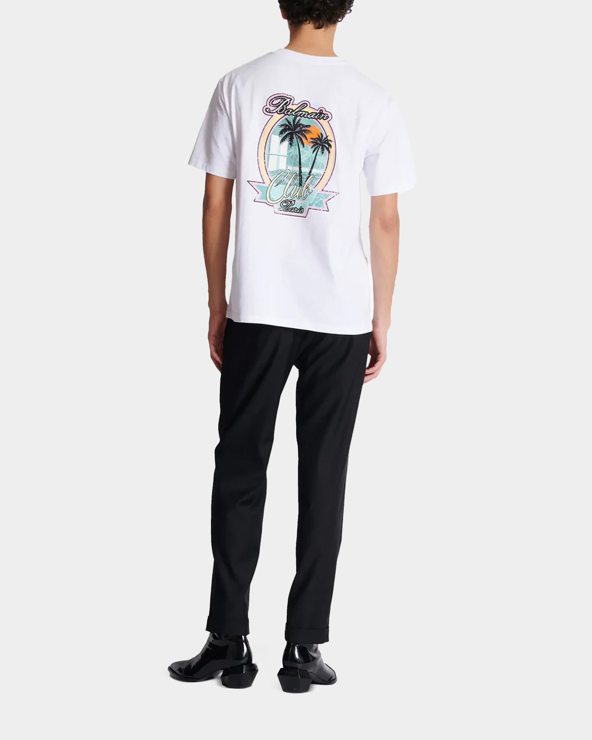 採用直筒剪裁與柔軟純棉布料,前胸以精緻棕櫚樹與品牌標誌圖騰點綴,展現輕鬆奢華風格。背後則印有 BALMAIN CLUB 藝術風格字樣,為簡約外型增添細節亮點。清新白色調,適合日常穿搭或夏日度假造型。