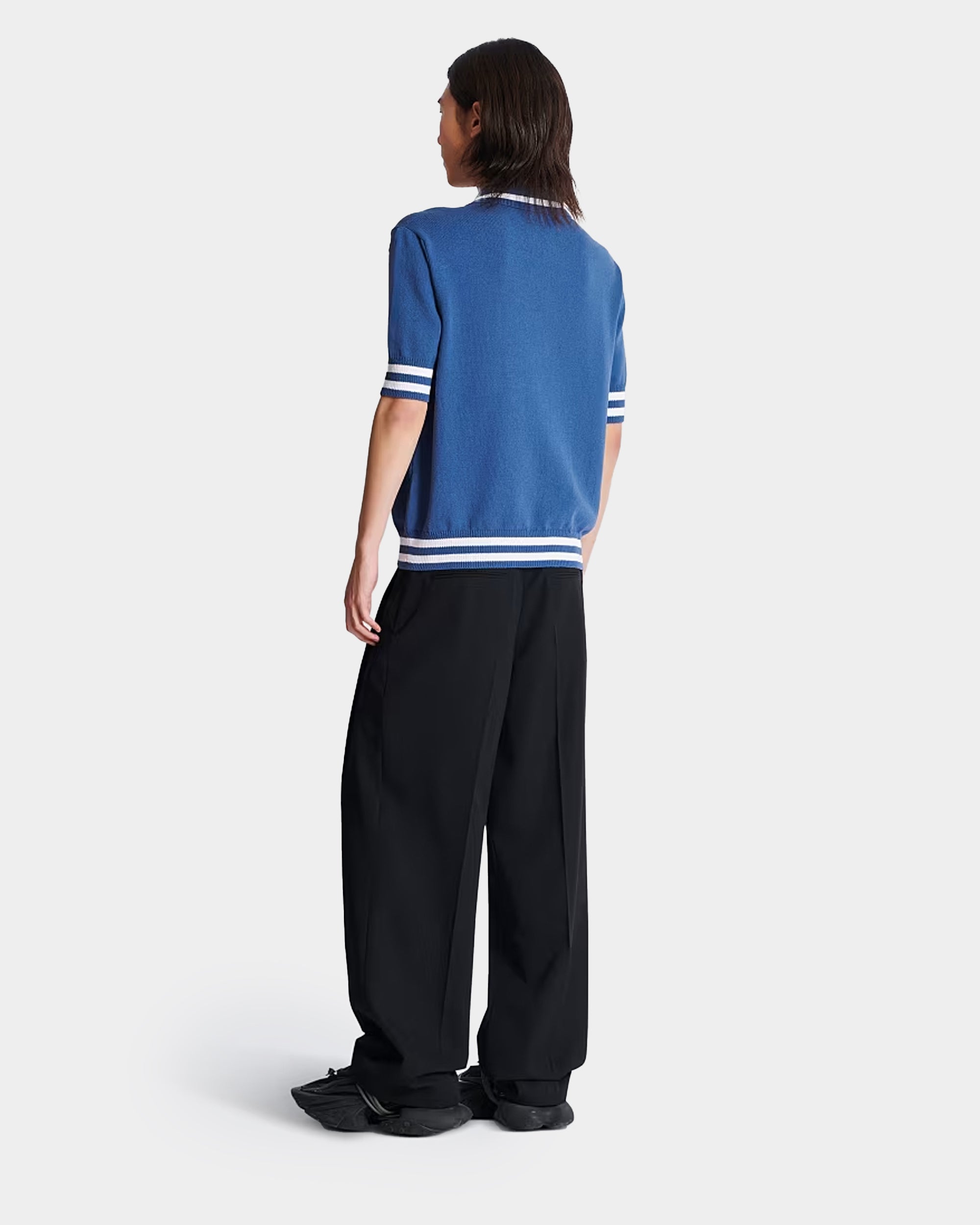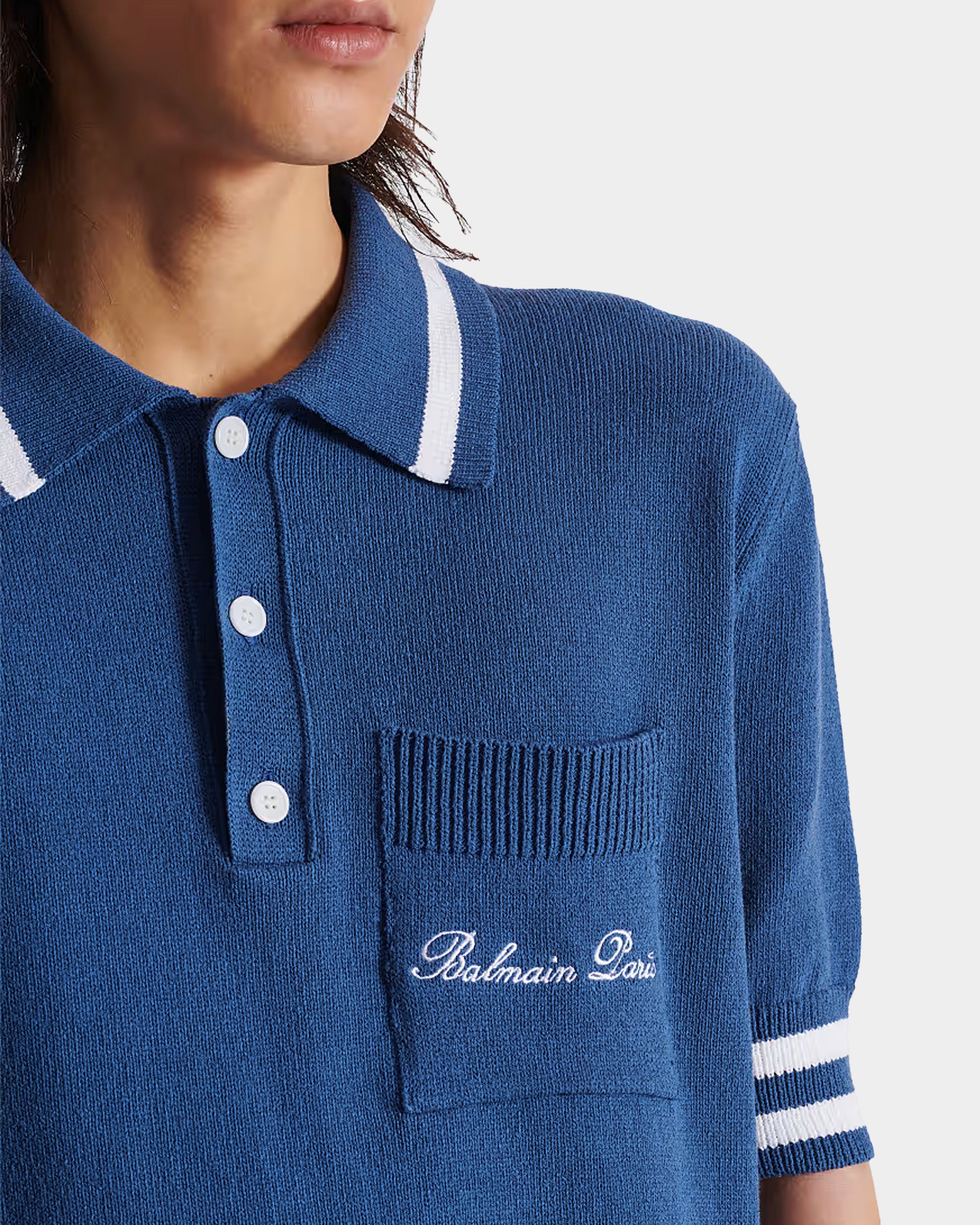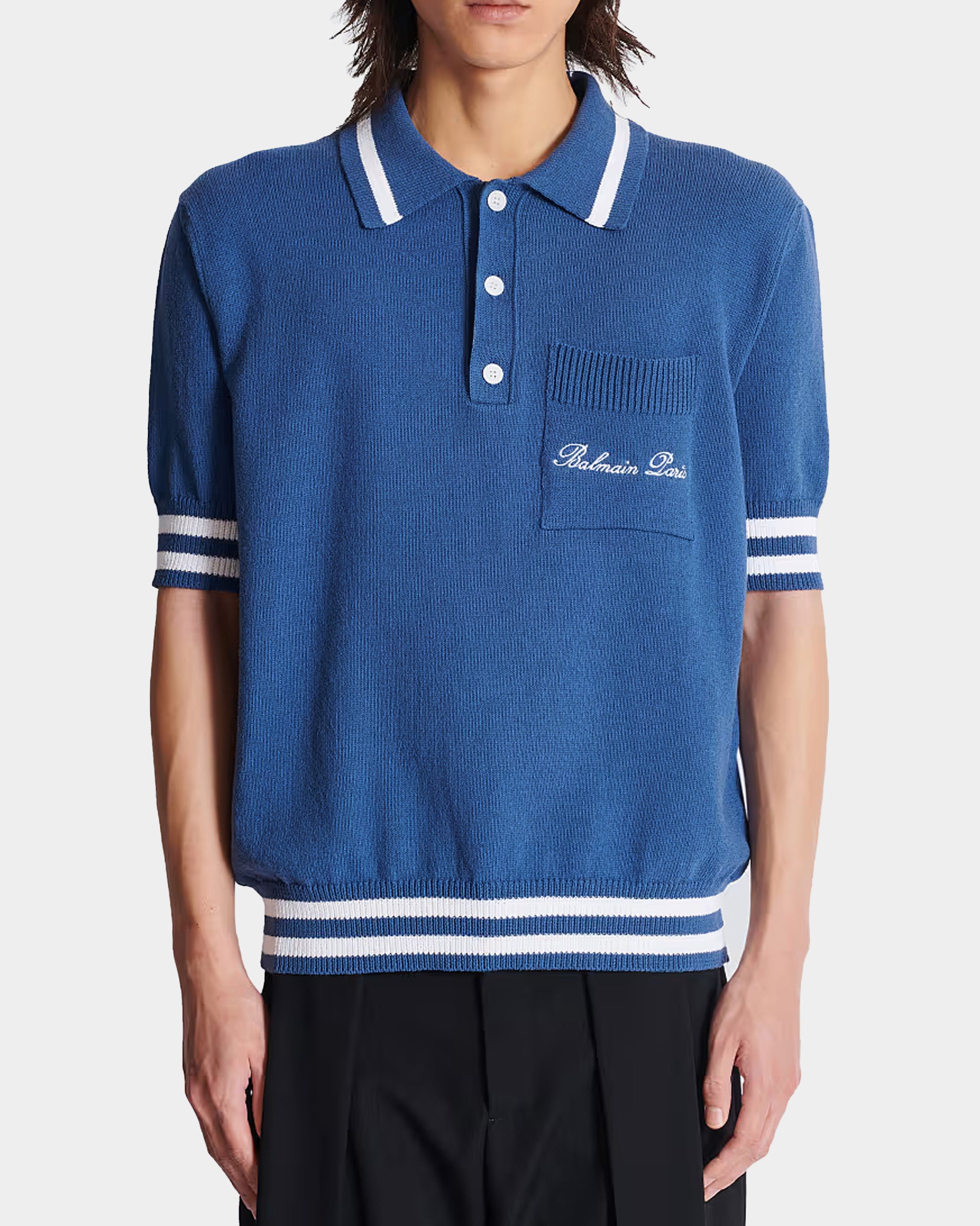 經典短袖 Polo 衫剪裁,胸前 Balmain Paris 刺繡與羅紋條紋滾邊設計,展現高雅運動風格,適合日常或休閒正式穿搭。