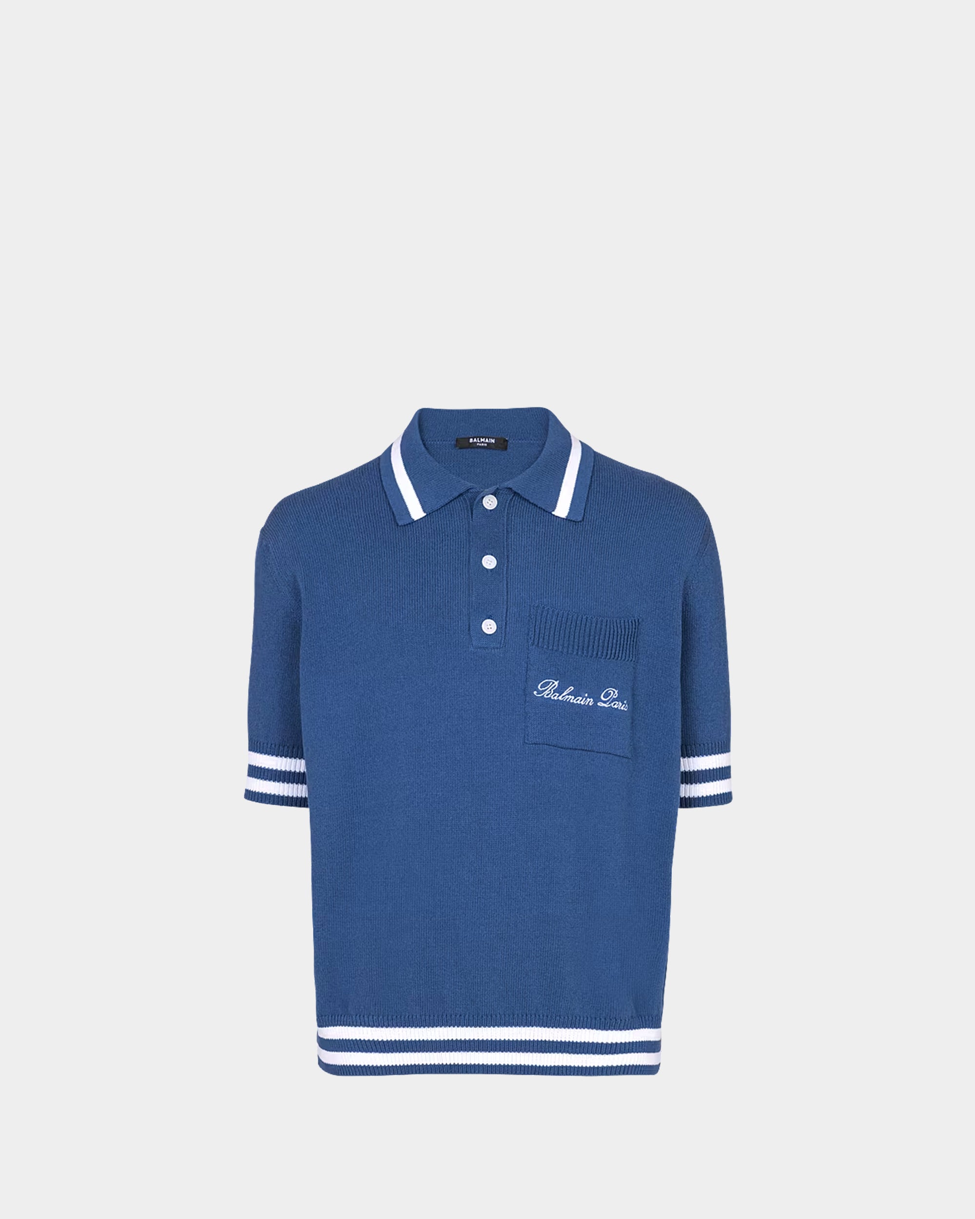 BALMAIN 條紋滾邊刺繡羊毛感 Polo 衫 - 藍
