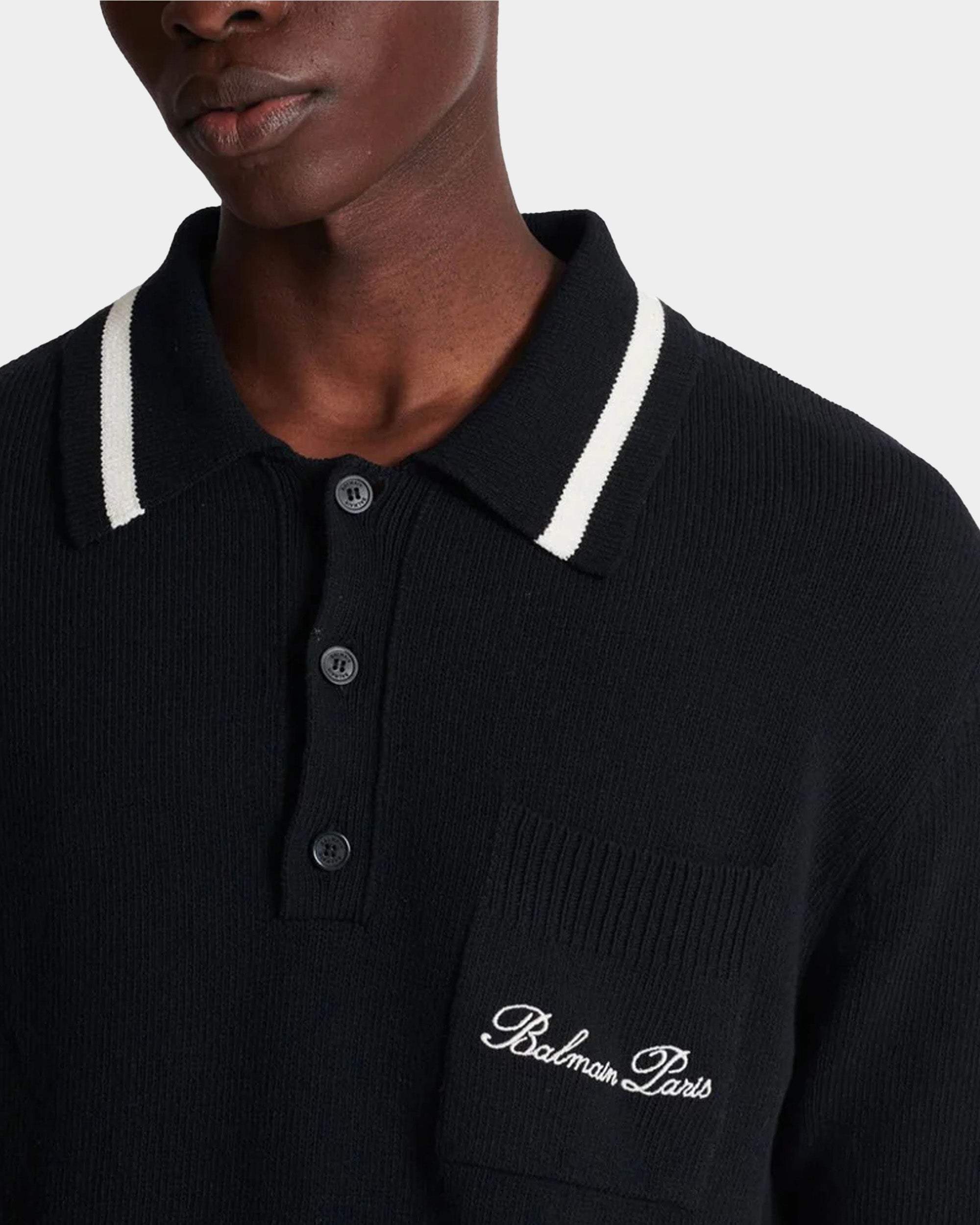 經典短袖 Polo 衫剪裁,胸前 Balmain Paris 刺繡與羅紋條紋滾邊設計,展現高雅運動風格,適合日常或休閒正式穿搭。