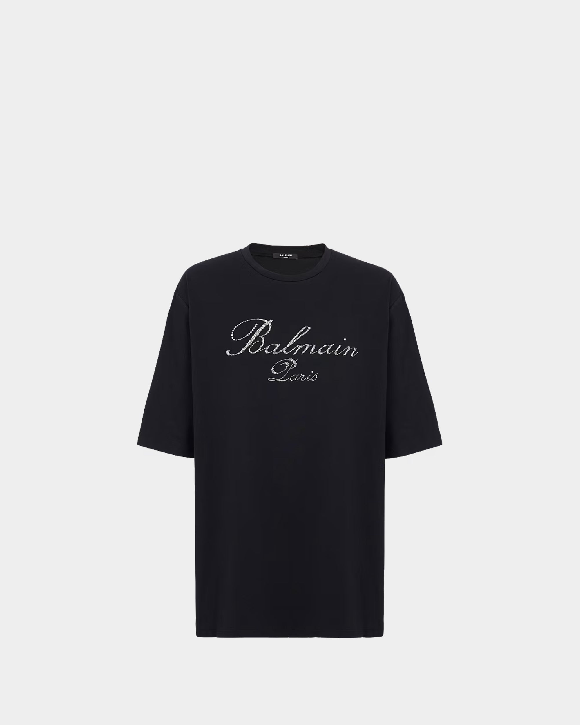 正面以水晶與珠飾精緻刺繡出品牌手寫風格 Logo,展現耀眼奢華質感。寬鬆版型設計,圓領剪裁,舒適不失時尚感,無論單穿或作為層次穿搭都能輕鬆駕馭,為日常造型增添亮點。