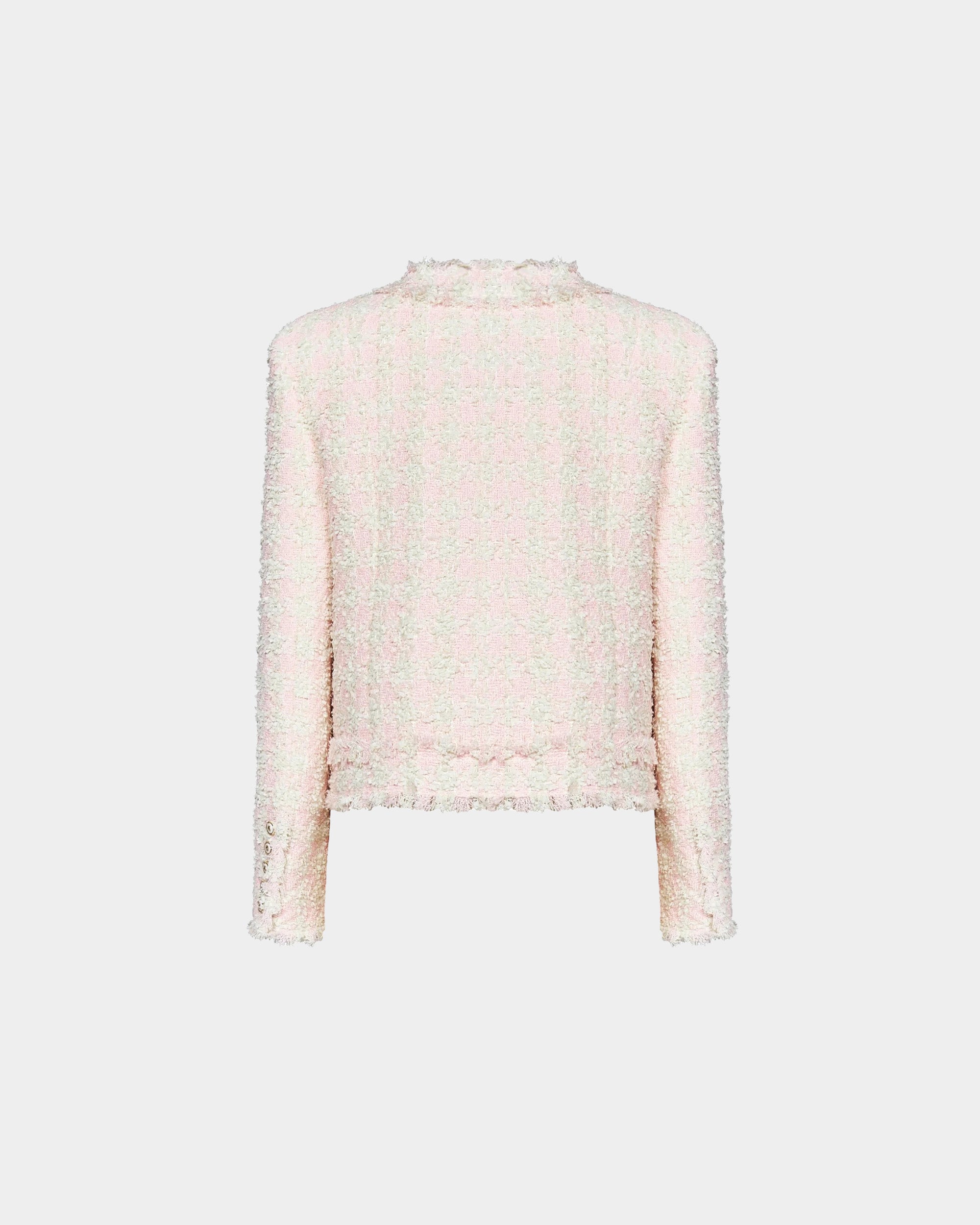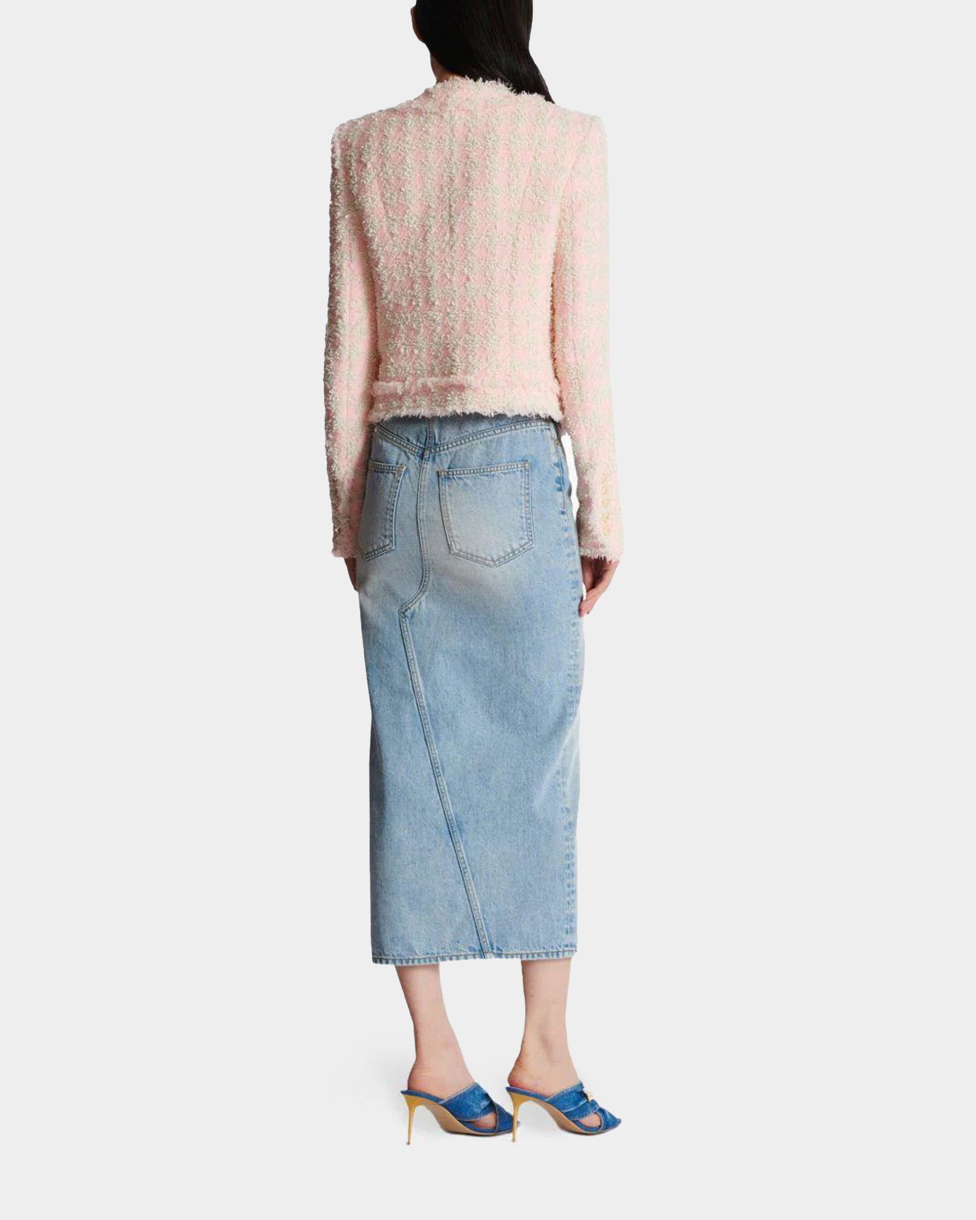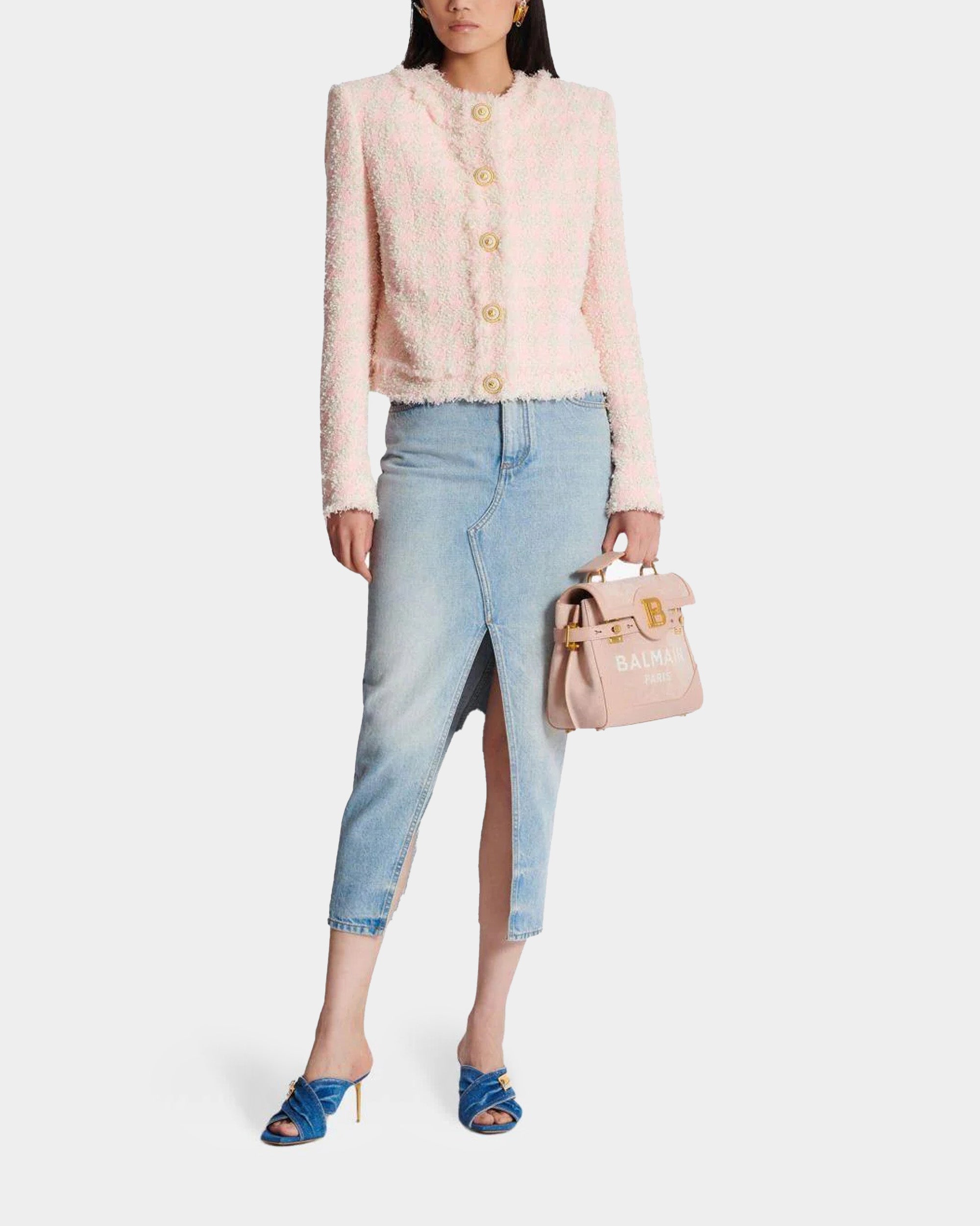 經典Balmain剪裁打造,這款粉色棉質混紡粗花呢外套設計具備直筒版型、五金雙色Leo釦飾、立體肩線與毛邊收尾細節,展現品牌優雅中帶點個性的風格特色。