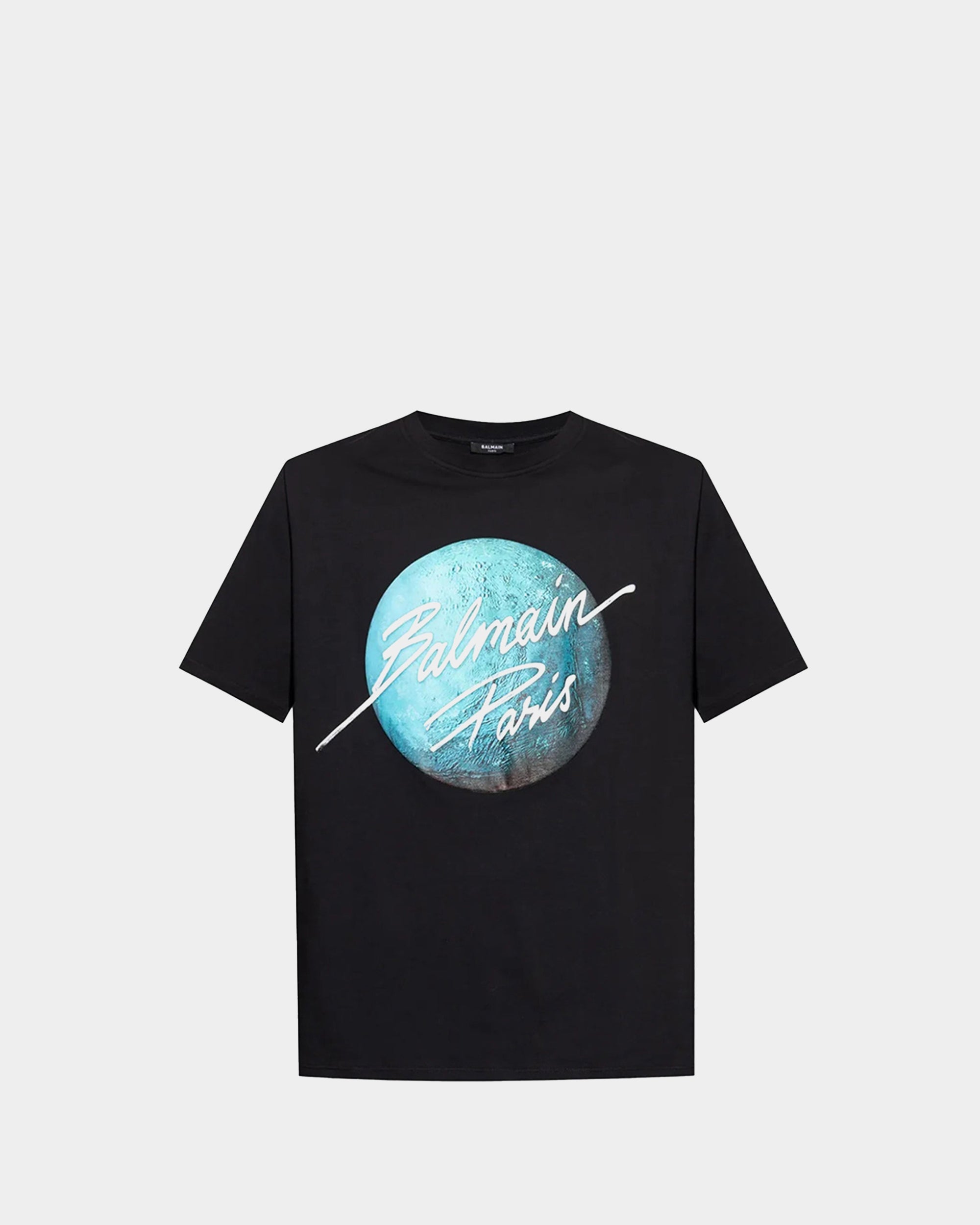 Balmain Paris 字樣搭配藍色星球印花設計,展現潮流宇宙主題,適合日常穿搭與街頭造型。