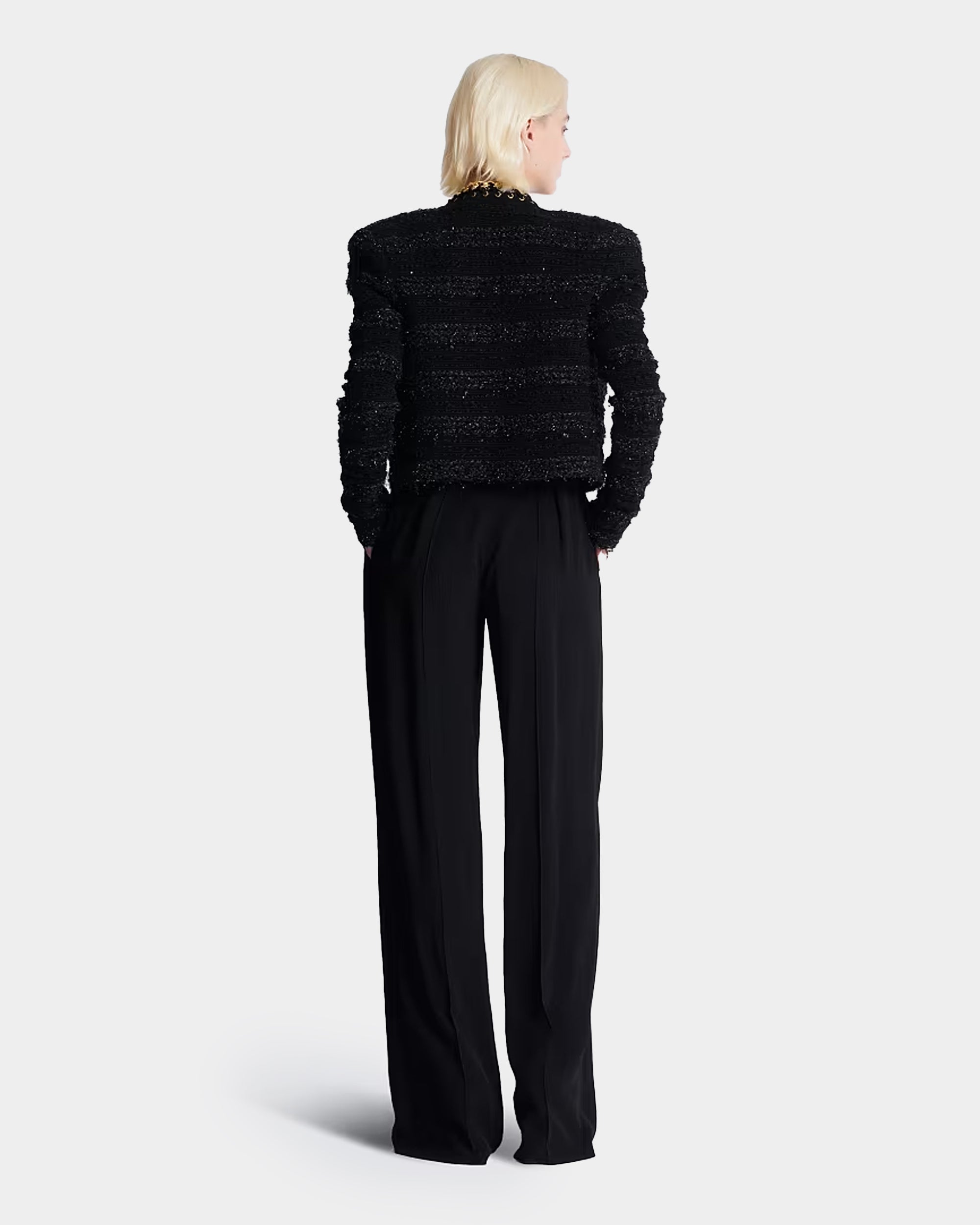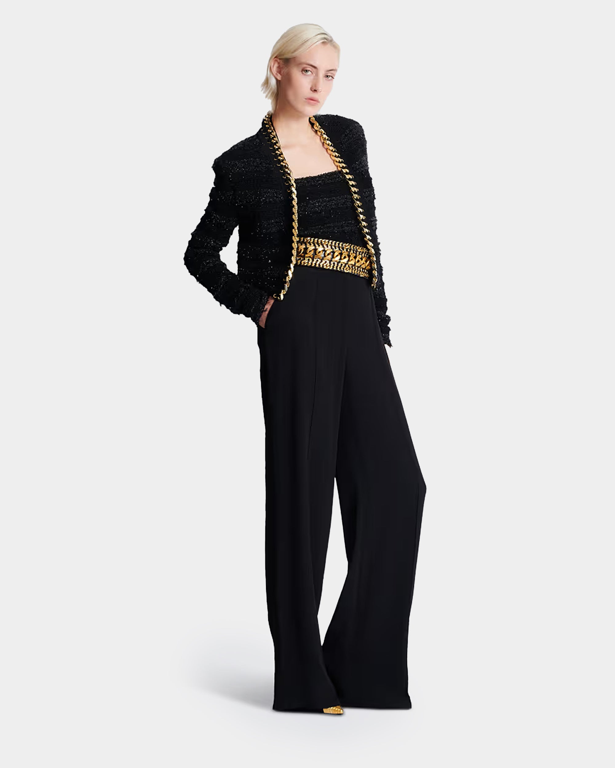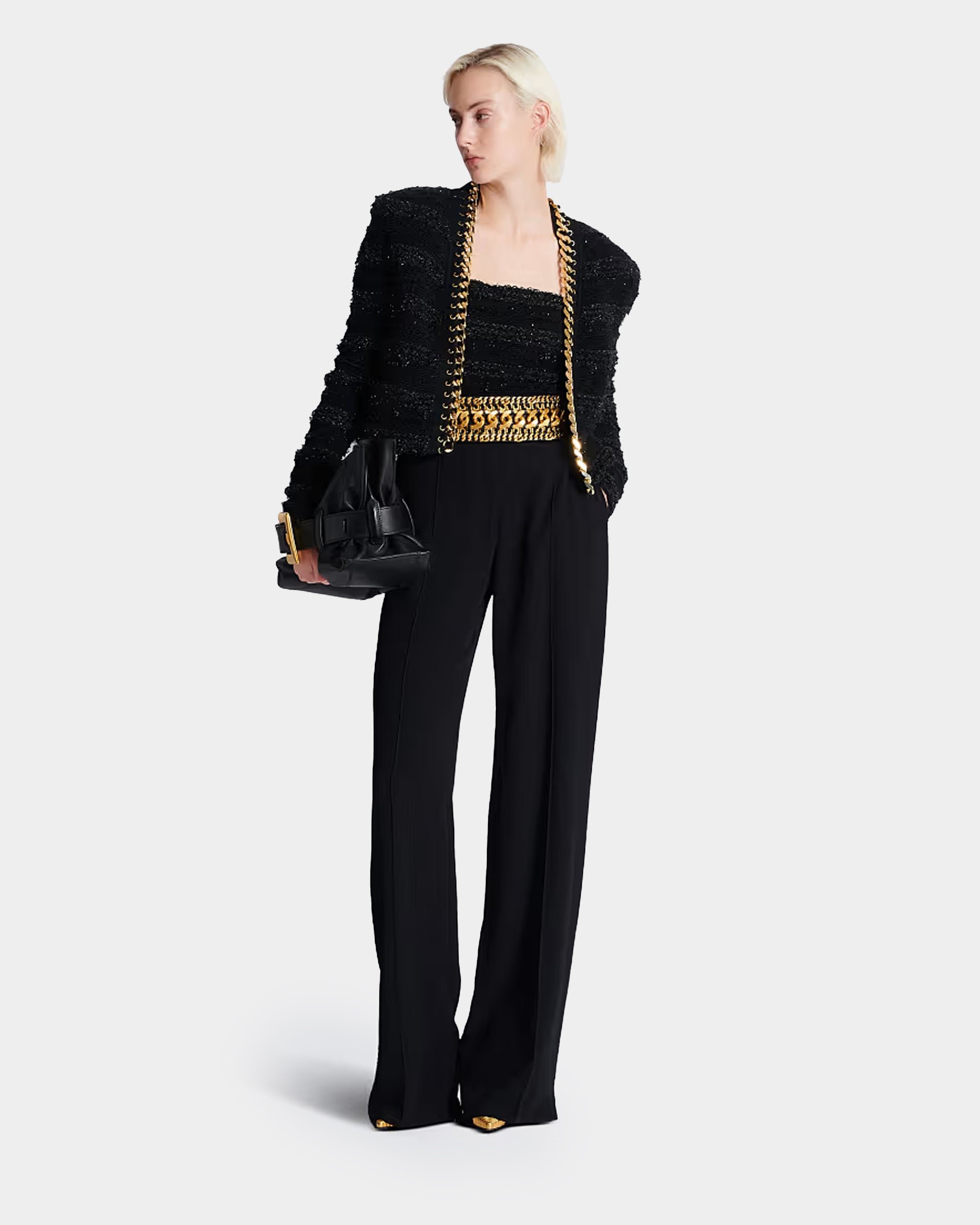 以經典女強人輪廓為靈感,打造這款結構感針織外套。以仿粗花呢質感針織面料呈現立體層次,沿門襟飾以奢華編織金屬鍊條與鉚釘眼孔細節,展現剛柔並濟的品牌精神。無領設計營造俐落現代感,搭配裙裝或褲裝皆能展現強大氣場。