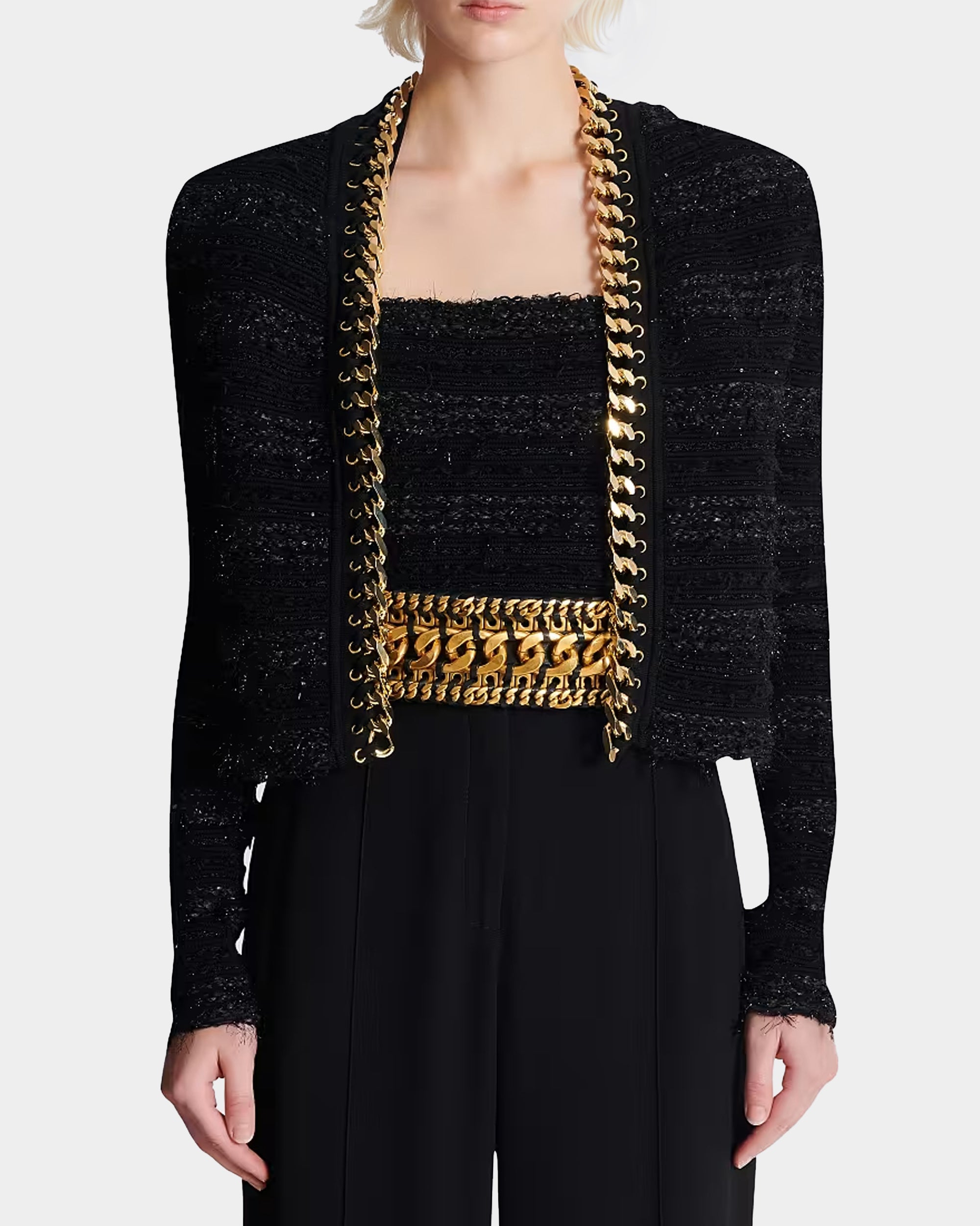 BALMAIN 金鍊滾邊無領毛呢針織外套