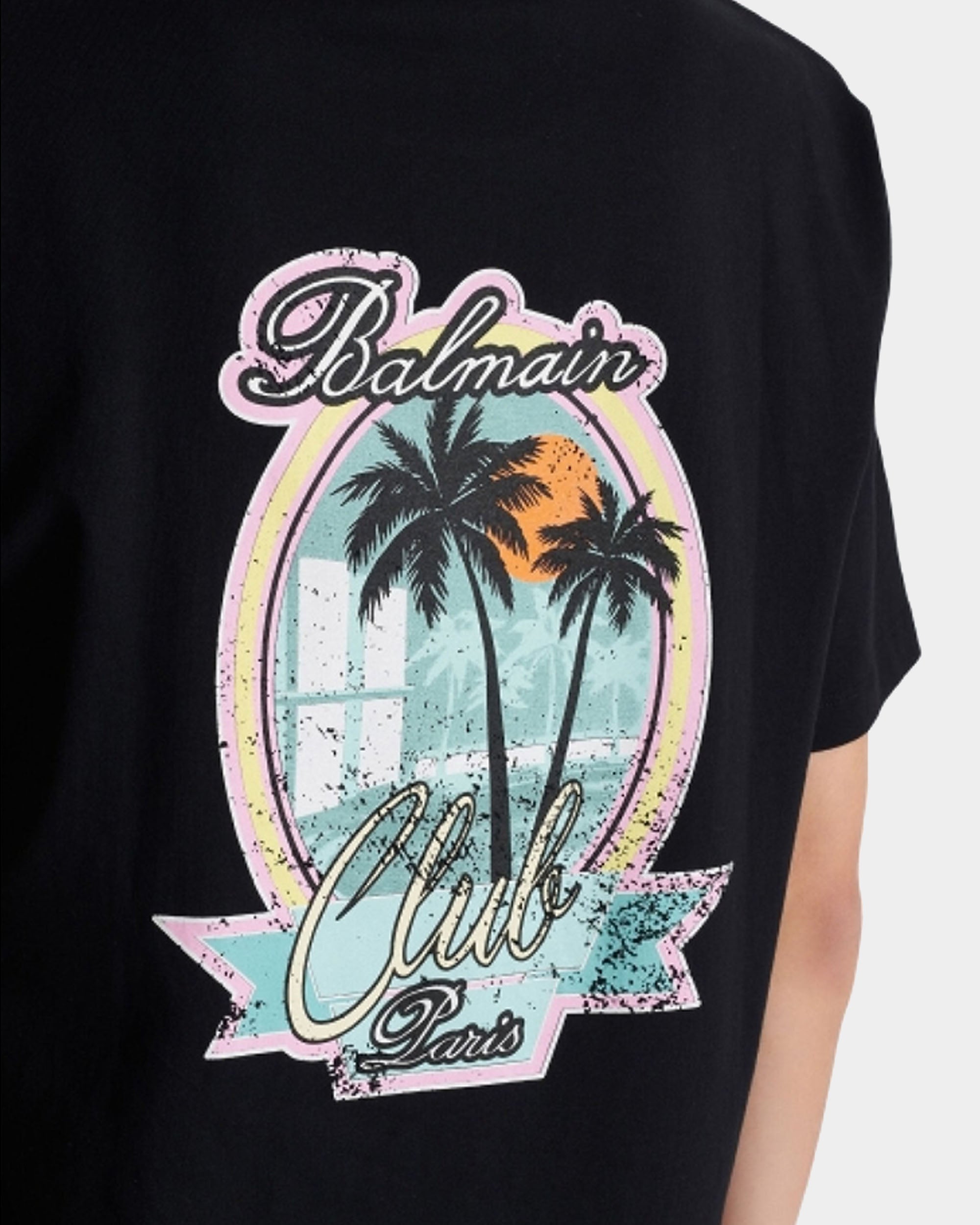 採用直筒剪裁與柔軟純棉布料,前胸以精緻棕櫚樹與品牌標誌圖騰點綴,展現輕鬆奢華風格。背後則印有 BALMAIN CLUB 藝術風格字樣,為簡約外型增添細節亮點。清新白色調,適合日常穿搭或夏日度假造型。
