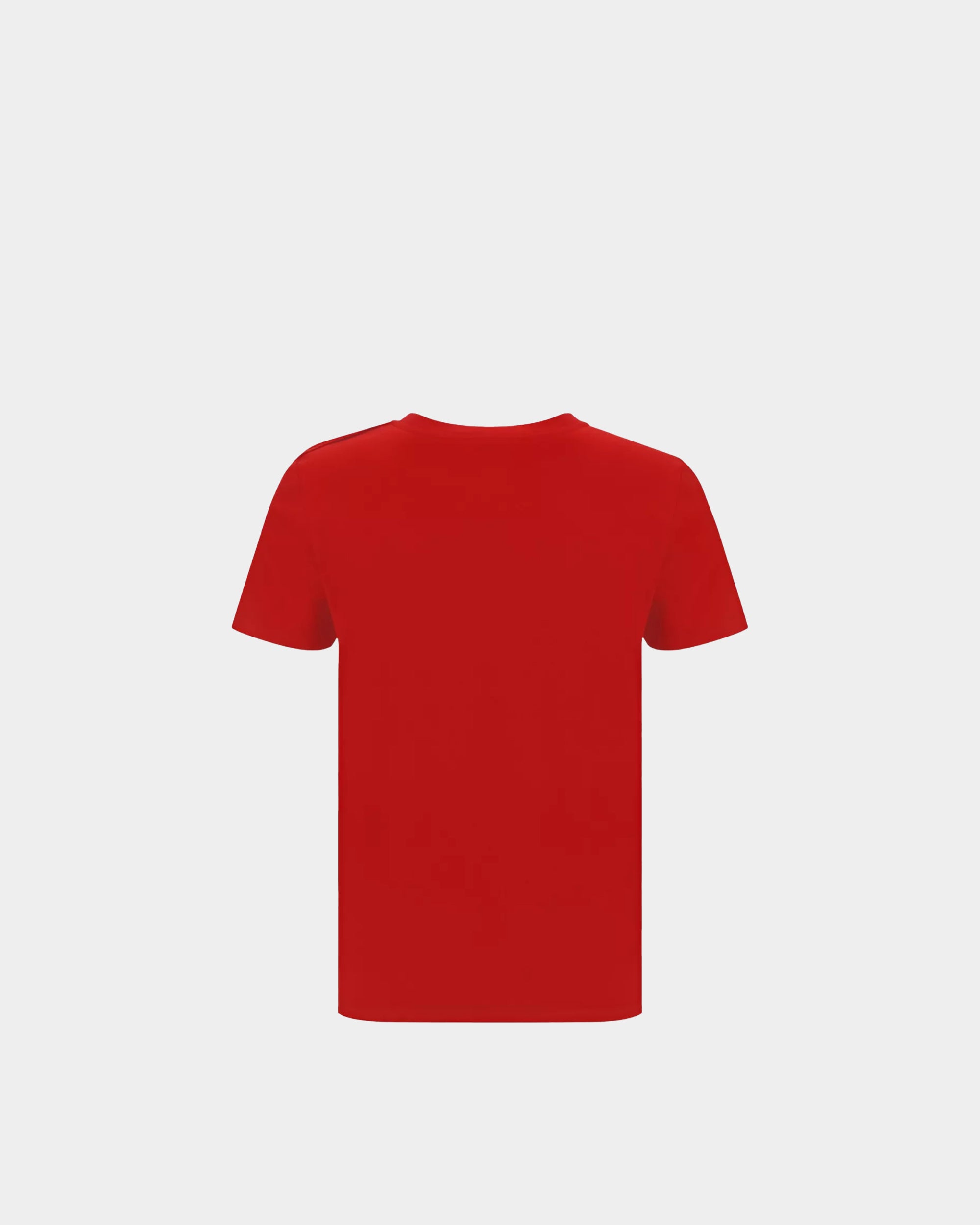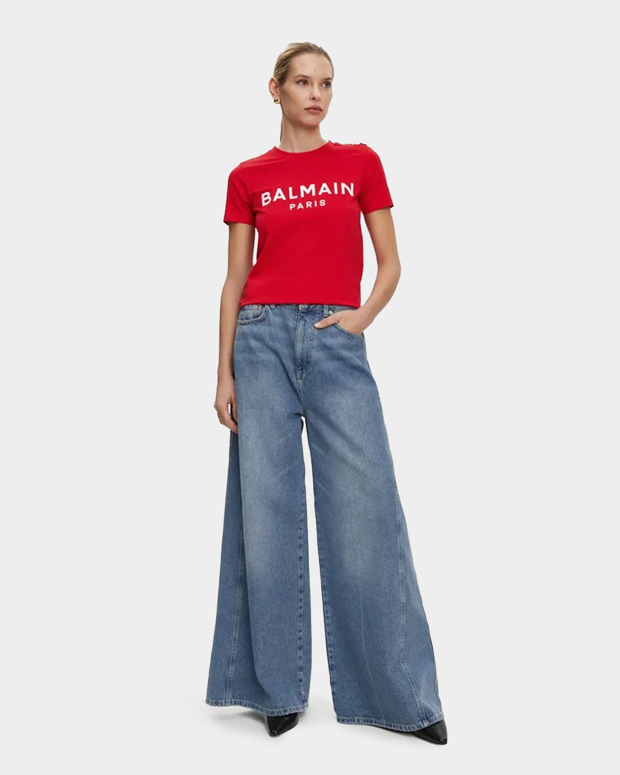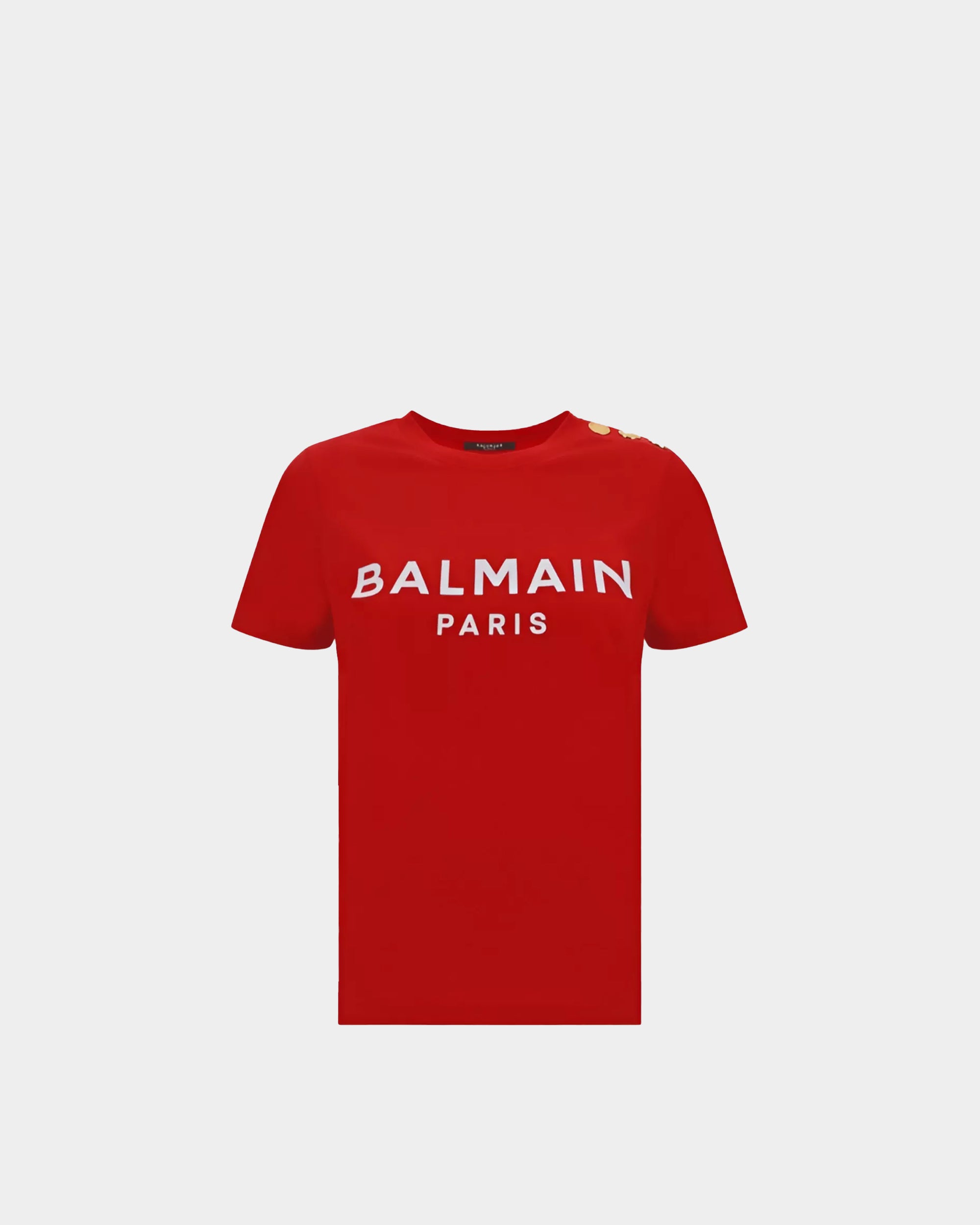 胸前印有醒目的 BALMAIN PARIS 白色品牌字樣,左肩飾以標誌性的金色金屬飾釦,展現品牌辨識度與時尚態度。紅色鮮明吸睛,為日常穿搭注入高級感與活力風格。