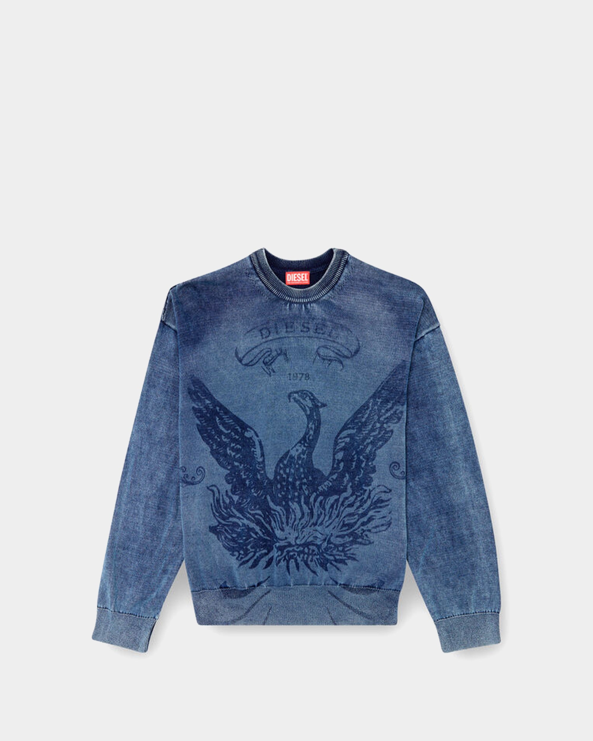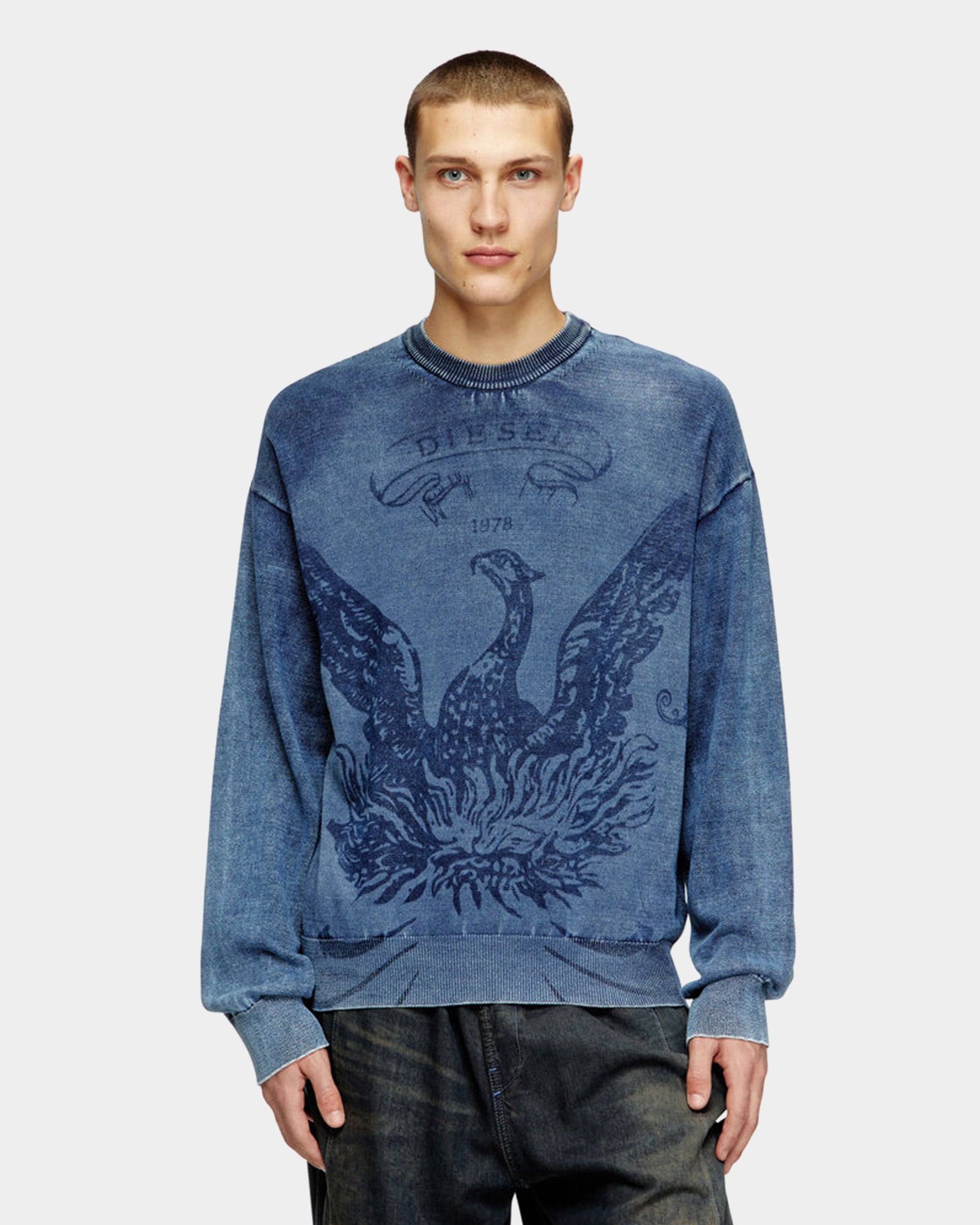 設計靈感來自 Diesel 的 DNA 布料——牛仔布,以 真實靛藍染色並經石磨洗水處理,營造出自然褪色的藍色調。胸前運用激光雕刻技術,呈現 鳳凰圖騰與「1978」字樣,展現品牌獨特視覺語言。