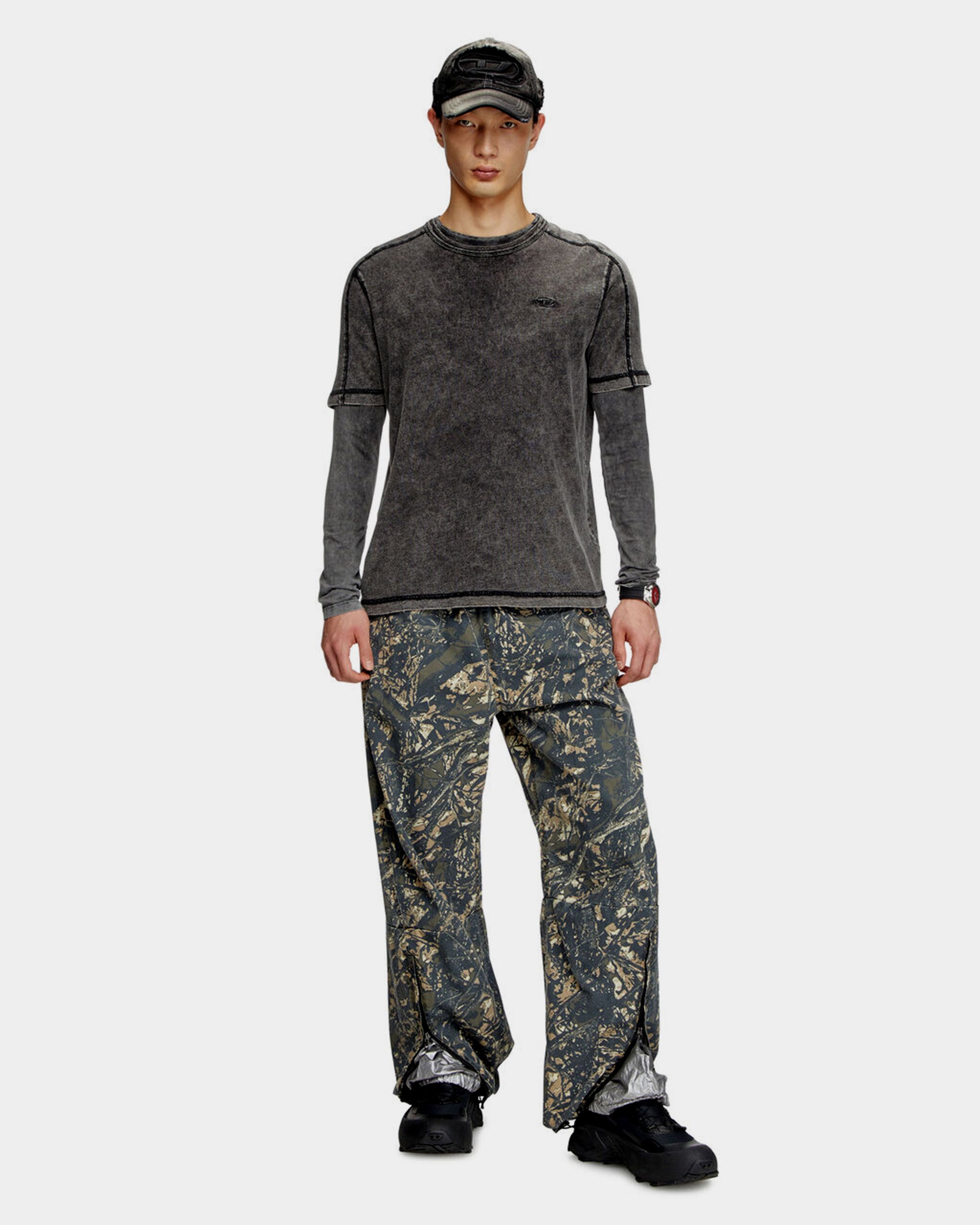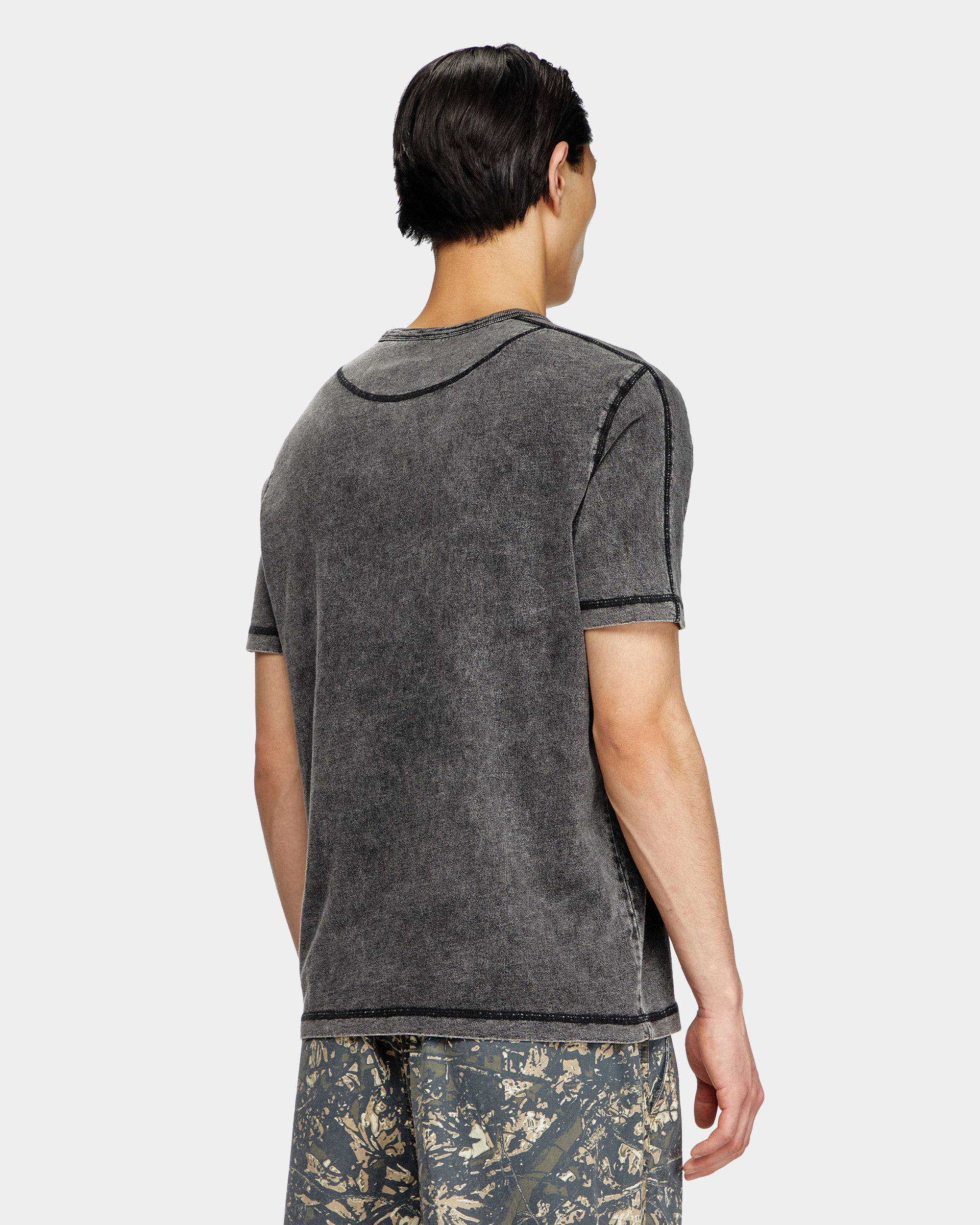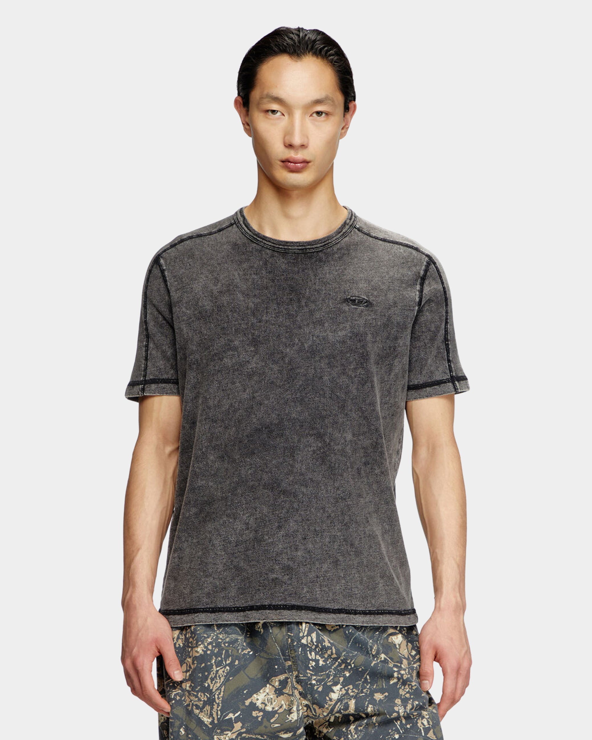 採 100% 棉柔軟針織布料,表面經特殊大理石洗水處理呈現牛仔質感與個性刷舊風,縫線採同色覆縫設計突顯做工。左胸繡有同色調的 Diesel 「D」標誌,增加品牌識別感,整體為 regular fit 標準版型。