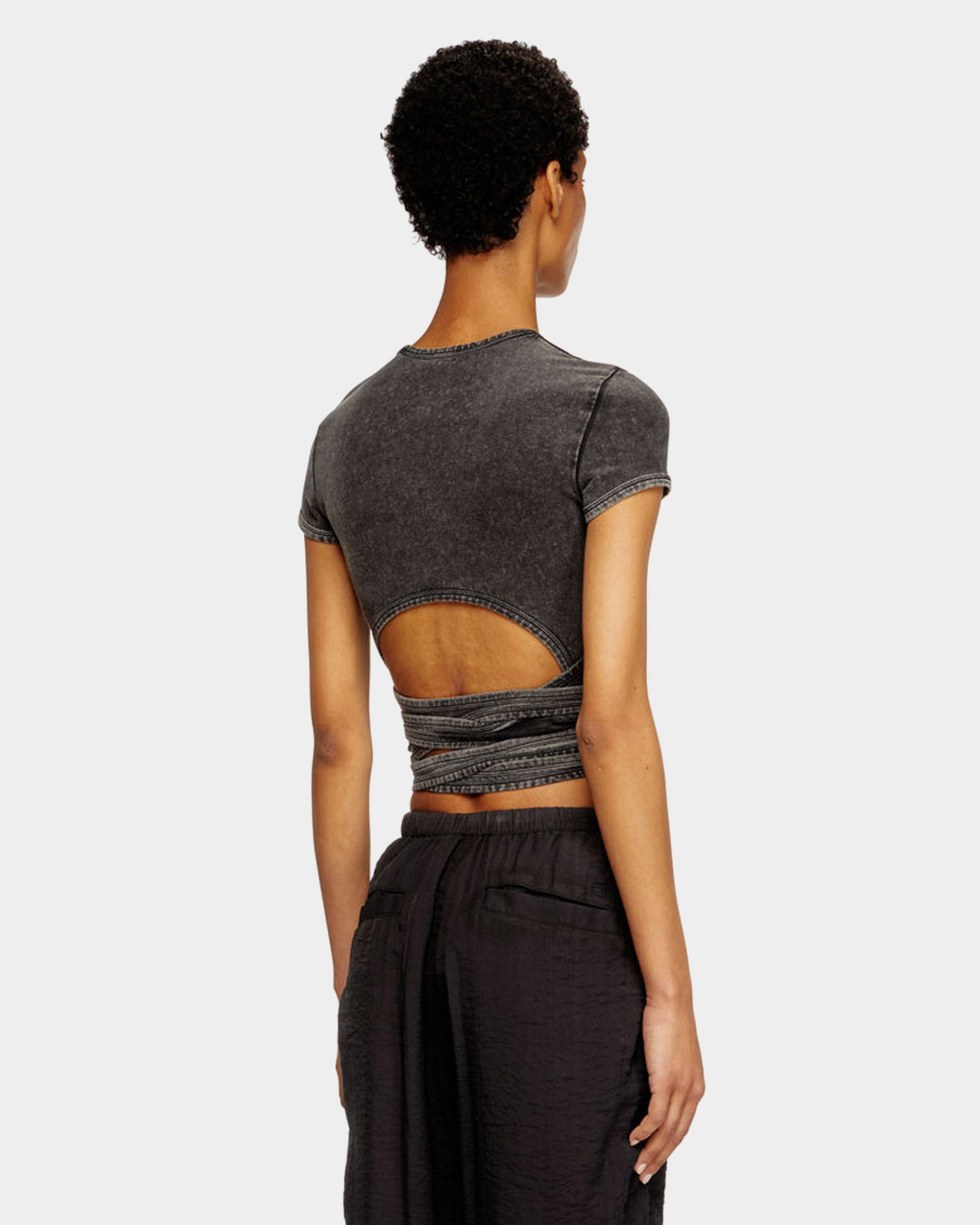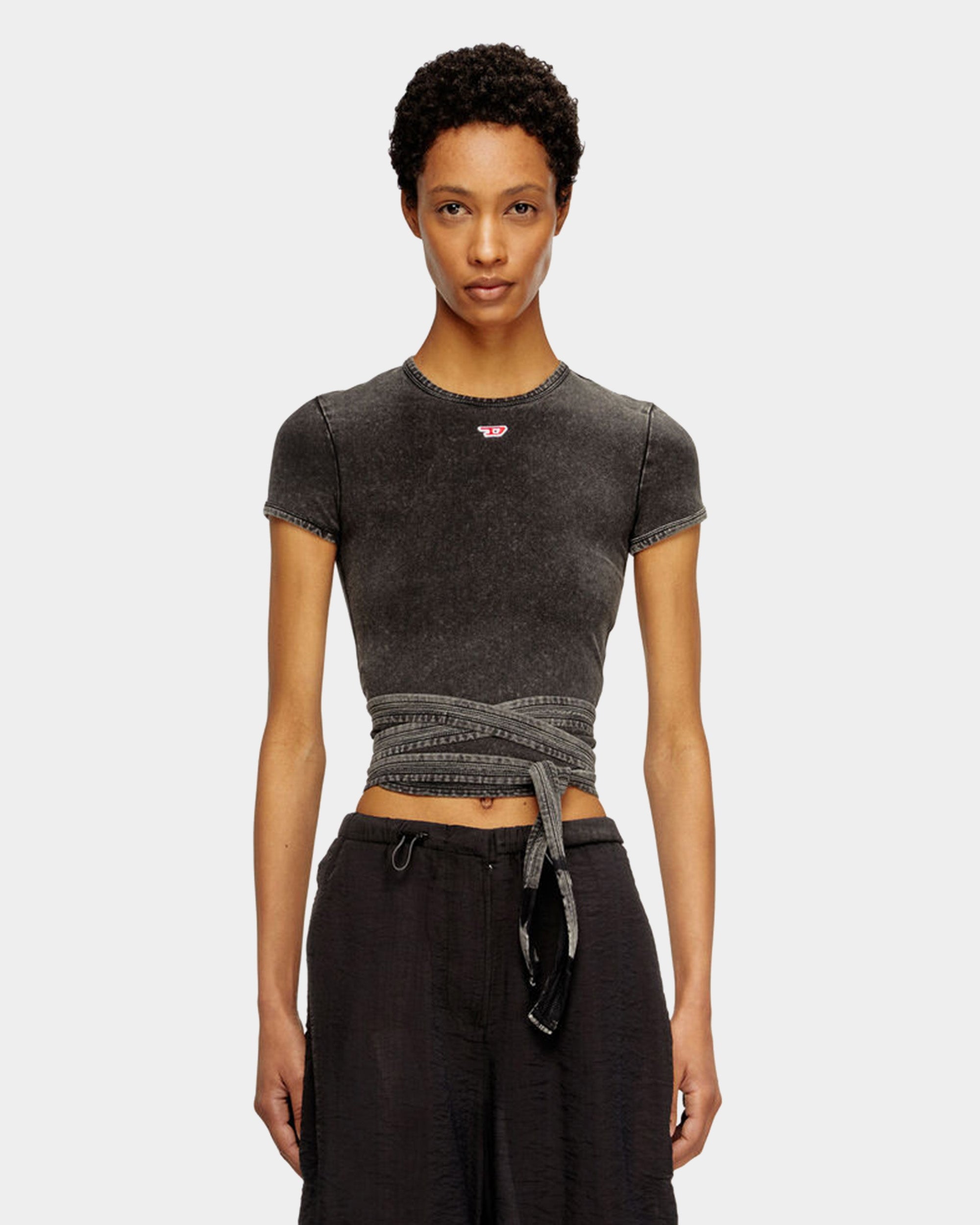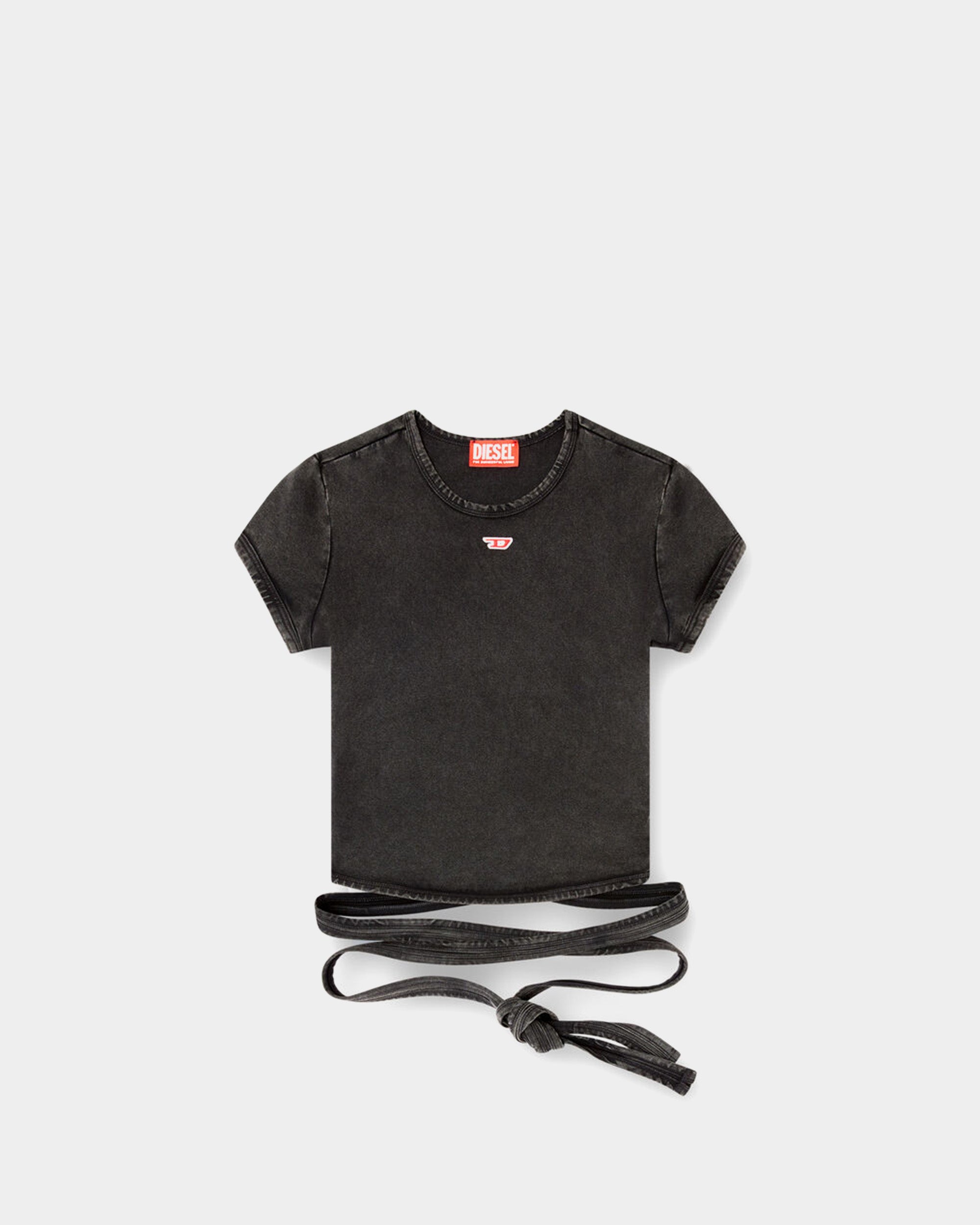 採用 93% 有機棉與 7% 彈性纖維混紡材質,呈現修身版型。全身印有仿舊牛仔布效果,展現復古風格。設計上採用圓領與短袖設計,搭配側邊縫線細節,增添層次感。左側下擺處點綴品牌標誌,彰顯品牌特色。