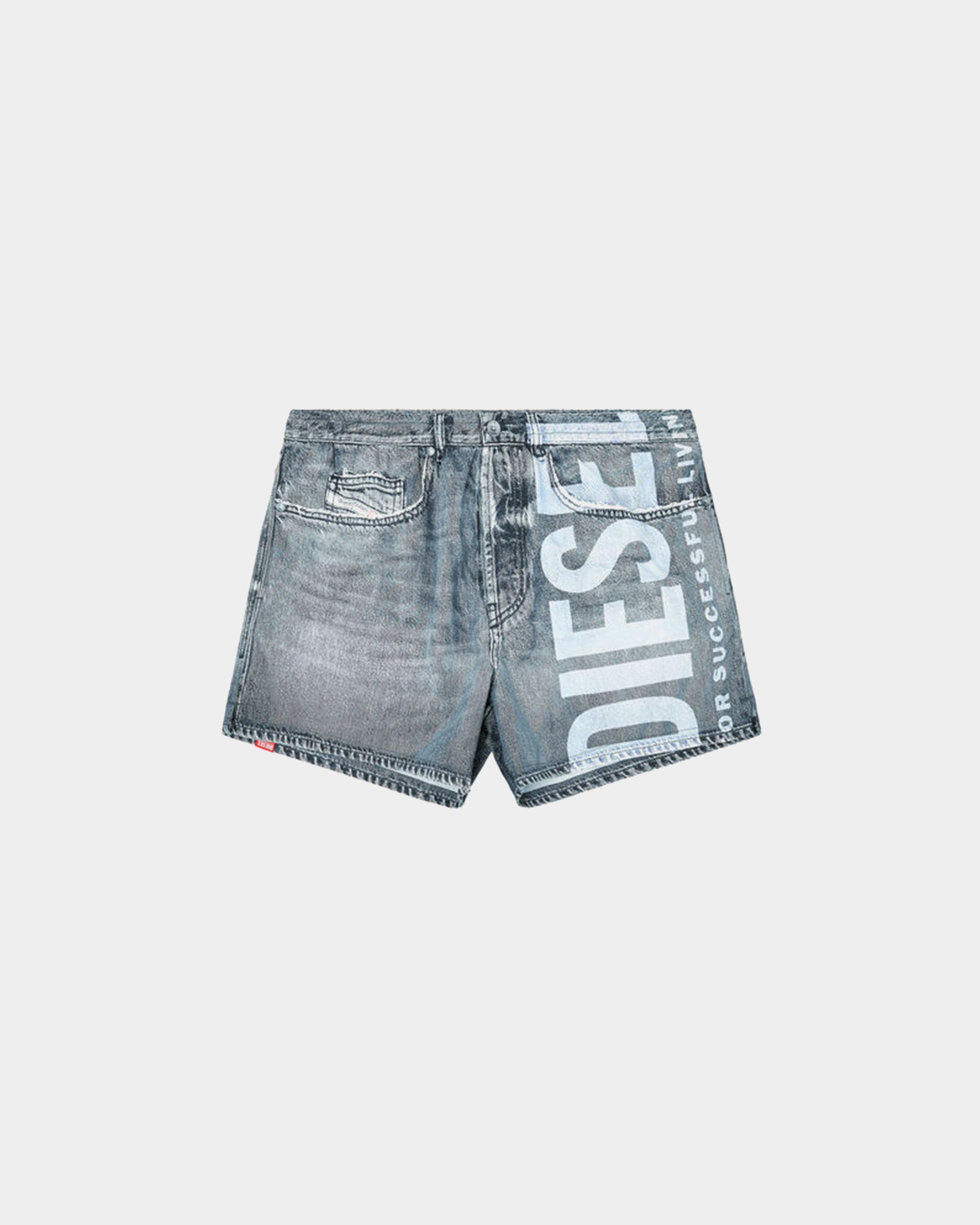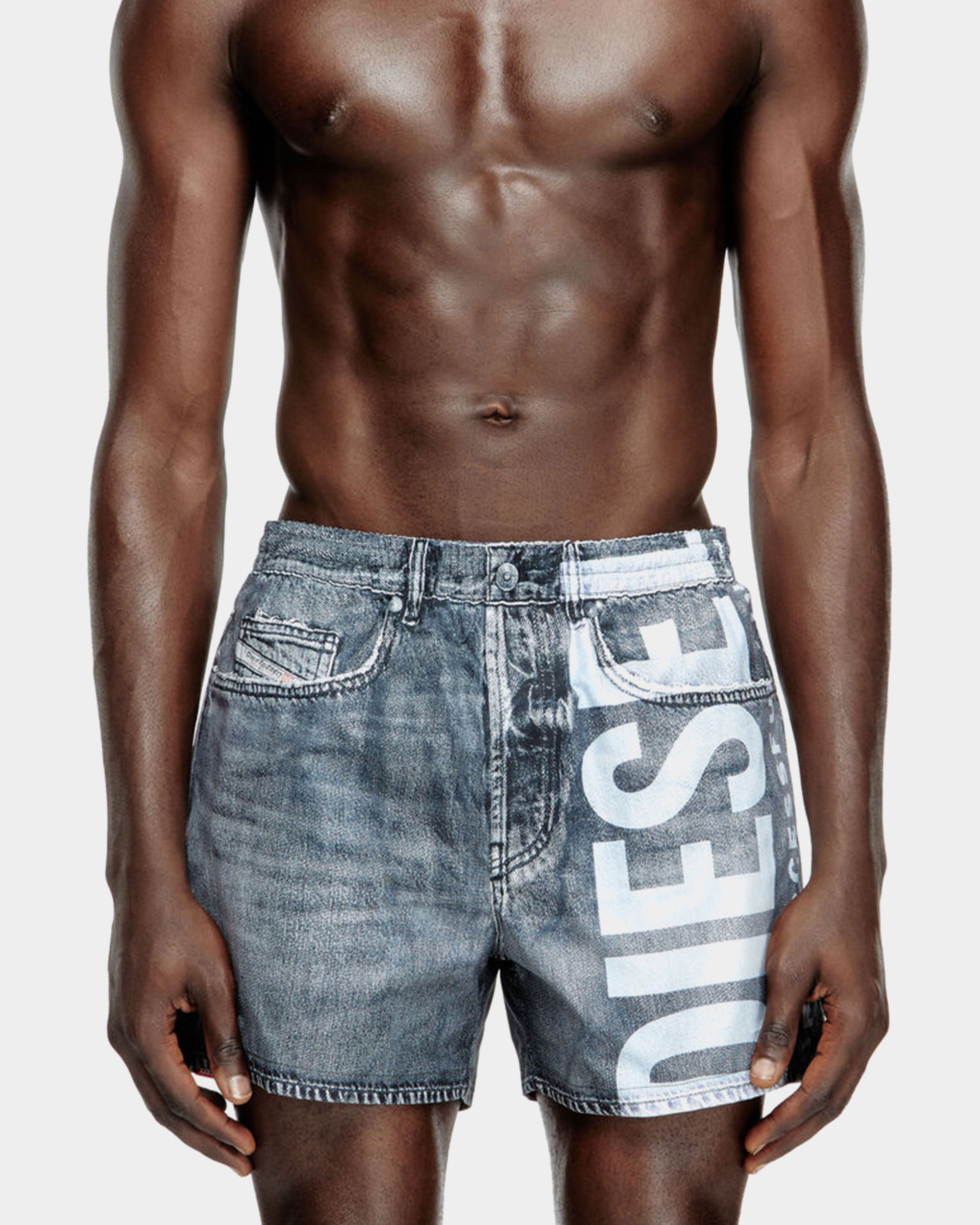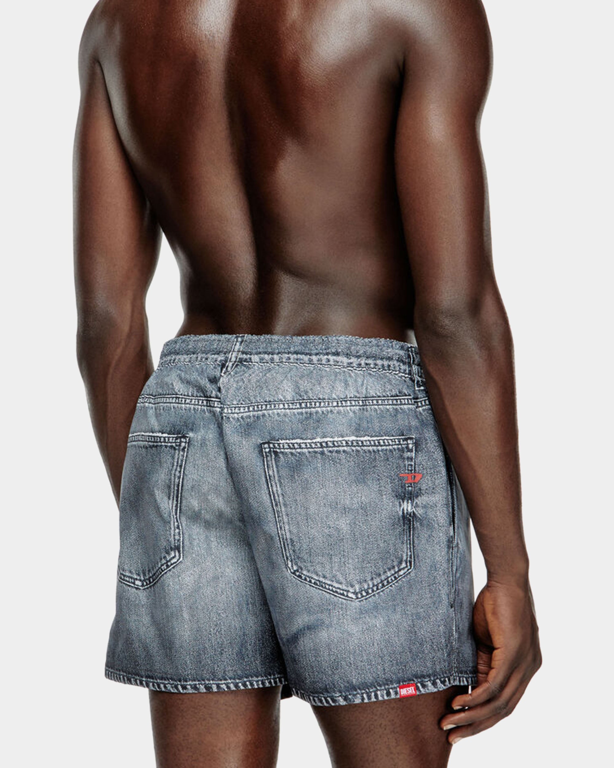 以假牛仔布設計為特色,外觀模仿牛仔短褲,並印有醒目的 DIESEL 標誌,展現品牌個性。採用輕盈的再生聚酯材質,內襯為彈性再生布料,提供舒適的穿著體驗。