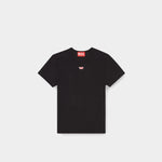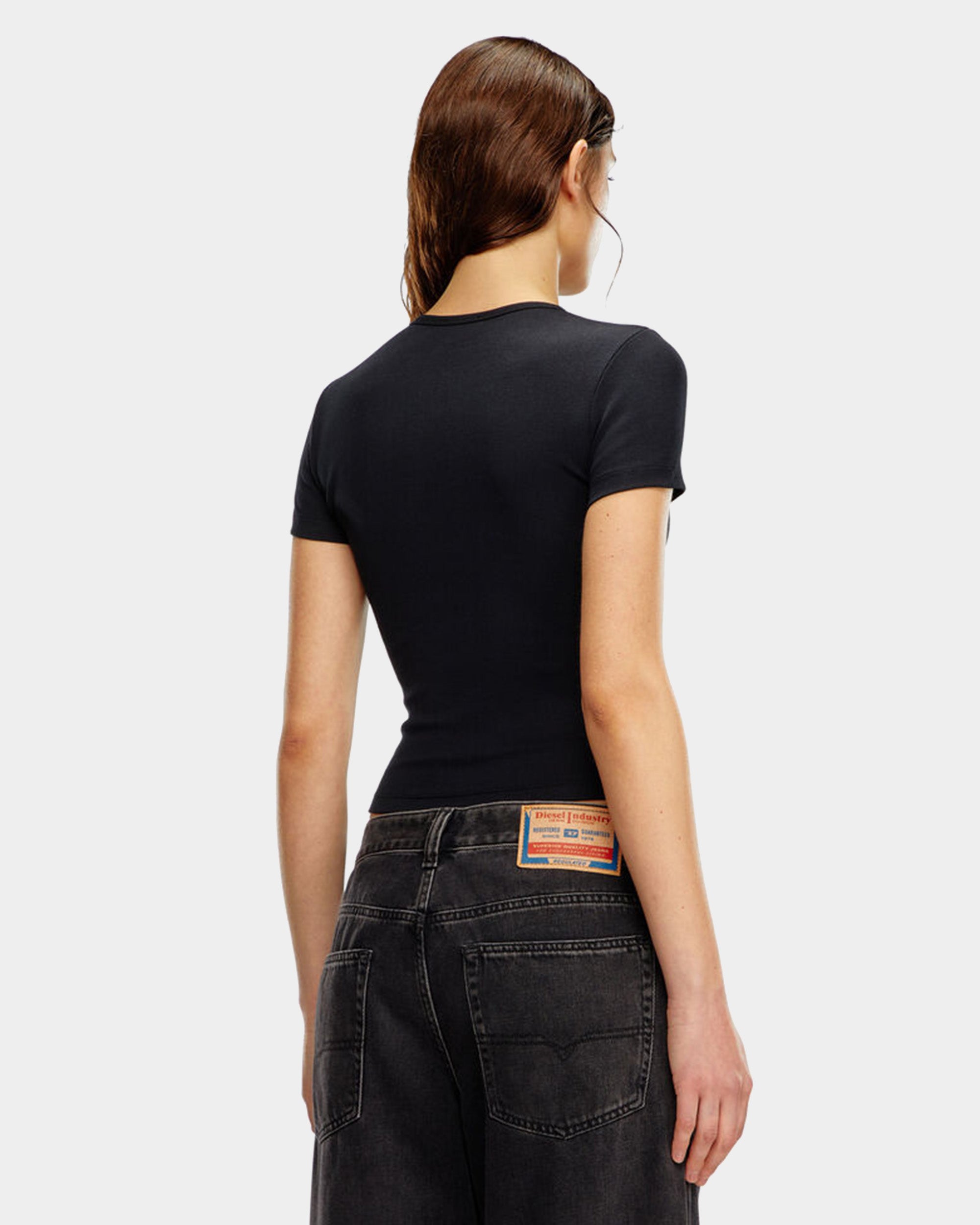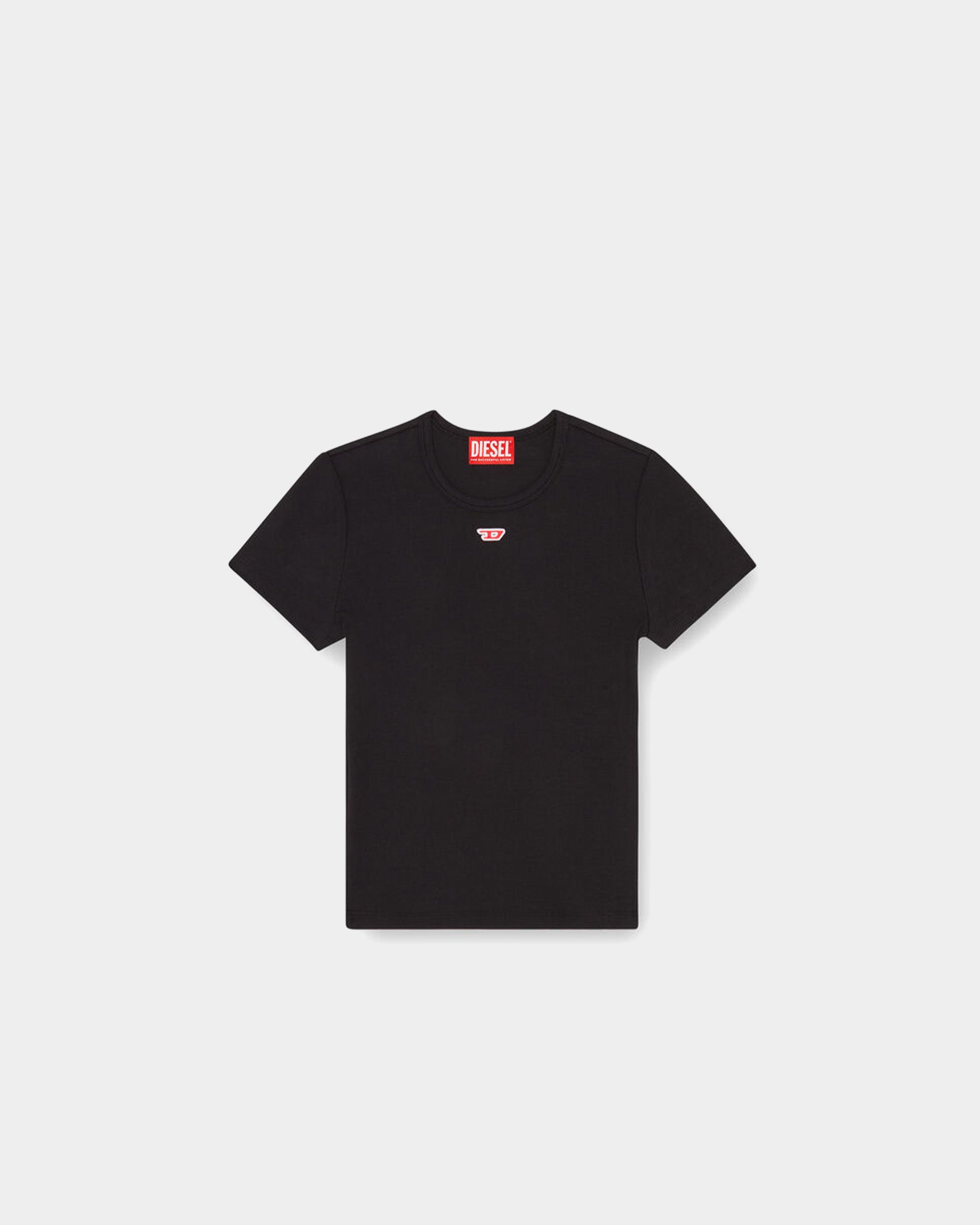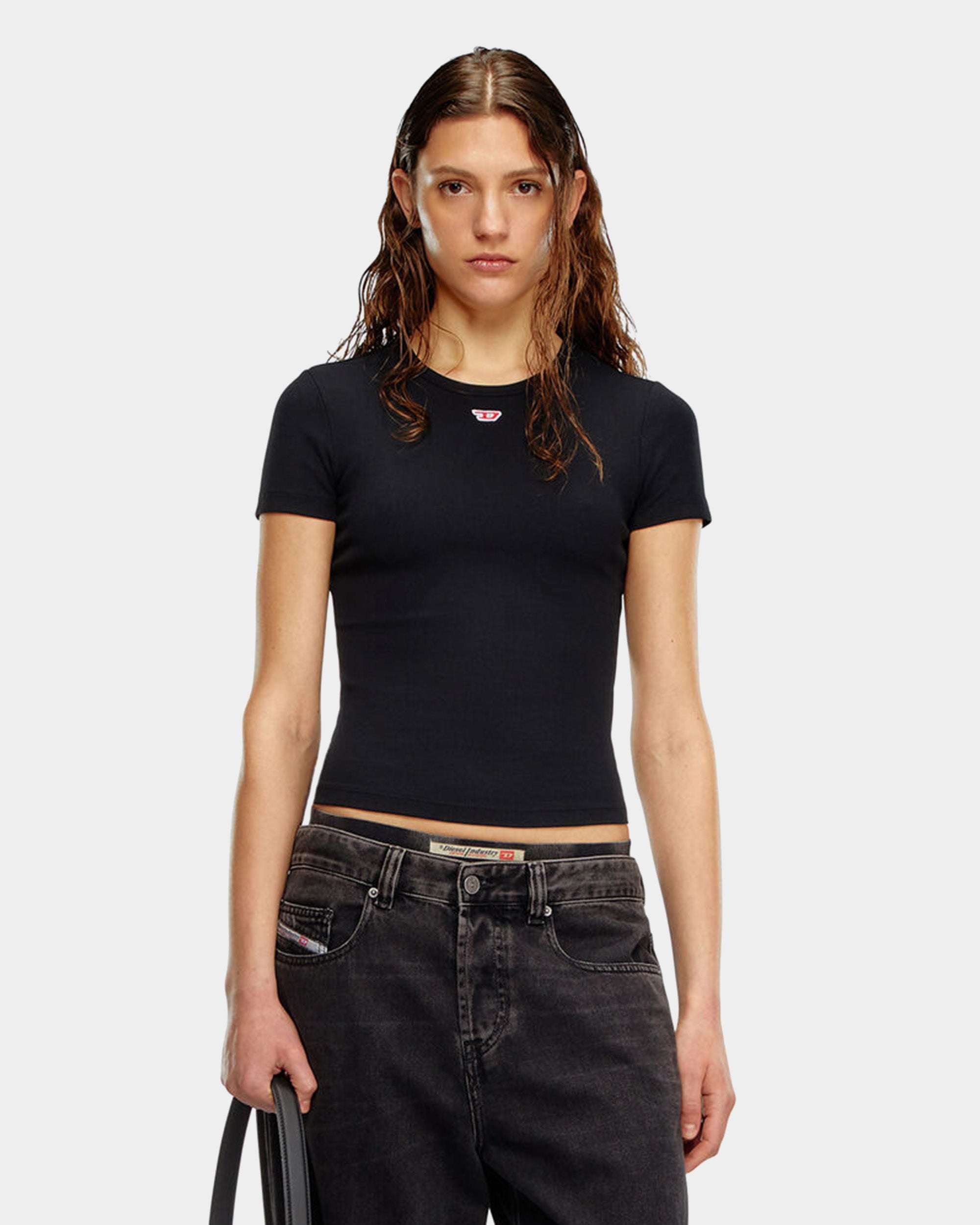 這款女性修身版型圓領 T 恤,採用 94% 有機棉與 6% 彈性纖維混紡,具有細緻的羅紋質地。胸前僅以小型刺繡 D 字母標誌點綴,展現品牌特色。