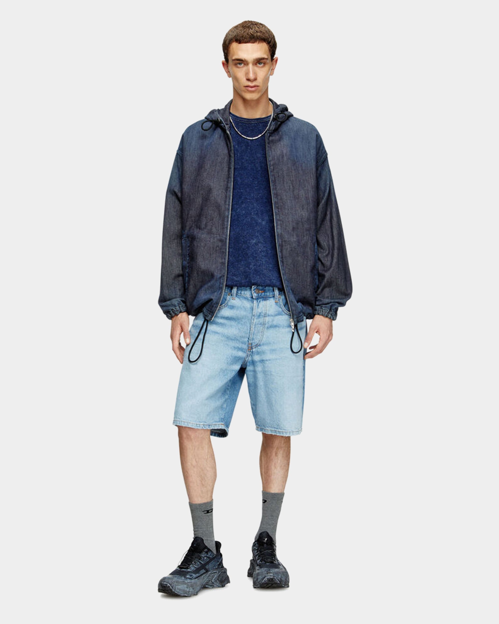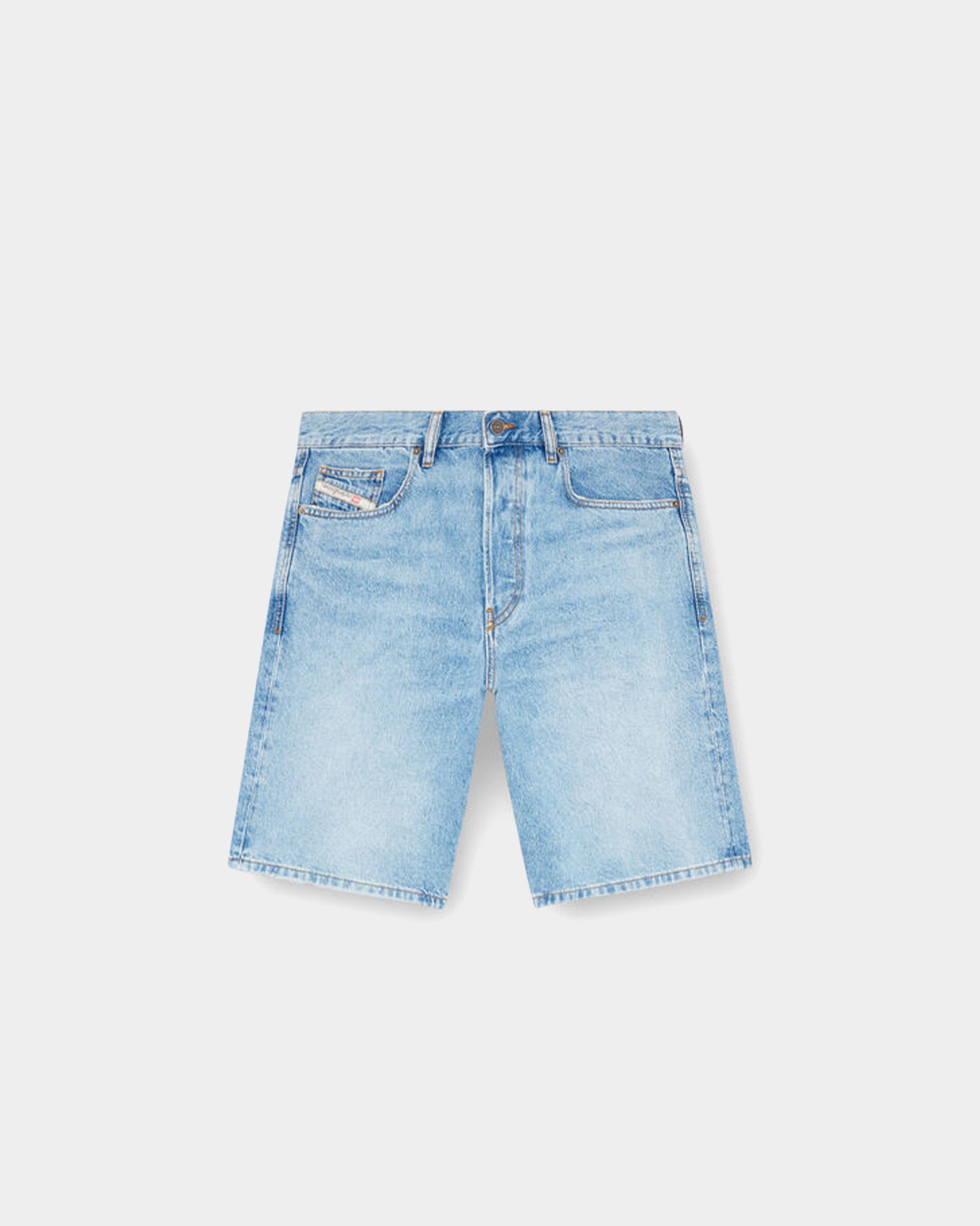 採用淺藍色固定丹寧布料,呈現經典的五口袋設計,搭配正面鈕扣與拉鍊開合,腰部設有皮帶環,後方飾有品牌標誌皮革貼片,展現品牌特色。