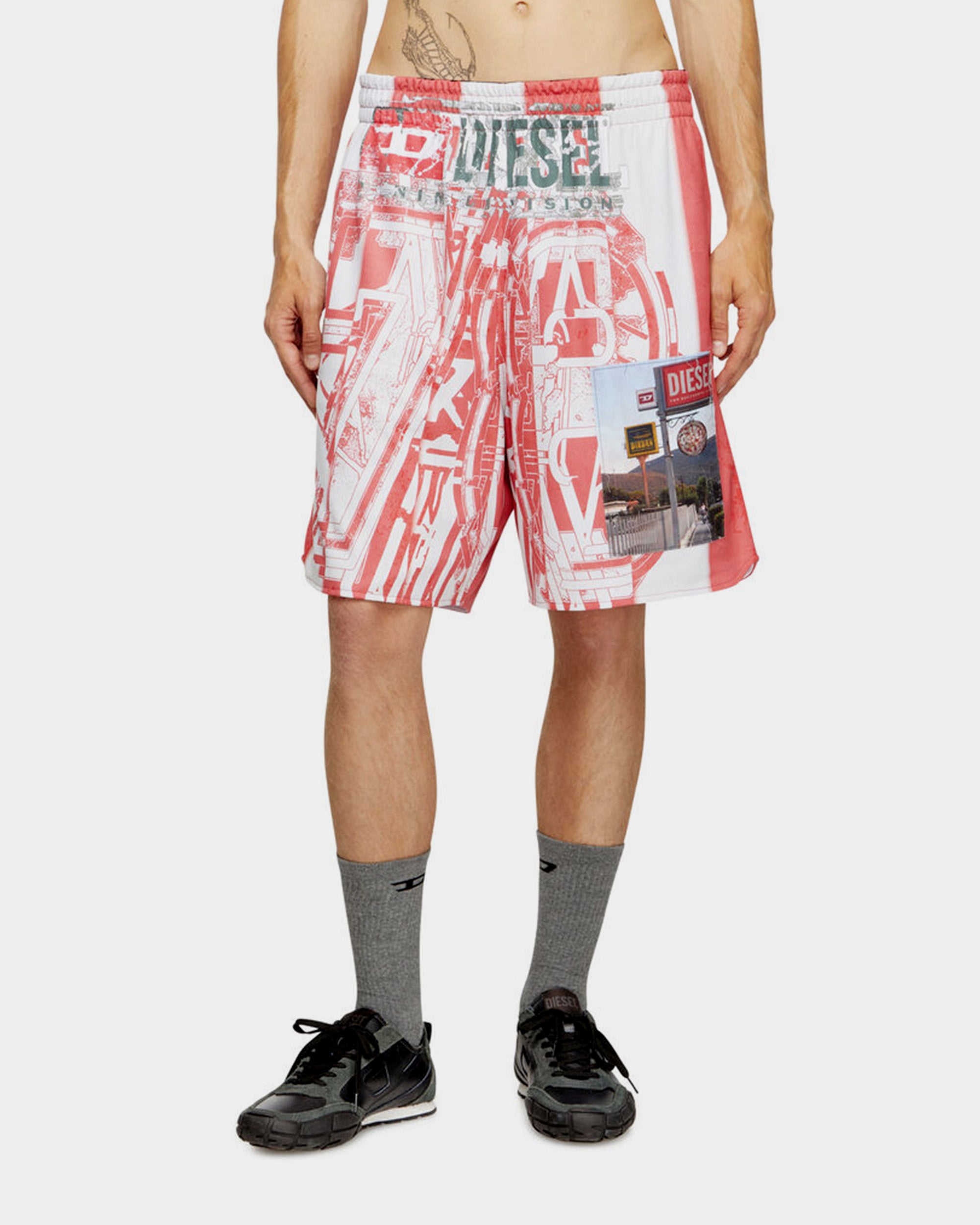 這款短褲採用 100% 聚酯纖維製成,正面印有 stylized 78 字樣,並搭配高真實感的照片拼貼,展現出品牌獨特的設計風格。設計上融合了復古足球裝元素,如拉繩鬆緊腰頭、側邊口袋和背部貼袋,提供實用性與舒適感。適合日常穿搭或休閒場合,展現出獨特的個人風格。