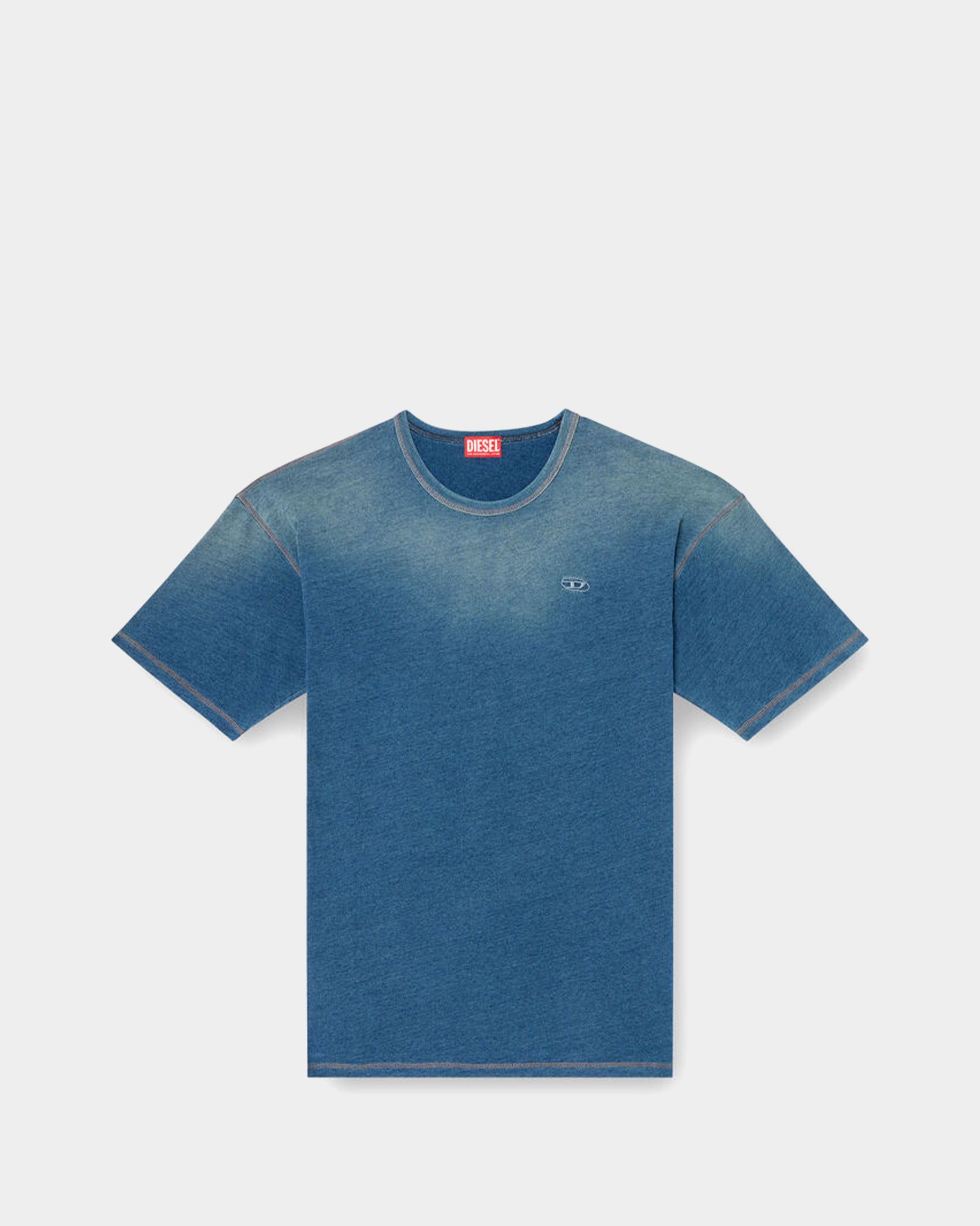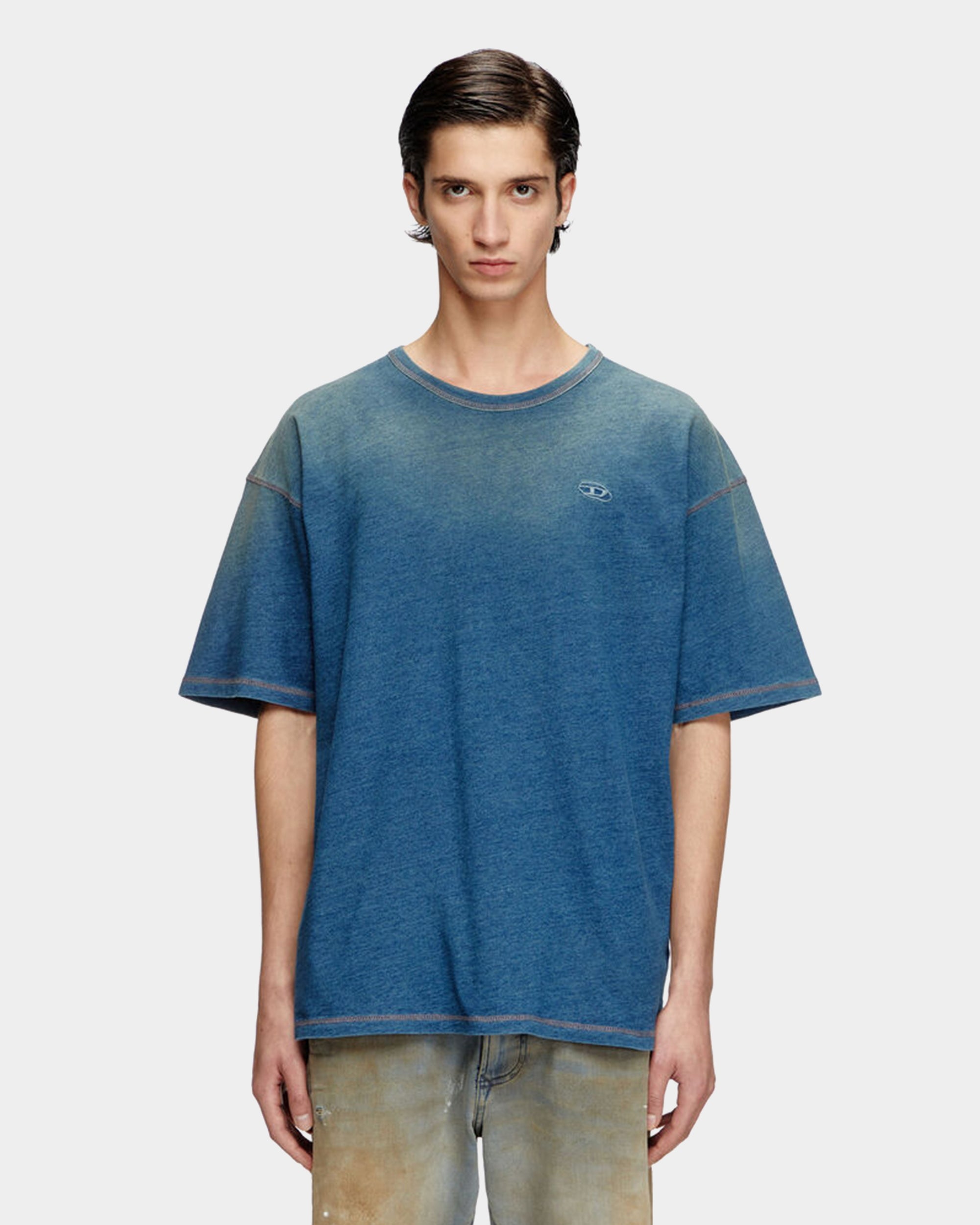 噴染工藝在肩膀至胸口呈現自然漸層「日曬」效果;寬鬆落肩剪裁搭配經典圓領,增添輕鬆休閒感;胸前配有低調刺繡 Diesel 徽標,並以不同色線條縫製呼應整體設計,細節精緻又充滿現代感。