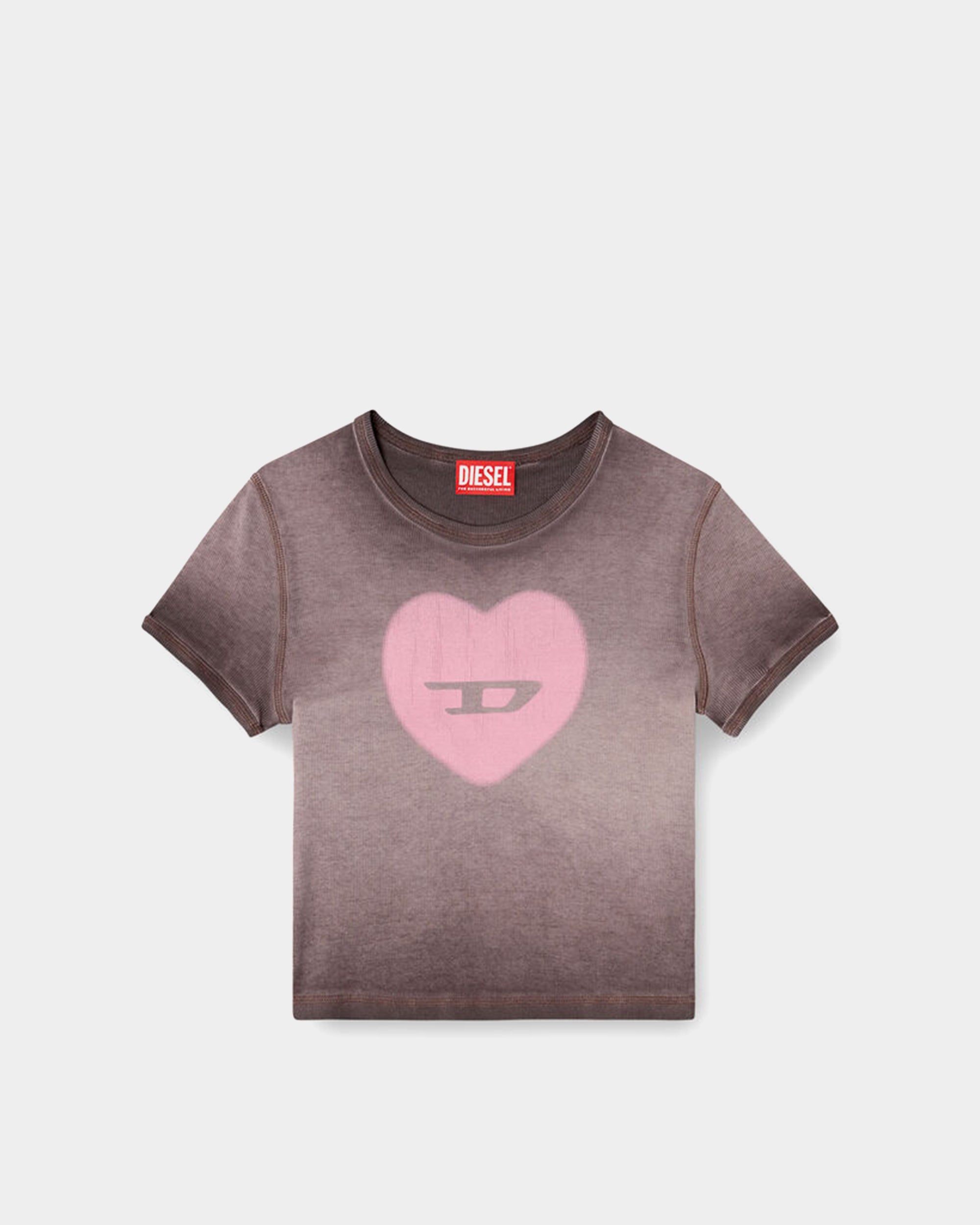 採用96%有機棉與4%彈性纖維混紡材質,呈現修身版型。胸前水彩心形「D」字母印花呈現褪色效果,內側反染營造自然舊感,搭配對比色車縫線增添層次感,完美貼合女性身形。