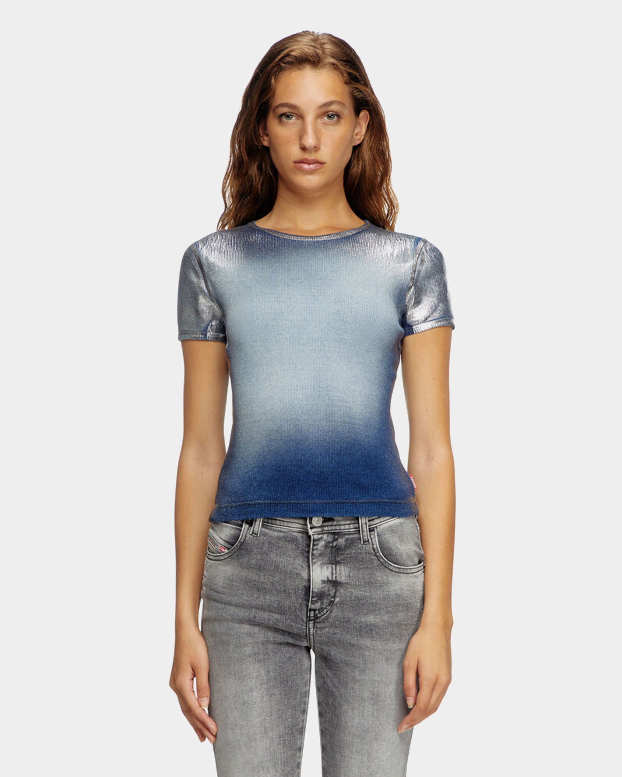 獨特雙重噴漆工藝,打造由淡藍漸變至深藍的層次色調,並透出金屬光澤,強化整體視覺張力與時尚感。面料採用細羅紋彈性棉質,擁有修身剪裁與略短下襬,貼合身形同時保有舒適穿感,展現俐落摩登的都會風格。