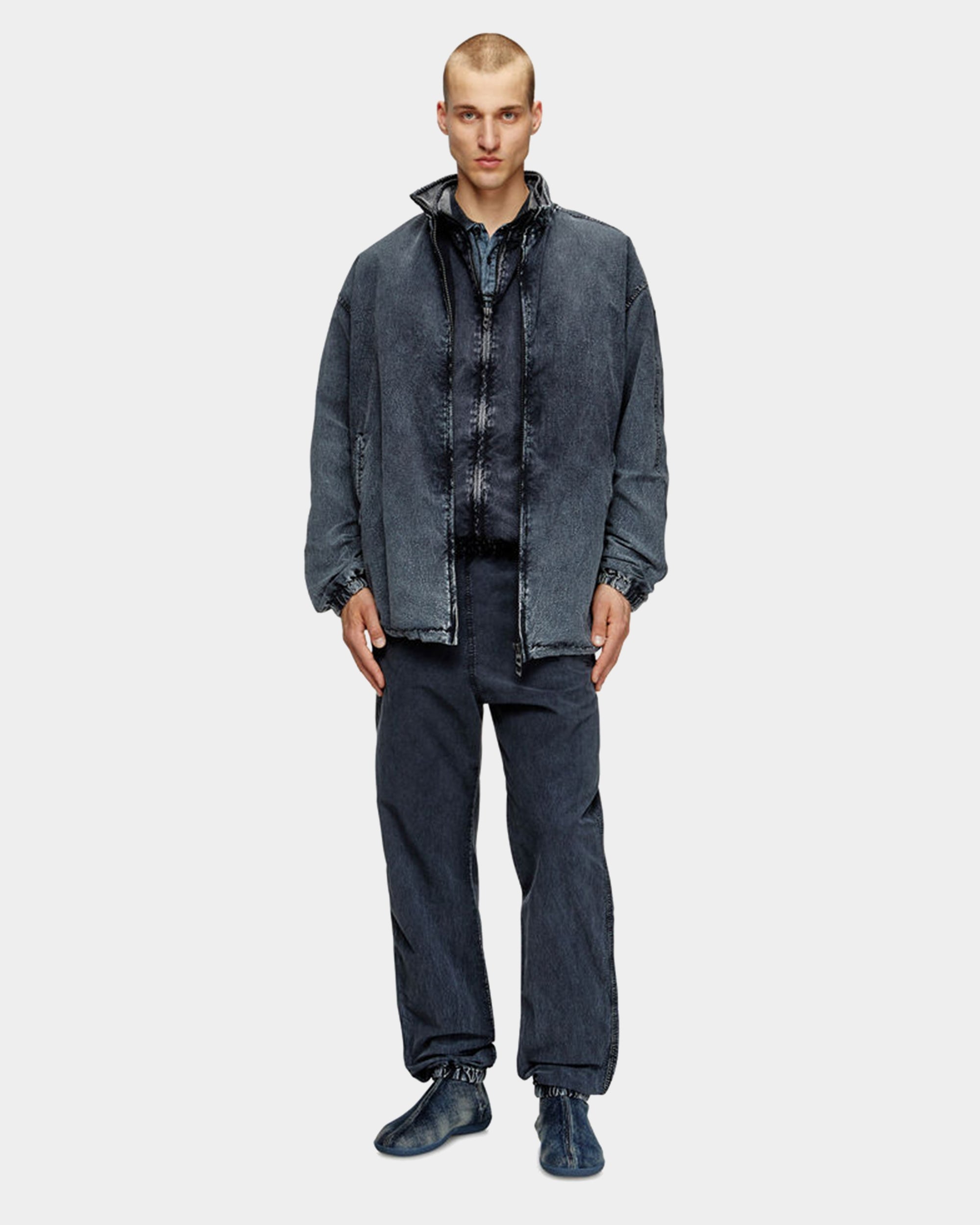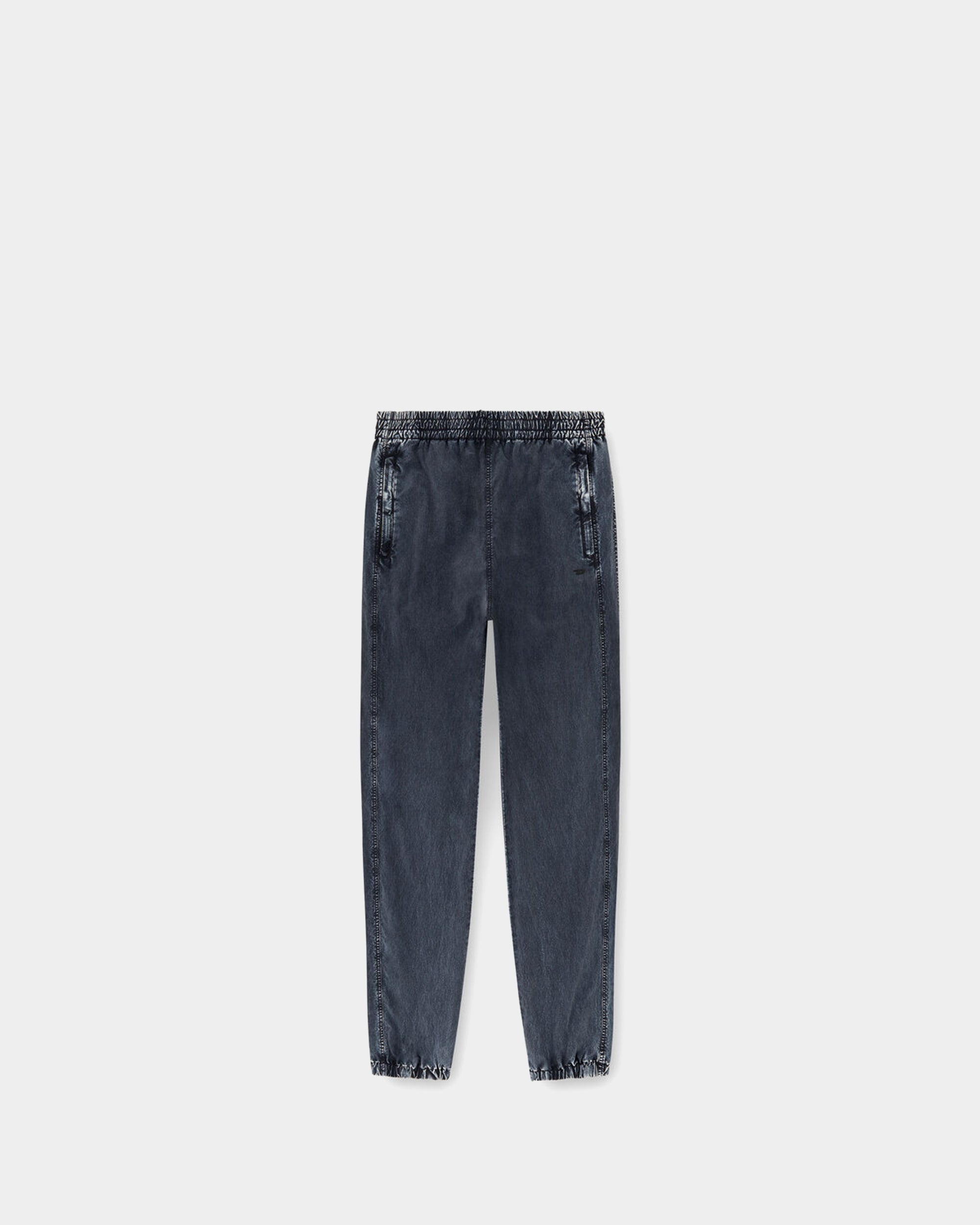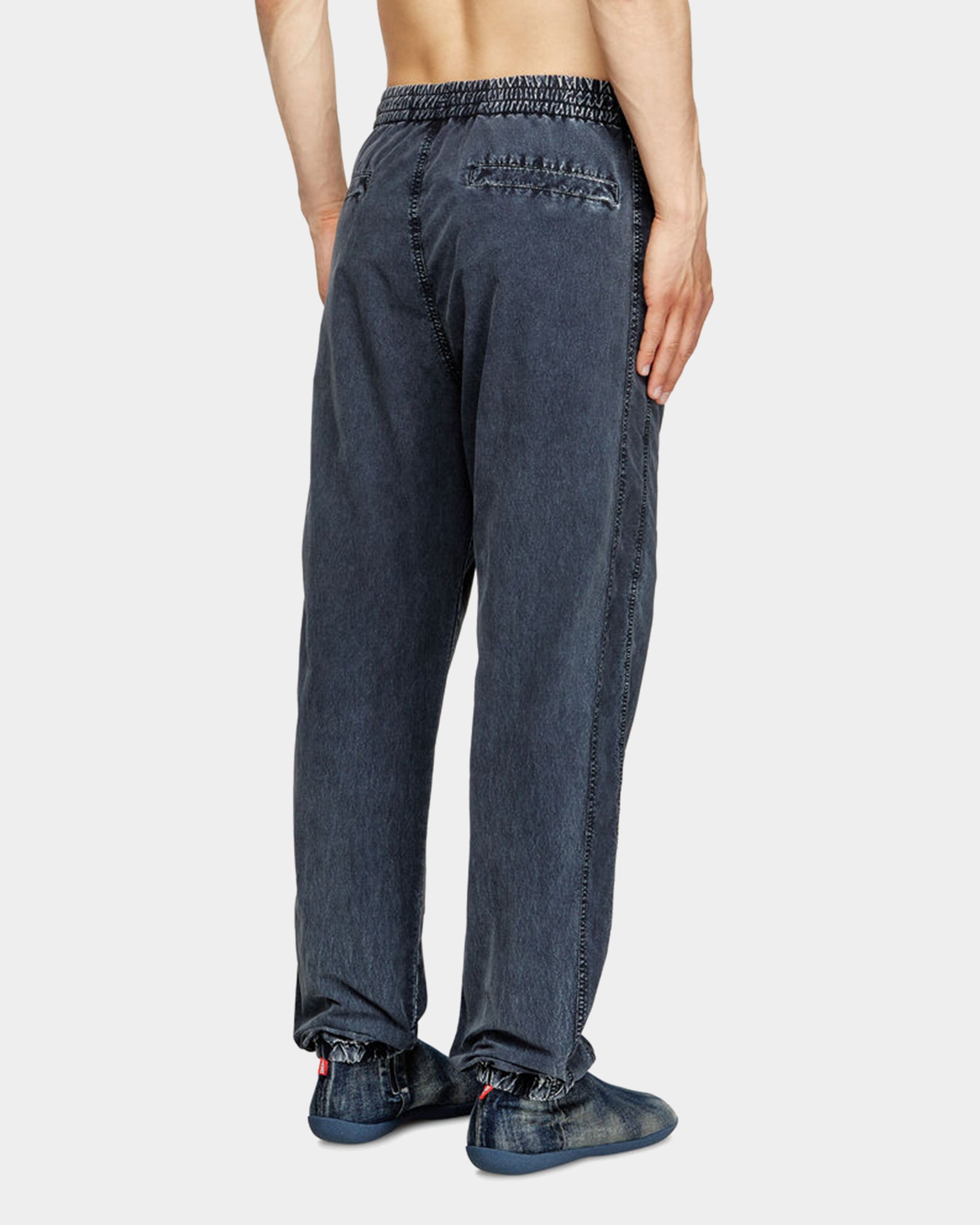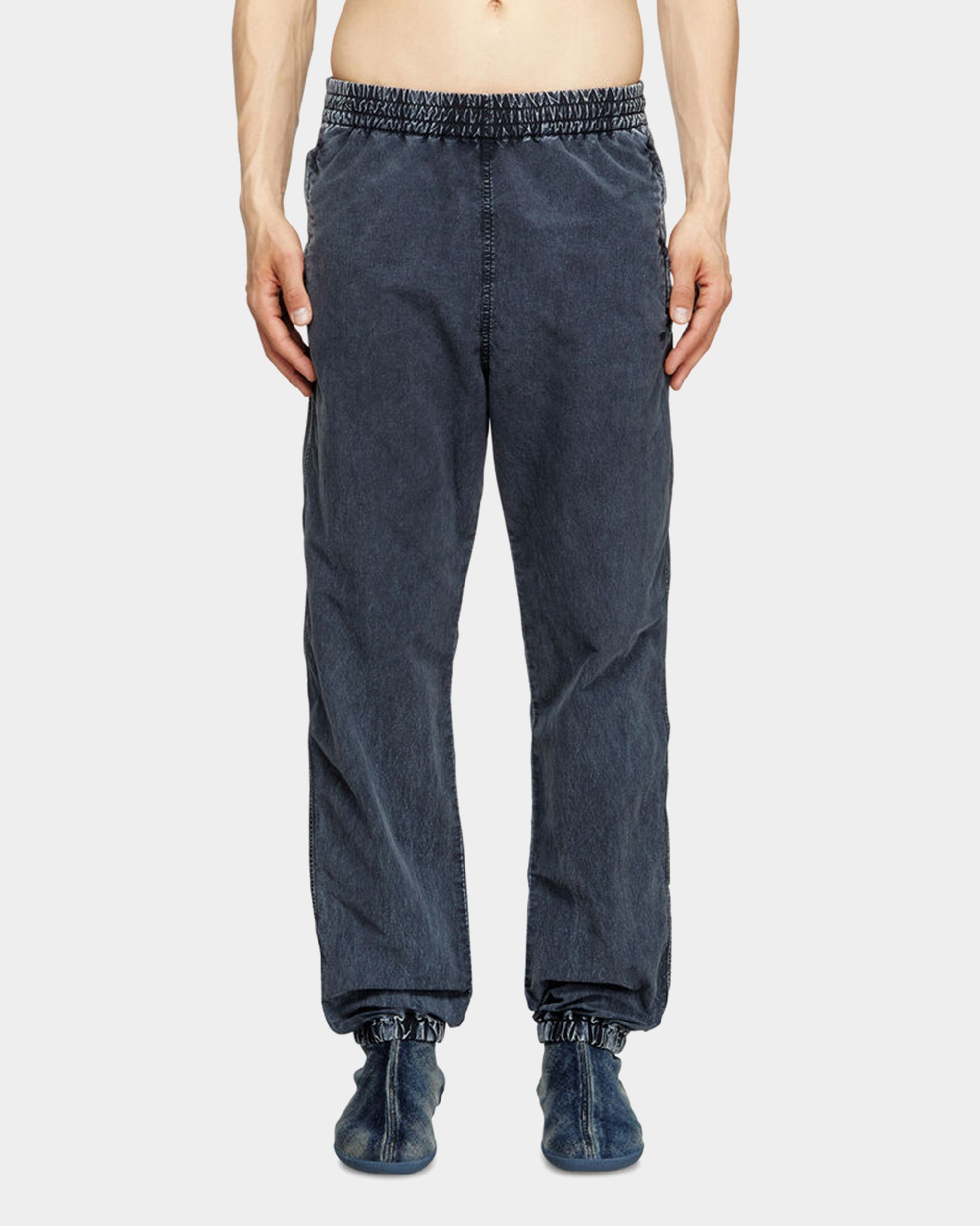 採用 100% 再生尼龍製成,並經特殊酸洗處理營造類牛仔風格。版型為寬鬆直筒,舒適自在。腰部為 鬆緊帶搭配隱藏式抽繩設計,方便調節貼合。褲腳採鬆緊收口,更增休閒與運動感。左前口袋裝飾 矽膠 Diesel “D” 標誌,提升品牌辨識。內裡有薄襯裡處理提升穿著舒適度。