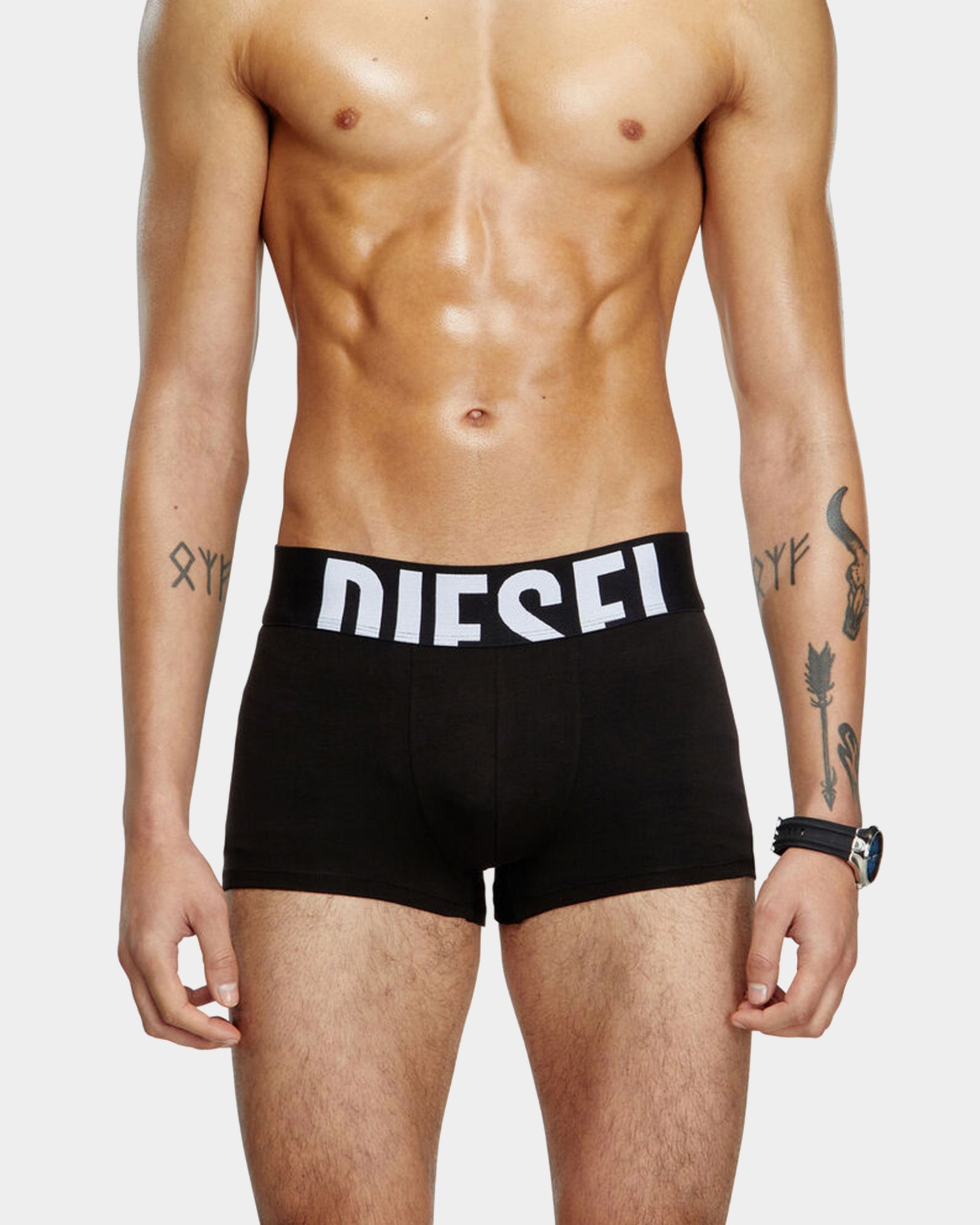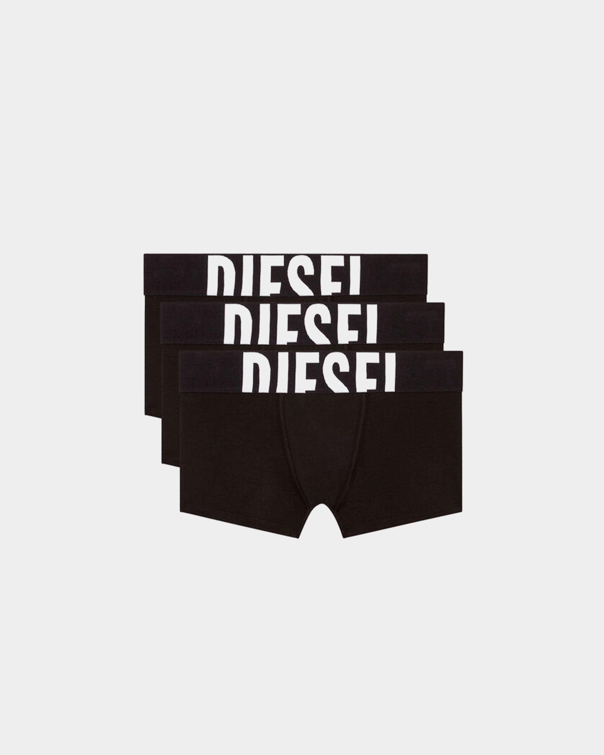 套裝包含三條黑色平口內褲,採用純棉彈性布料,提供舒適的穿著體驗。每條內褲都配有寬鬆的彈性腰帶,並在前方印有 Diesel 的大字標誌,展現品牌特色。此款內褲設計簡約,適合日常穿著。
