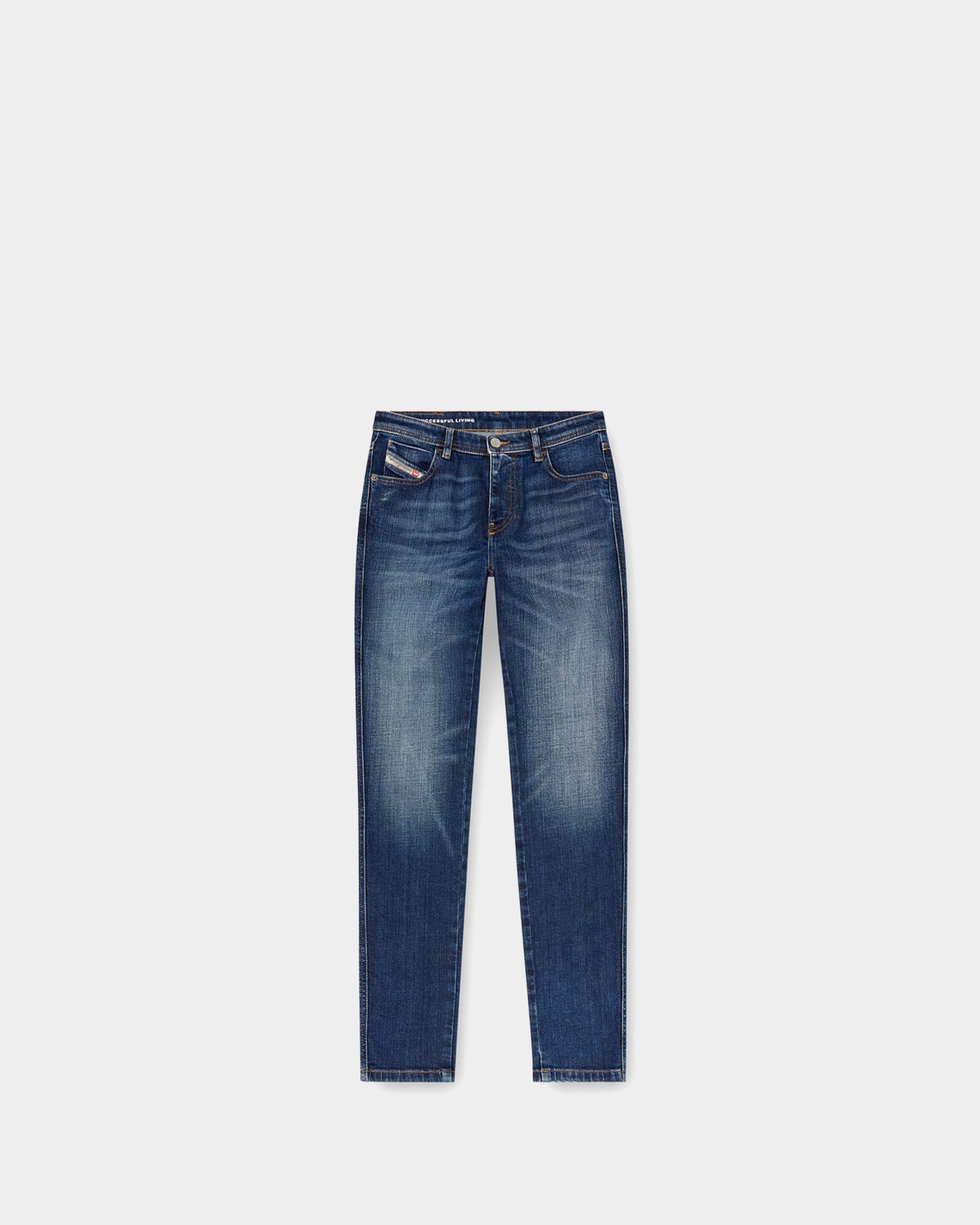 為經典窄管剪裁,採中腰設計,貼合自然腰線,打造修長腿部線條。深中藍洗水經過細緻打磨,呈現復古略微磨損的柔和質感,賦予自然舊化的美式丹寧風格。乾淨俐落的車縫與五口袋經典設計,搭配拉鍊門襟與圓形鈕扣,展現 Diesel 品牌的細節工藝與低調質感。