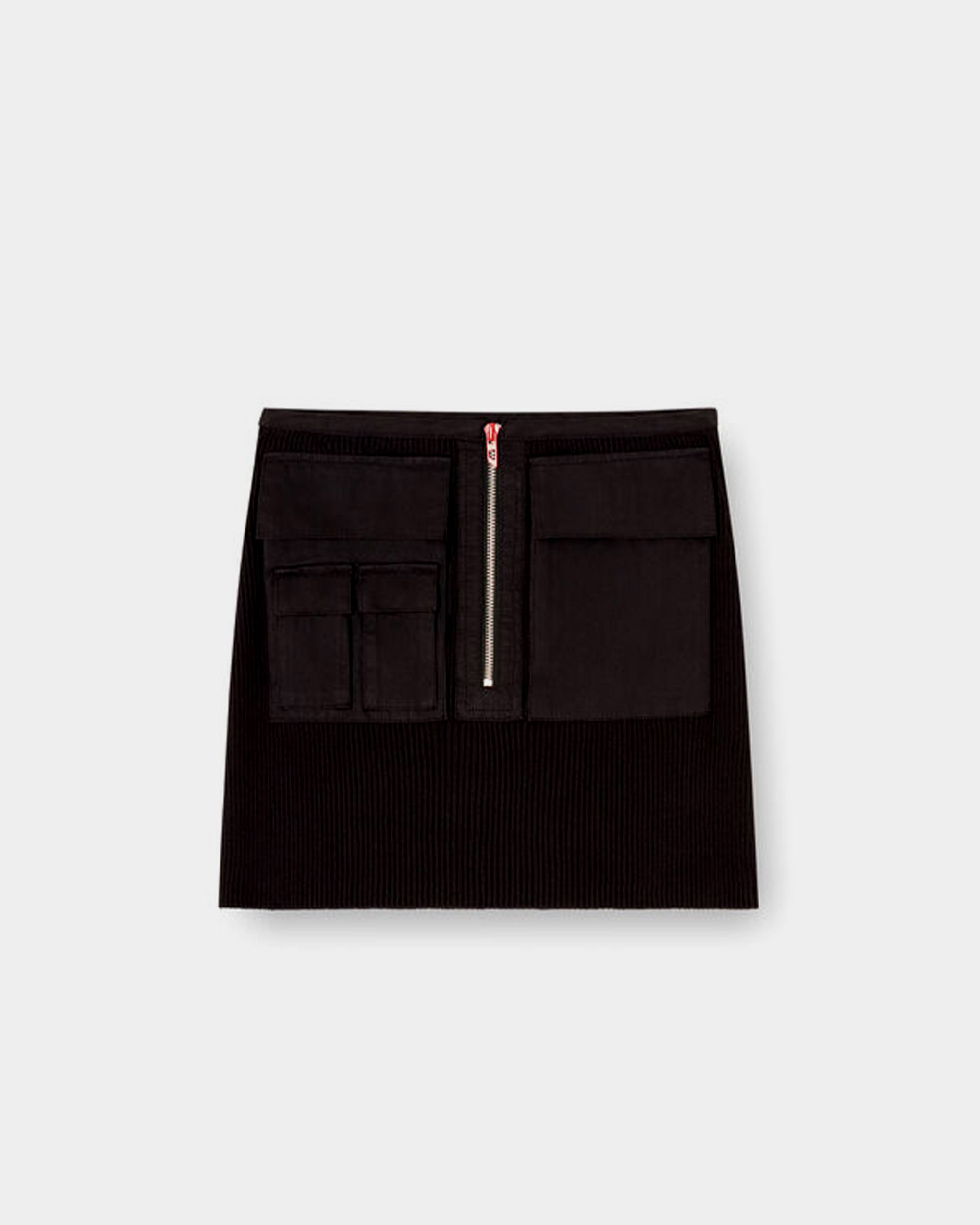 這款 M-MERYN-SHORT 女款迷你裙採用 100% 有機棉材質,質地柔軟且透氣。設計上,裙子採用厚實的肋紋針織結構,展現立體感與貼身剪裁,強調女性曲線。前方設有拉鍊開合,搭配兩側貼袋,增添實用性與工裝風格。拉鍊拉頭上飾有紅色亮面「D」字母標誌,為整體造型增添亮點。