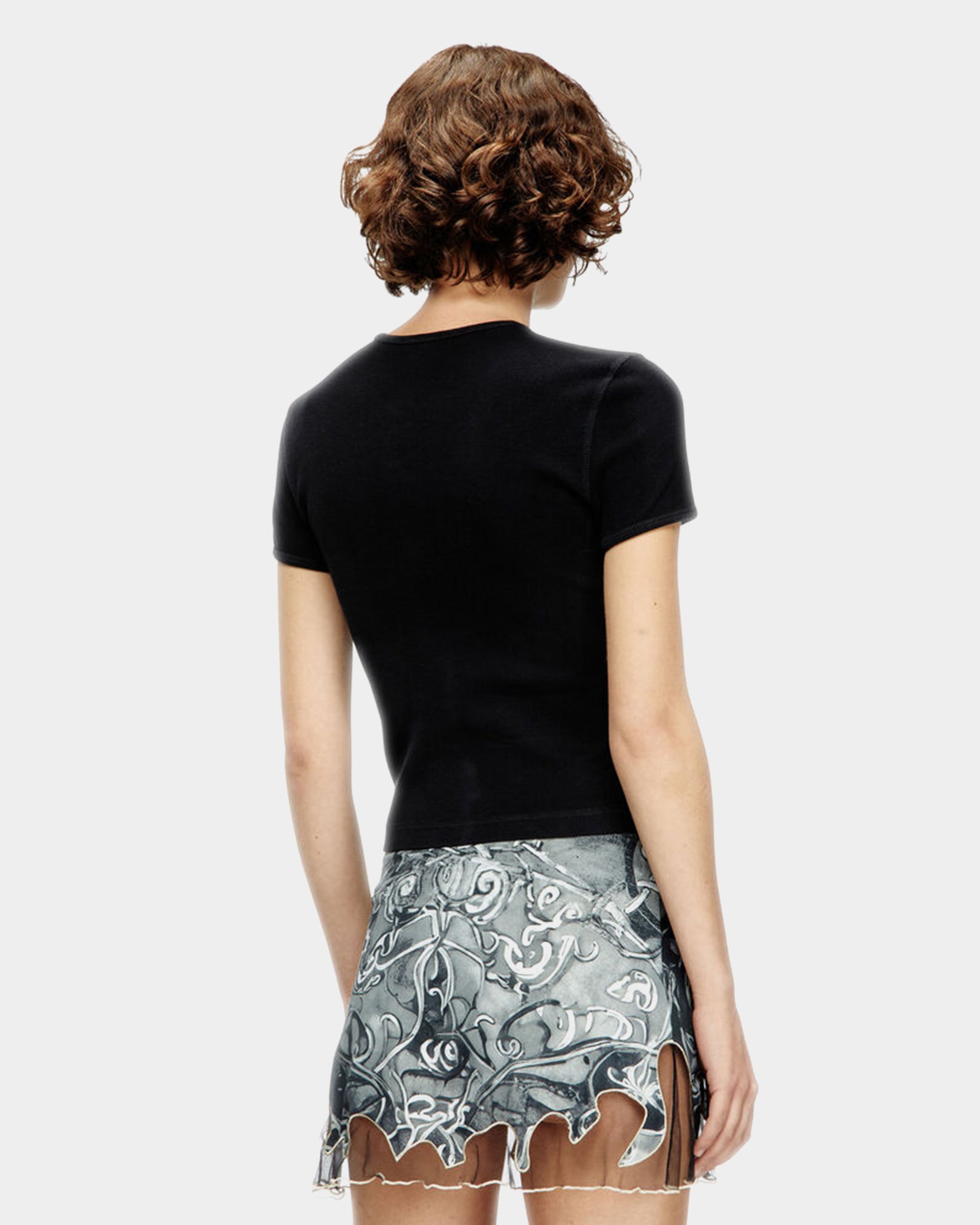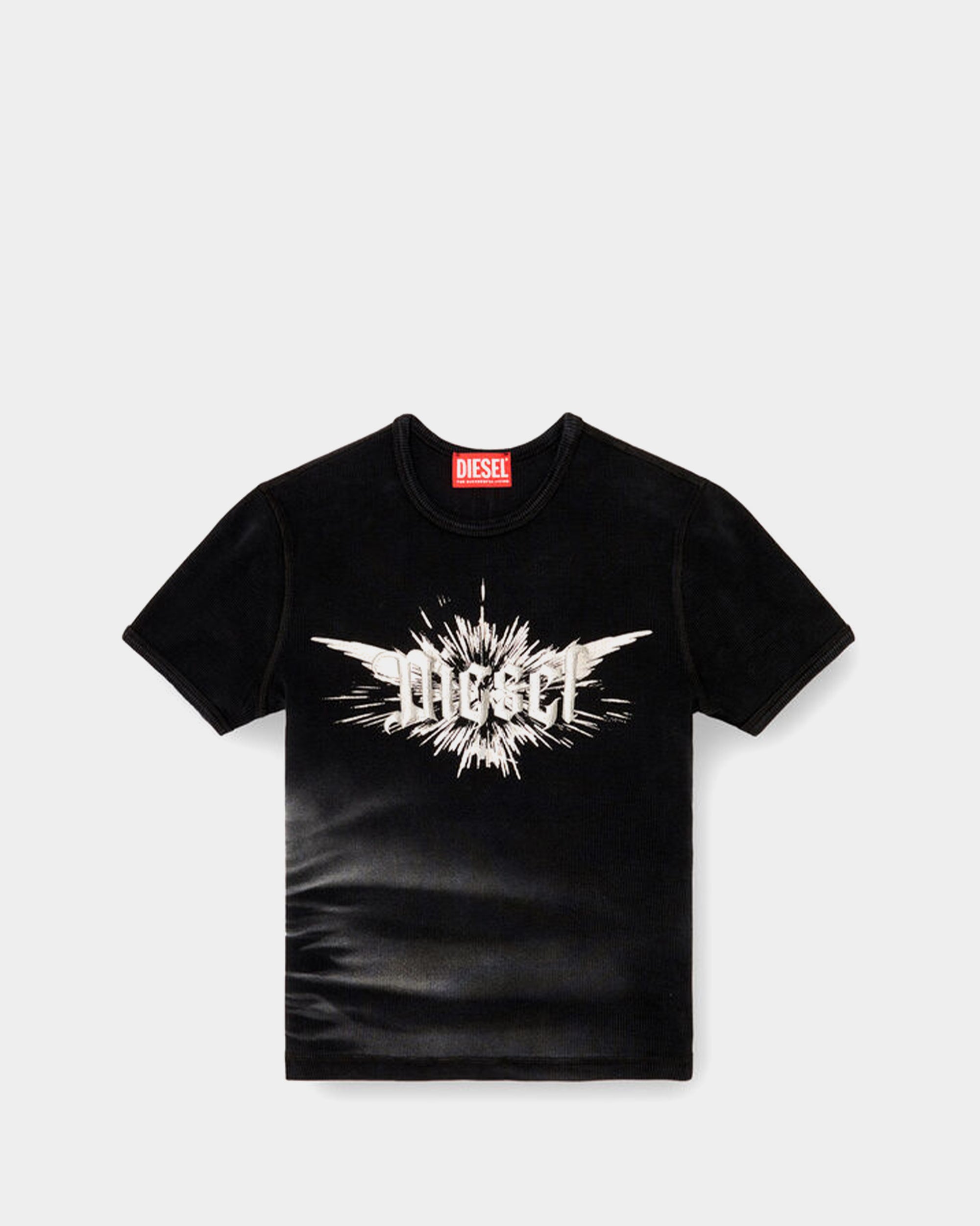 採用95%有機棉與5%彈性纖維,胸前飾有金屬翼狀「D」字母箔印花,搭配石洗與雷射磨損細節,呈現自然褪色舊感風格,兼具時尚與舒適。。