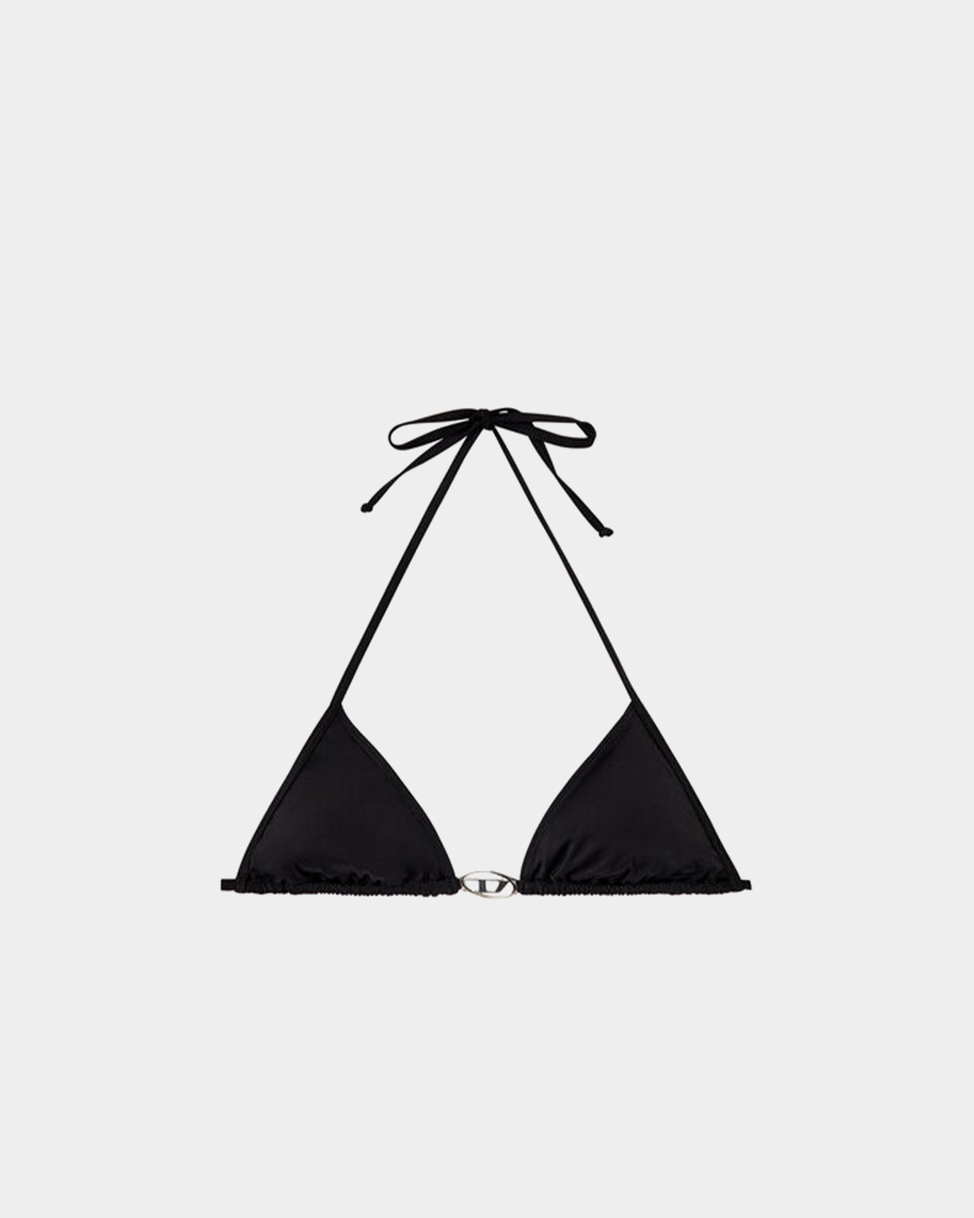 用黑色設計,胸前中央配有金屬圓形 D 標誌,展現品牌特色。上衣採用可調節的頸部和背部綁帶設計,提供舒適的穿著體驗。