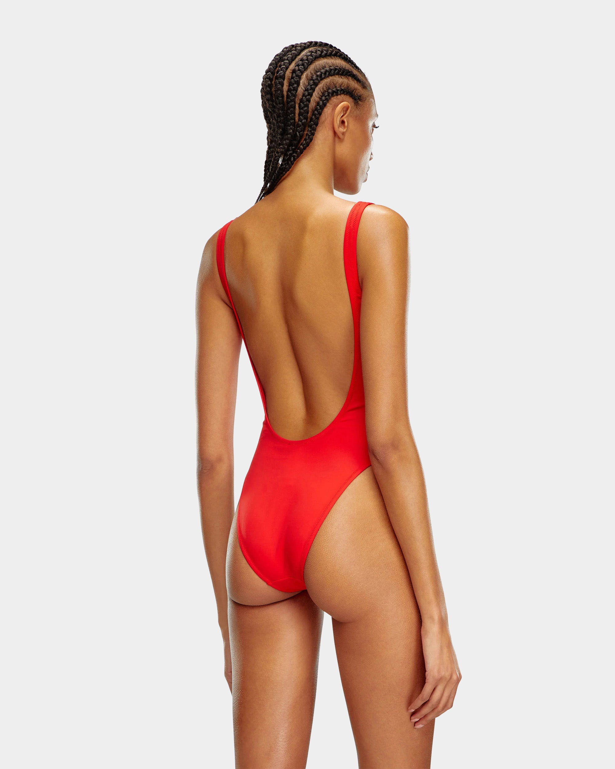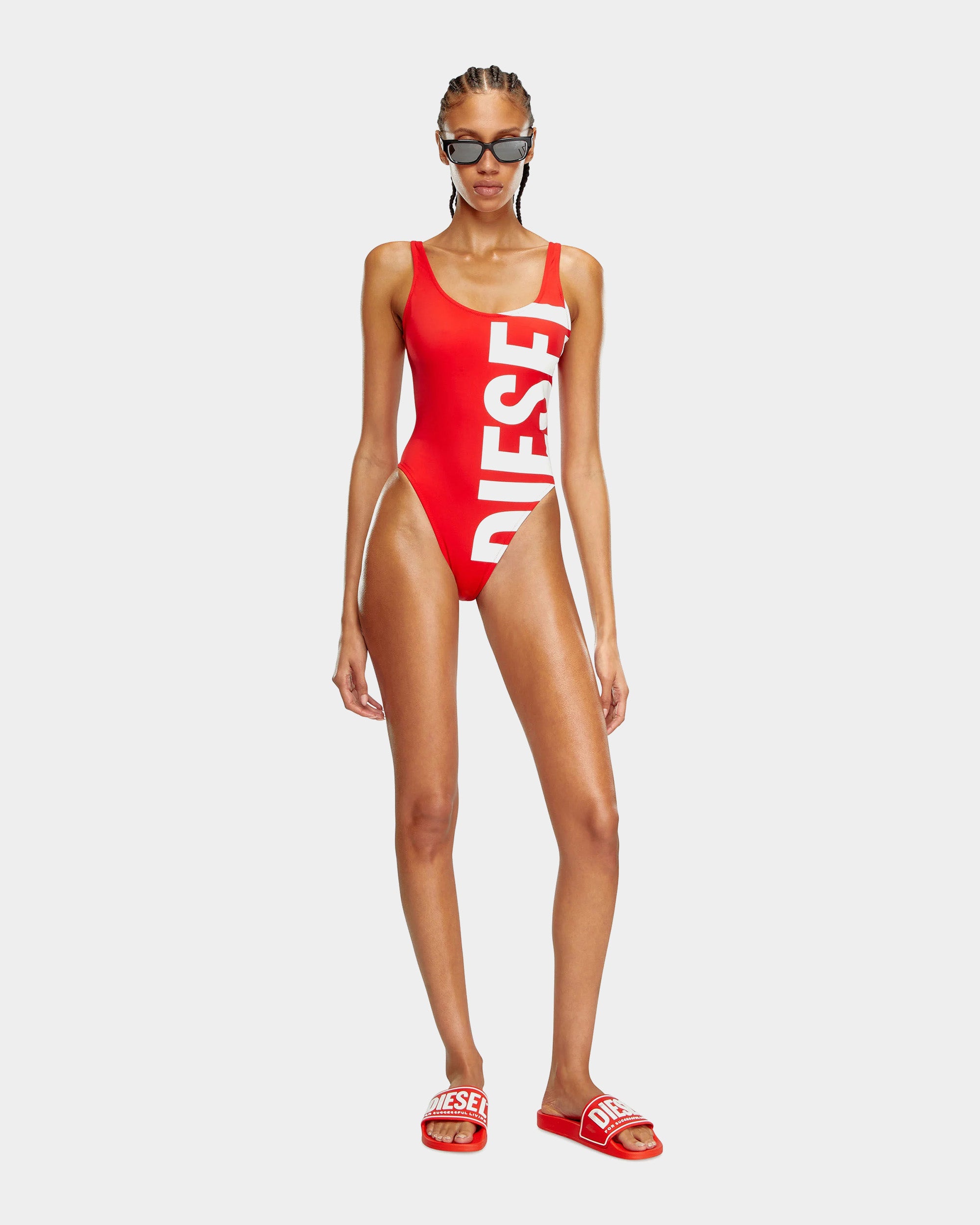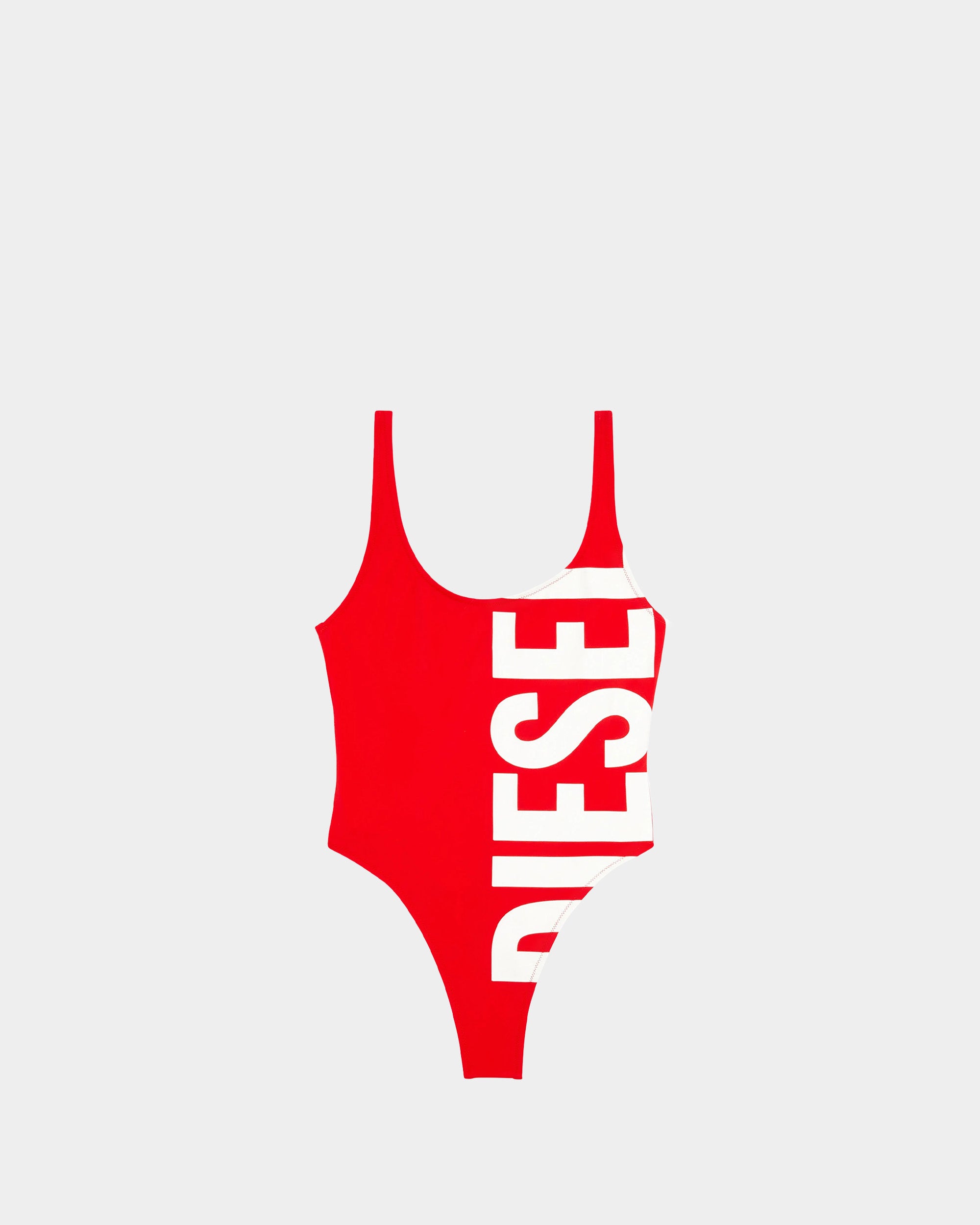以搶眼巨型 DIESEL 白色字母印花打造強烈品牌視覺張力。極簡寬肩帶設計搭配高衩剪裁,不僅修飾腿部比例,也展現性感輪廓與運動感。選用彈性泳衣布料,提供舒適包覆與活動自由,是泳池、海灘或度假造型的醒目選擇。