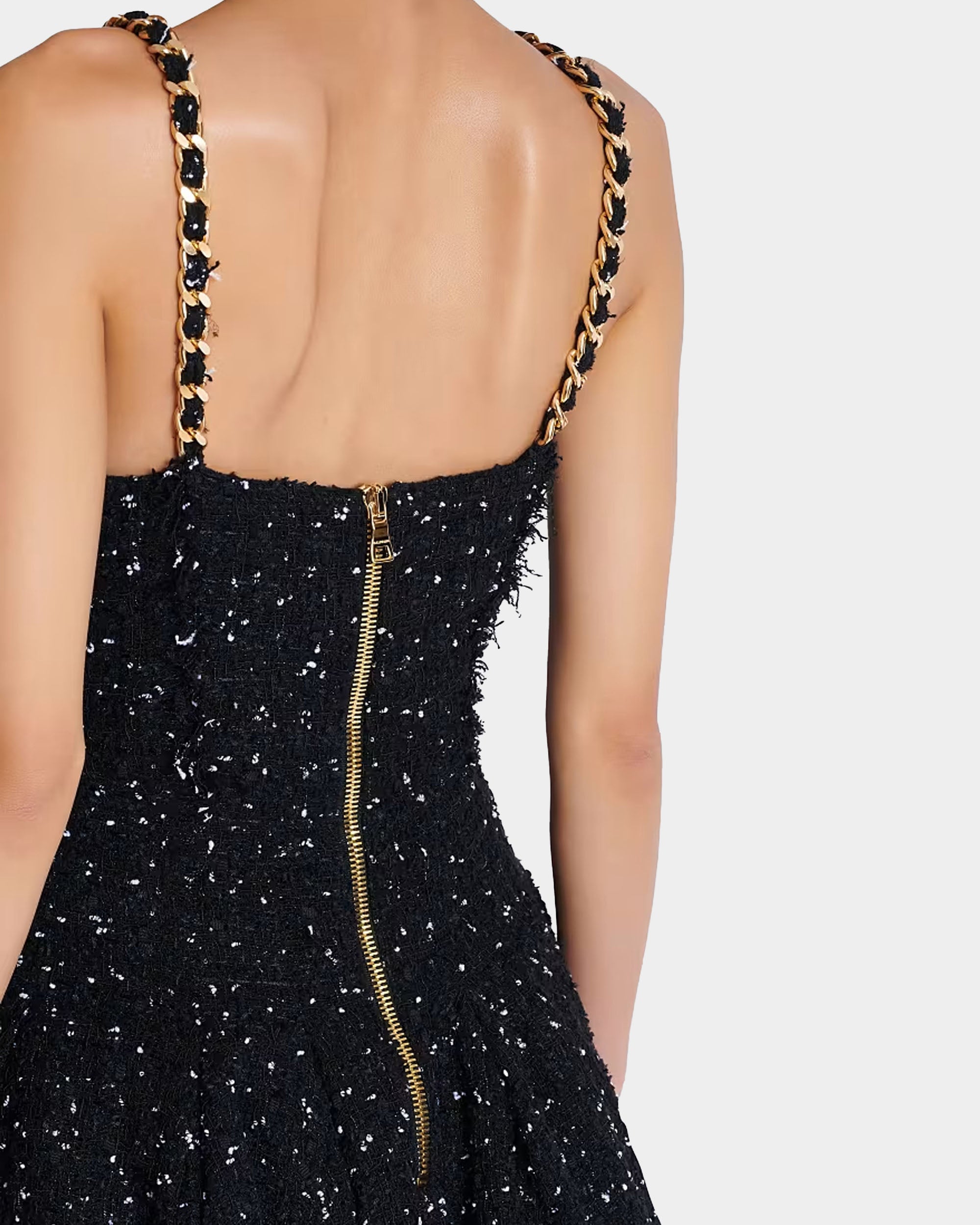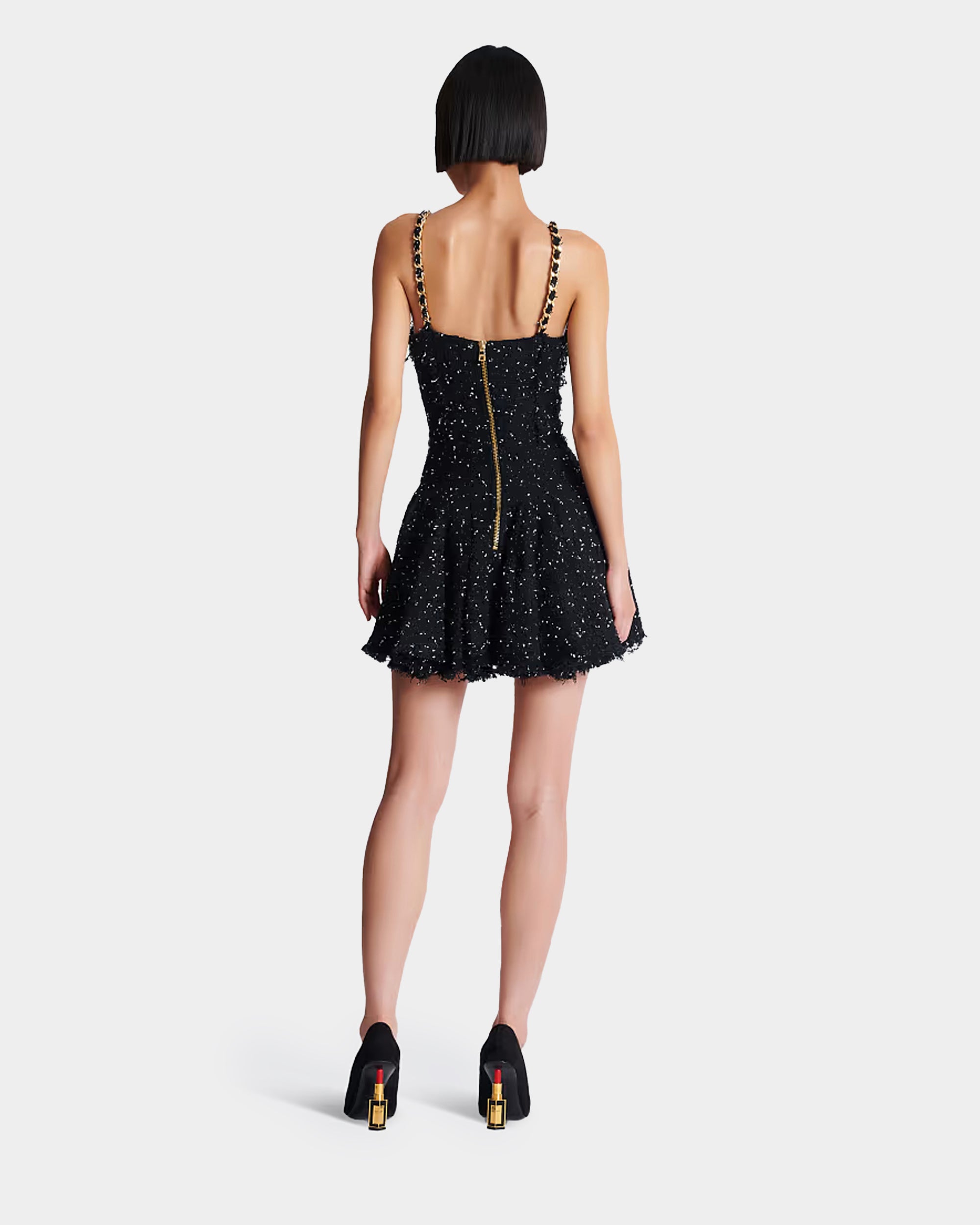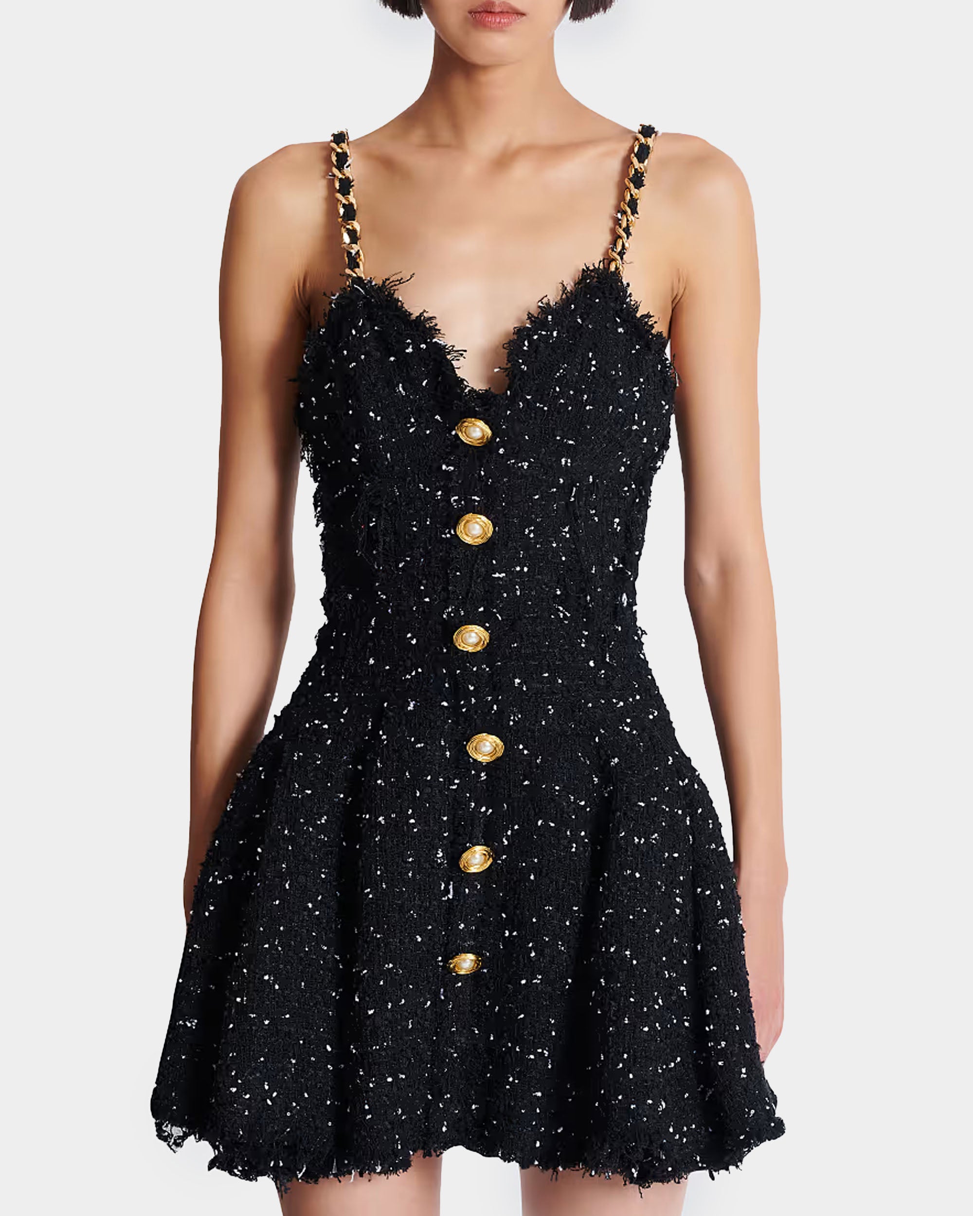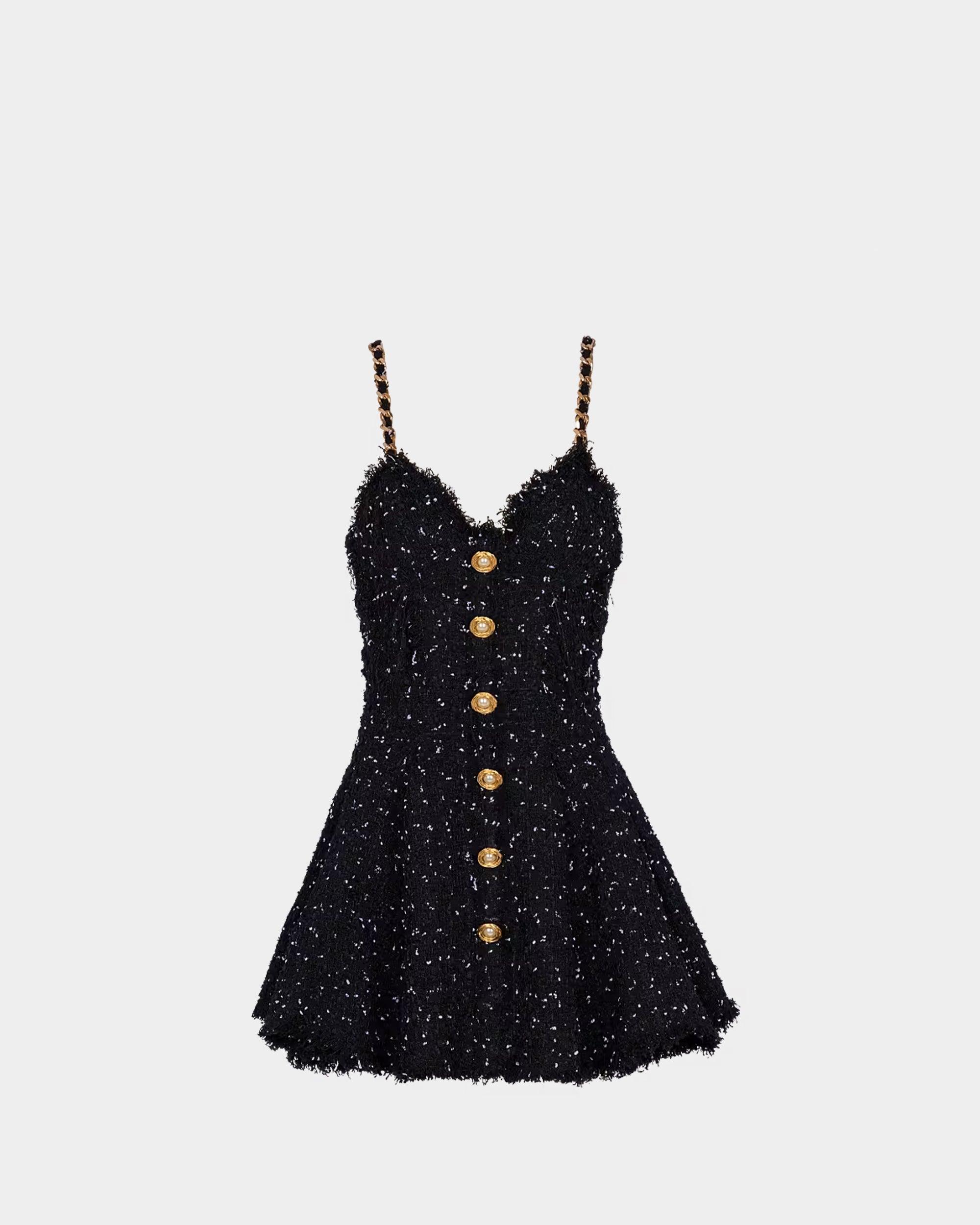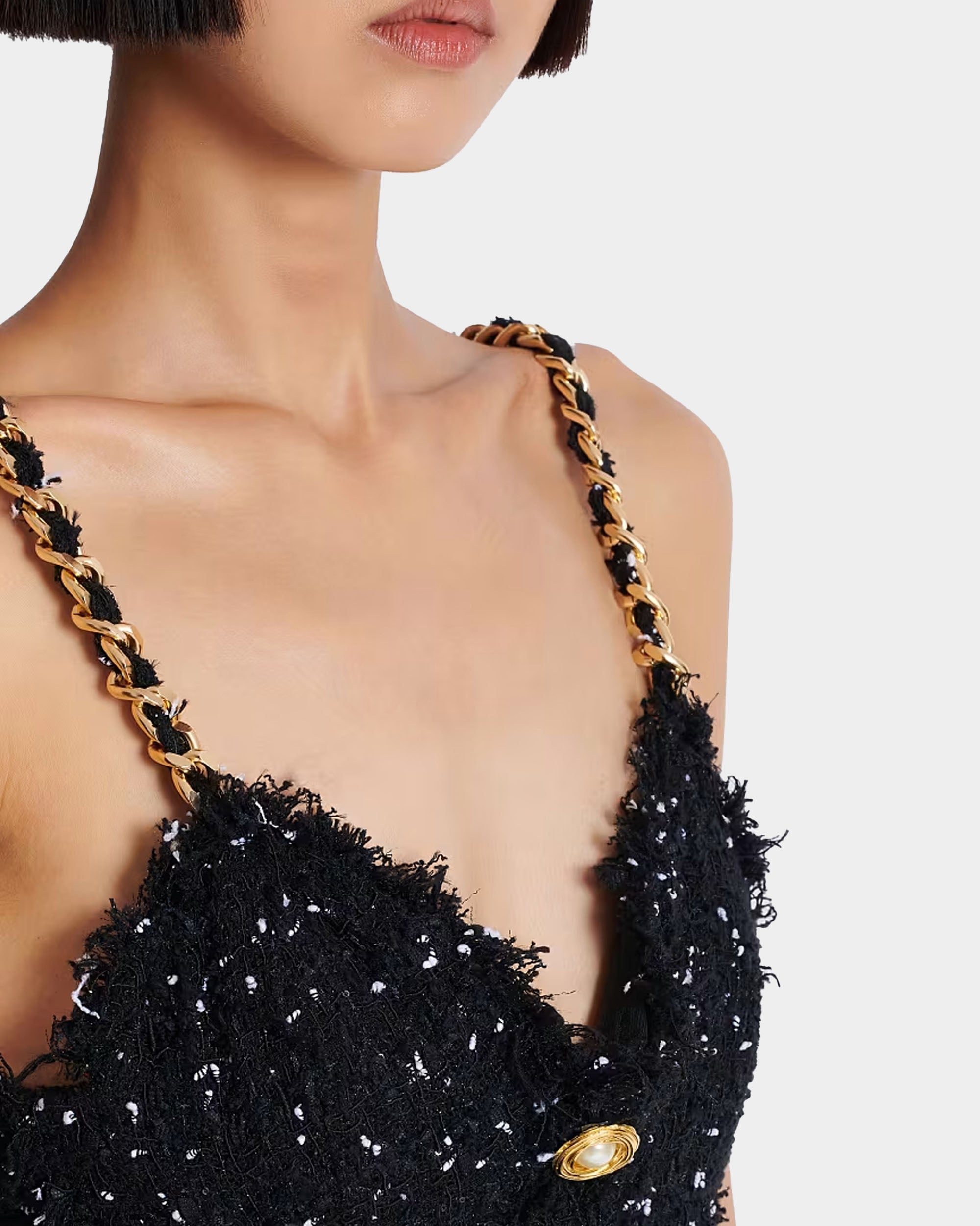 經典短洋裝融合法式優雅與搖滾元素,以微閃圓點粗花呢面料搭配品牌代表性金獅頭鈕釦,展現自信女性的摩登風格。金屬鍊條交織肩帶與心形領口設計,強化鎖骨線條與胸型輪廓,裙身內側加強塑型結構,勾勒俐落曲線。