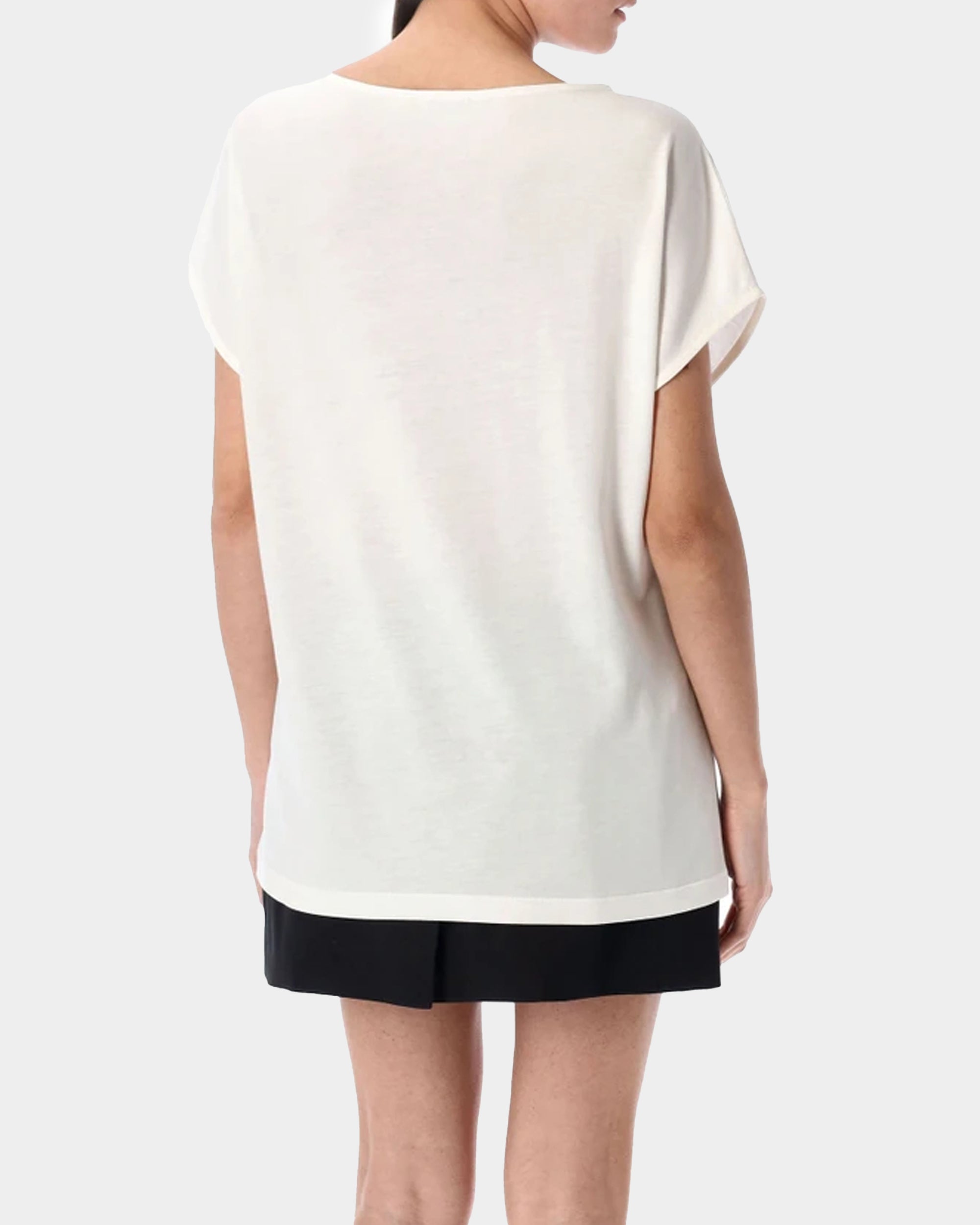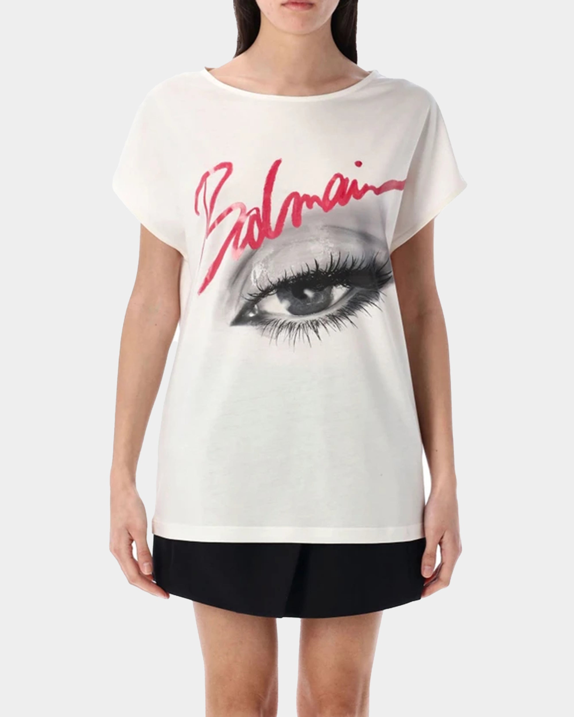 Balmain 經典船領剪裁 T 恤,以柔軟親膚的面料打造,胸前印有霧面質感 Balmain Eye 眼睛圖騰與手寫風格品牌標誌,展現摩登視覺張力。短袖與寬鬆版型設計兼具舒適與潮流感,是日常造型的亮點單品。