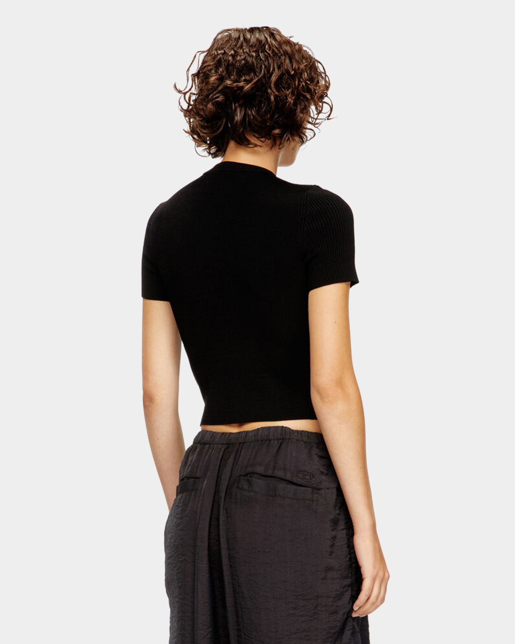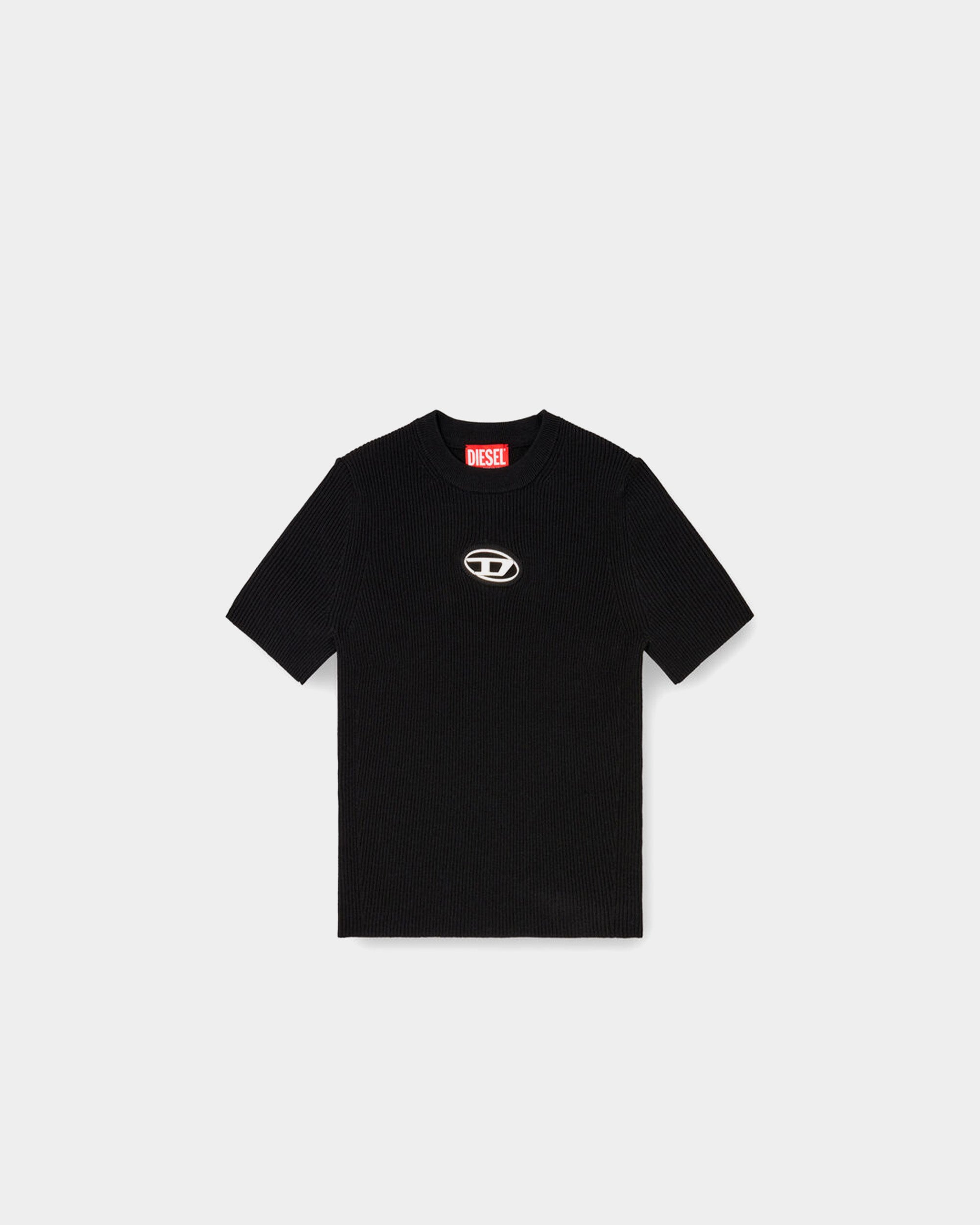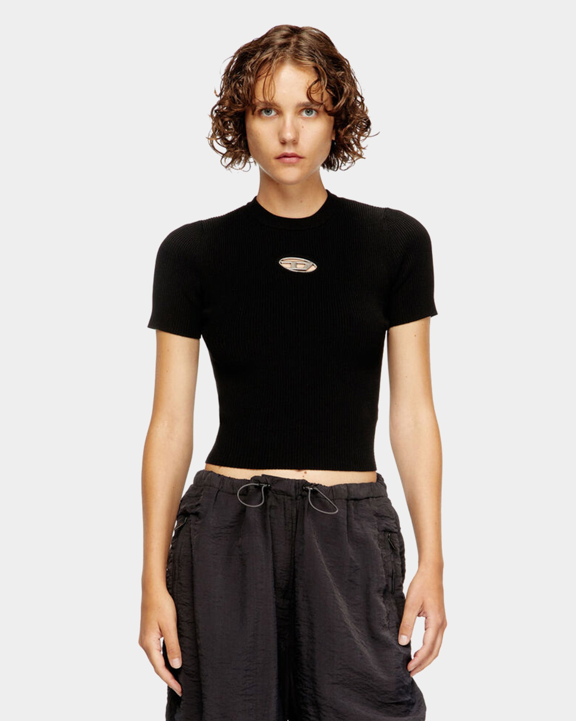 這款 M-Valari 女款短袖針織上衣採混紡材質製成,提供舒適的穿著感受。胸前的圓形「D」字母標誌以鏤空刺繡呈現,增添一抹亮點。圓領與短袖設計,適合日常穿搭或休閒場合。
