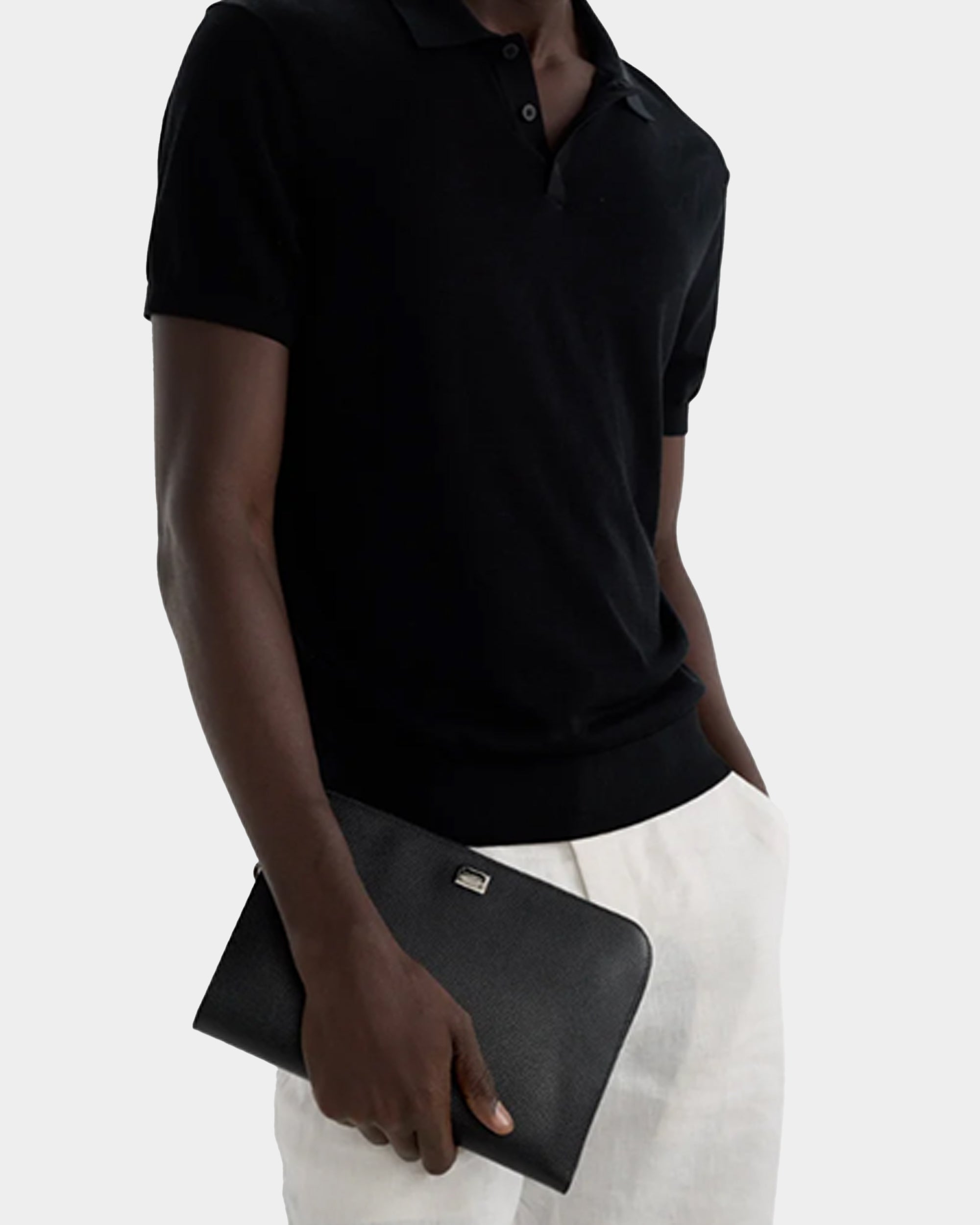 Sicily手拿包選用頂級黑色小牛皮,立體壓紋Logo猶如低語的印記,隨著光影流轉,映照出專屬於你的個性與品味。銀色金屬細節如星辰點綴,為沉穩的外觀添上一抹不經意的光芒,方正結構與簡潔線條。