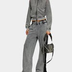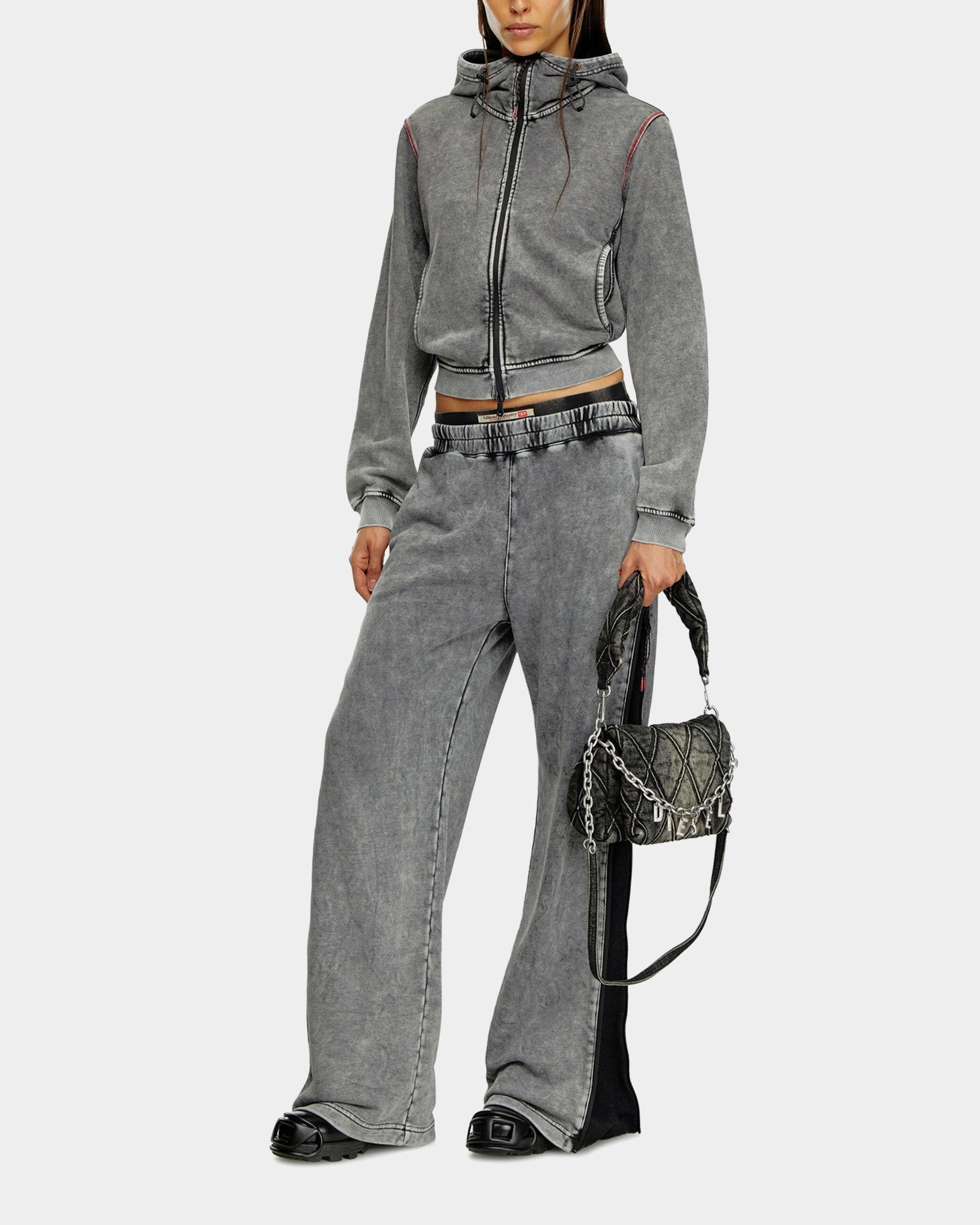 灰色褪色感運動褲以獨特的側邊拉鍊設計結合復古的水洗色澤,在寬鬆隨性的廓形中散發出鮮明的街頭機能感,完美展現品牌率性且前衛的時尚態度。