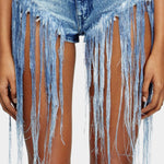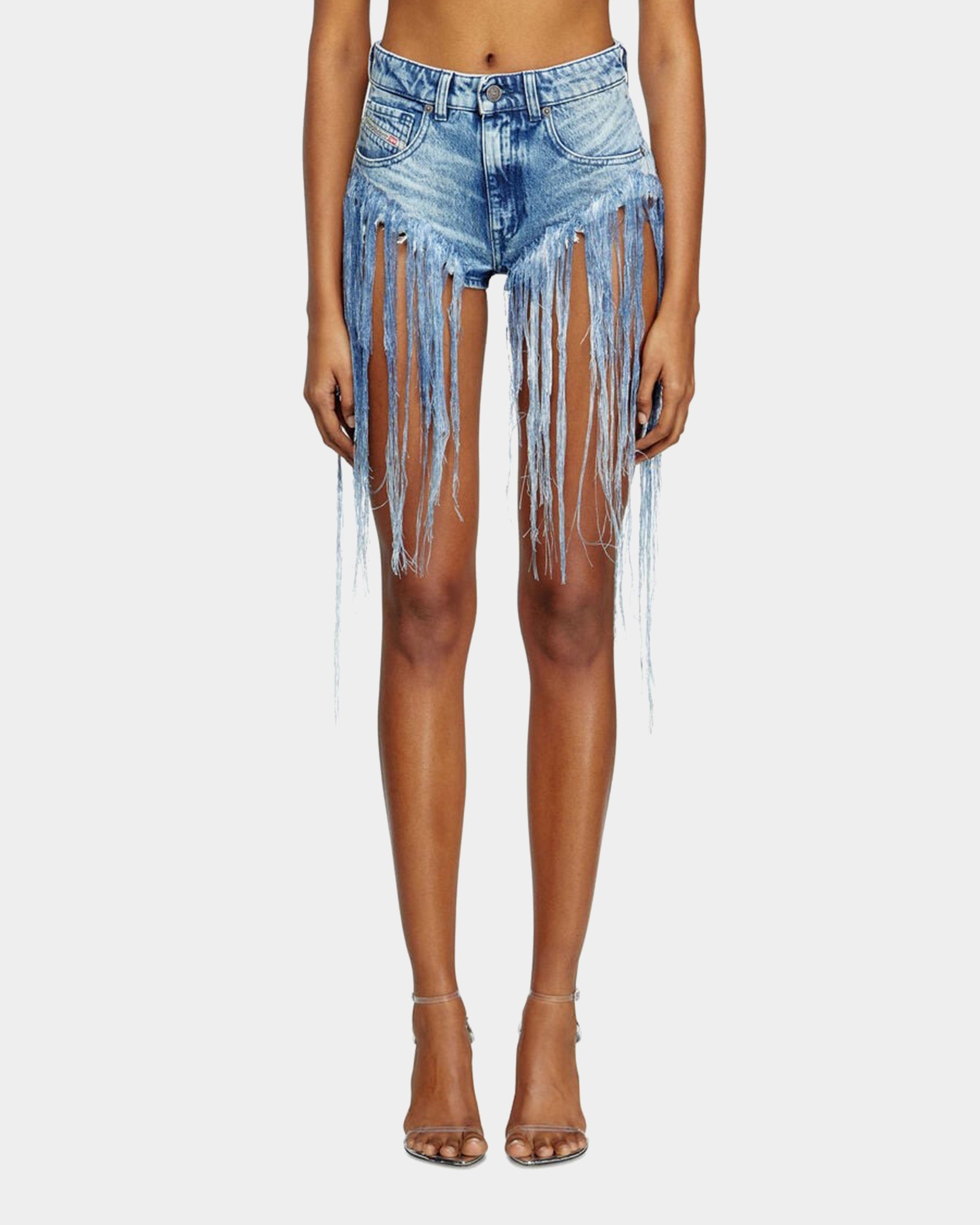 這條短褲採 100% 棉丹寧布製作,為五口袋設計,特色是在褲腳加上超長流蘇處理與「鬚邊」刷洗花紋,營造略帶街頭與實驗風格的破壞感,適合喜歡前衛或復古感穿搭者。