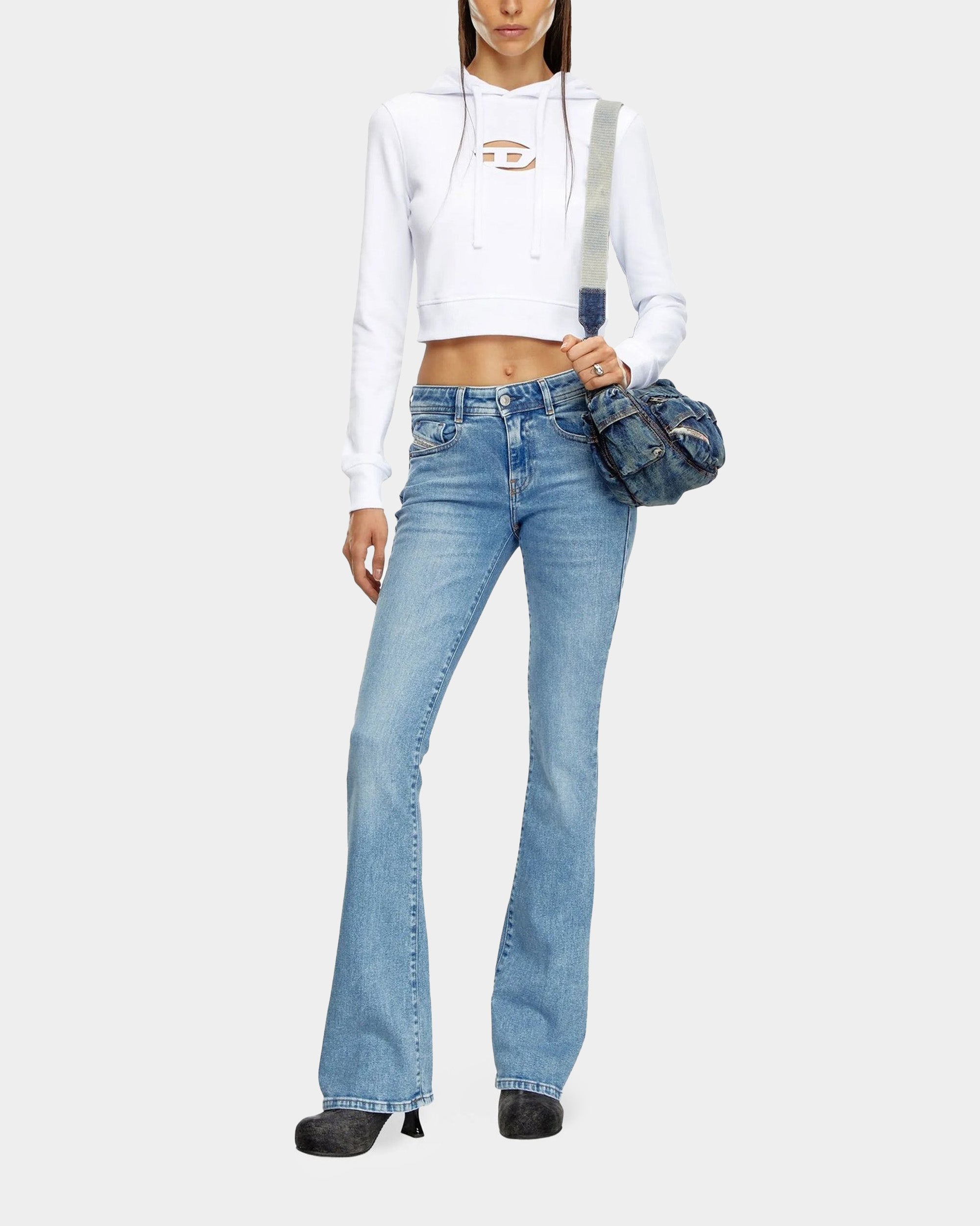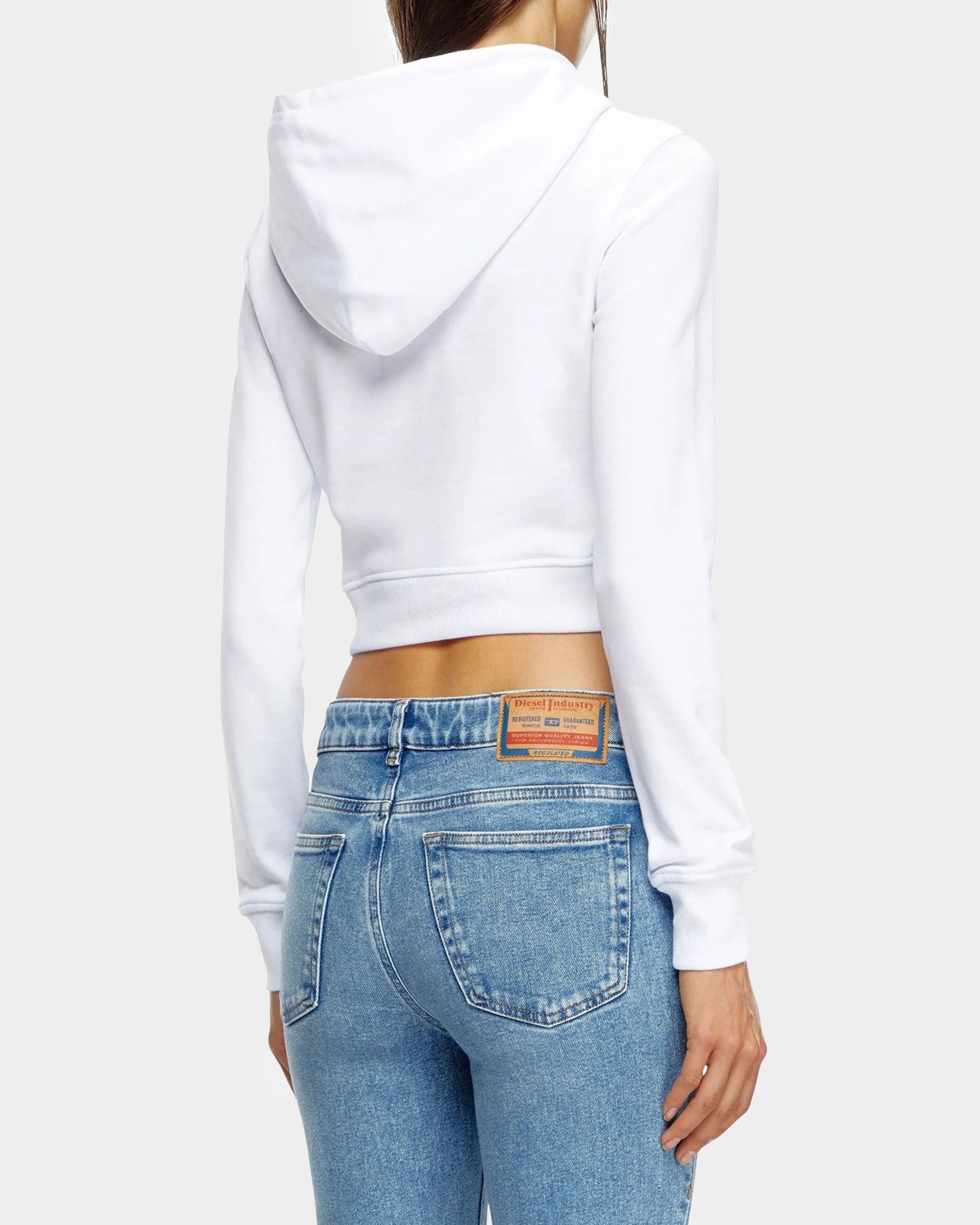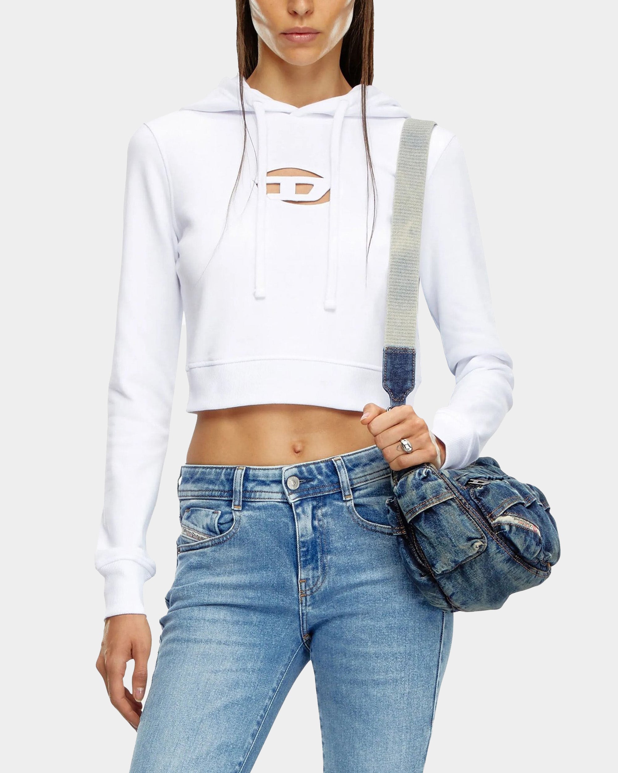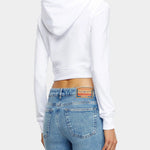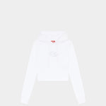 這款女性修身版型連帽上衣,採用 60% 有機棉與 40% 聚酯纖維混紡,胸前以雷射切割與刺繡技術呈現「透視 D 字母」設計,展現品牌特色。