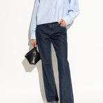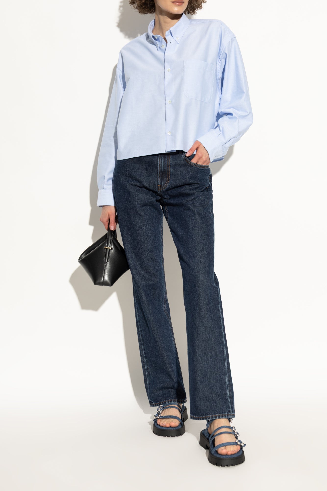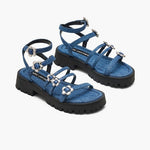 以藍色織帶交錯包覆、搭配鋸齒厚底增高與穩定抓地,清爽配色但很有份量感,日常牛仔褲到洋裝都能直接套上出門。