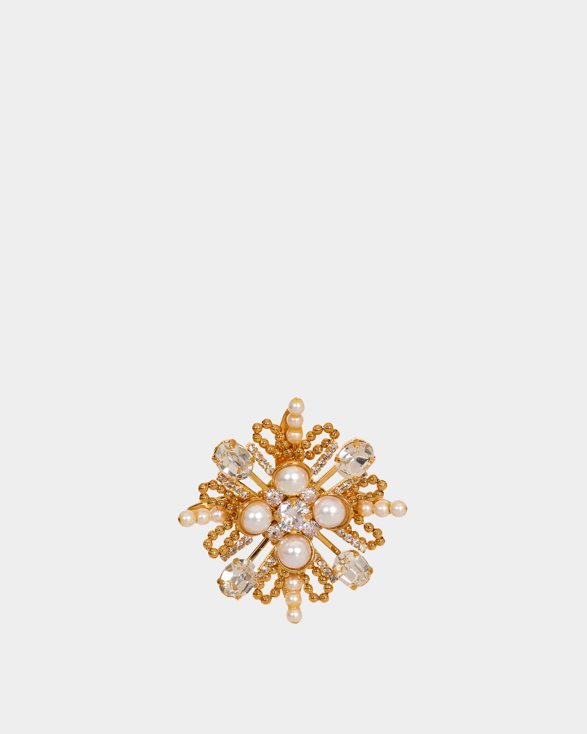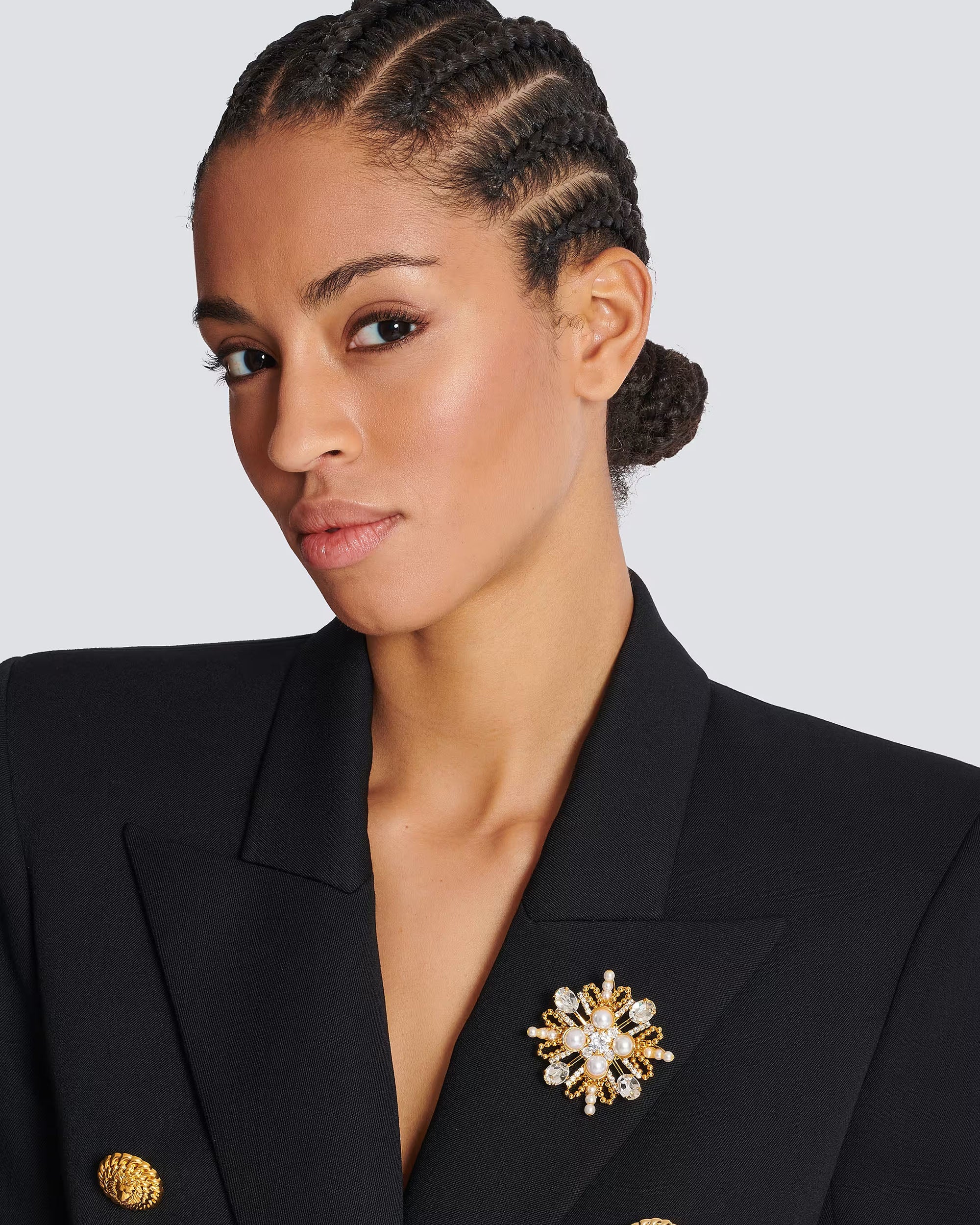 閃耀的水晶與珠飾拼湊出華麗花型設計,結合金色金屬質感,盡顯 BALMAIN 招牌奢華風格。可別針於西裝、洋裝或外套,為整體造型增添亮點與優雅氣勢。