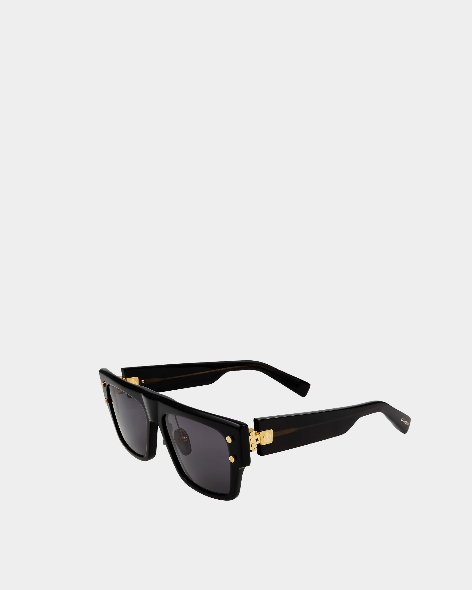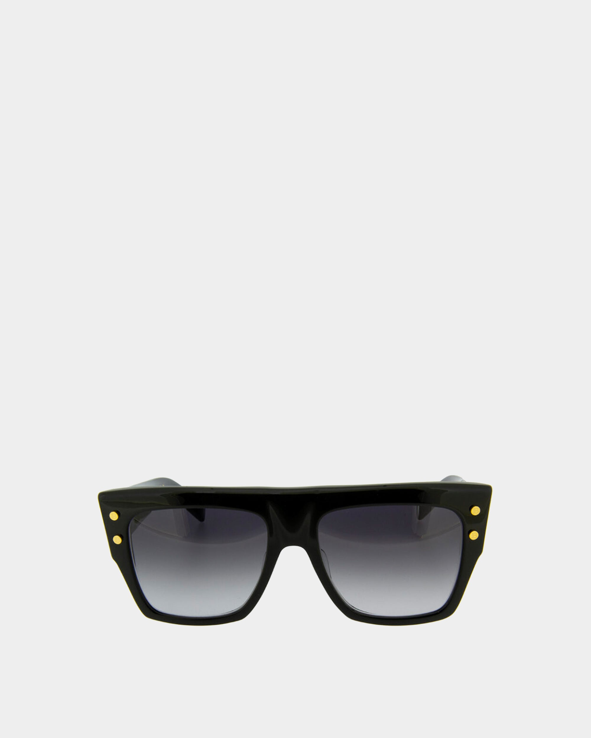 這款方形醋酸纖維太陽眼鏡以俐落平直鏡框展現陽剛氣息,搭配雙鉚釘細節與金色或銀色「B」字雕刻鉸鏈設計,時尚鏡片提供漸層或潮流染色選擇。鏡框寬度適中,特別適合中至寬臉型配戴。