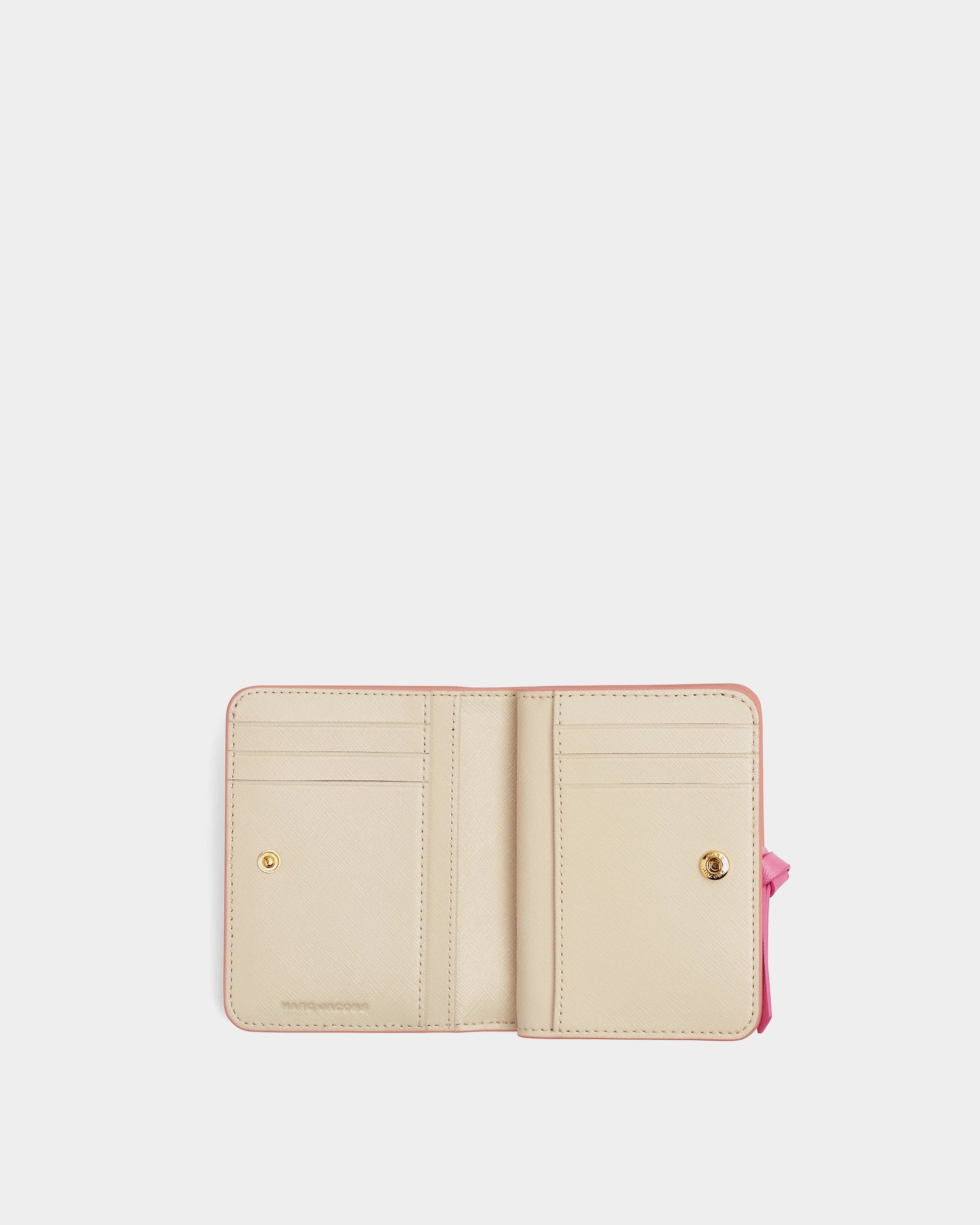 以俐落信封造型設計,展現現代簡約感。採用 100% 真皮製成,內部設有紙鈔夾層、8個卡片夾層及可收納手機的充足空間。搭配可拆卸的金屬鍊帶,既可作為錢包、亦能作為斜背小包,實用性與時尚兼具。正面飾有經典 Logo 金屬標誌,細節質感出眾。