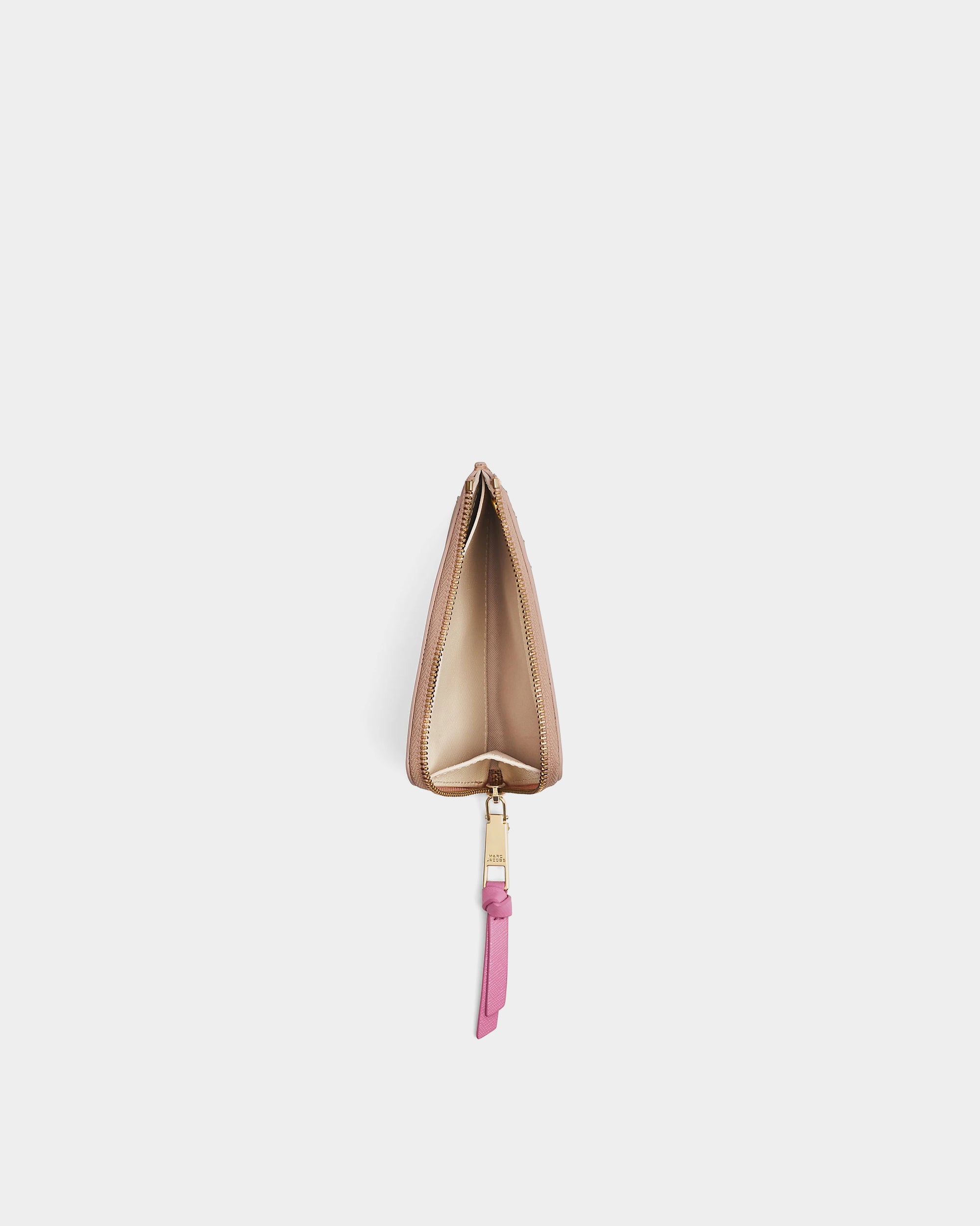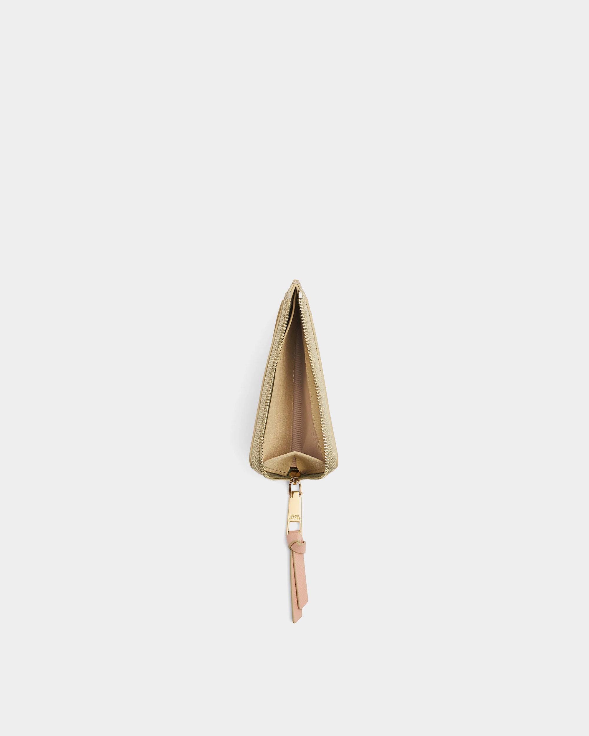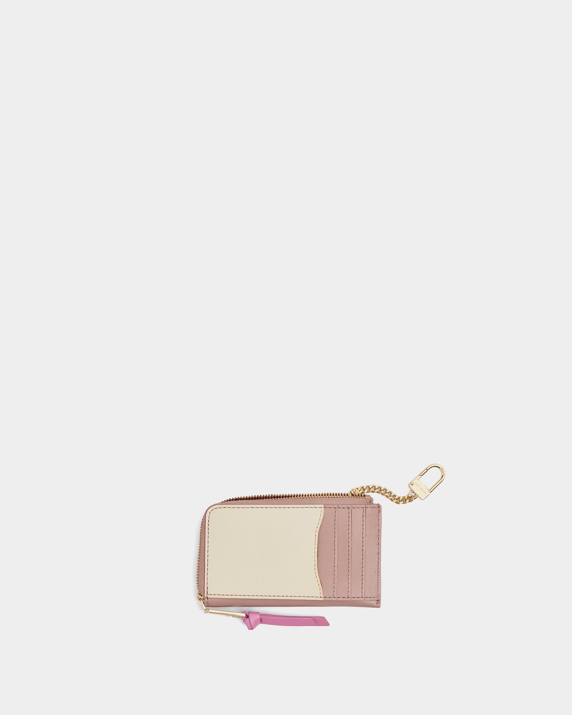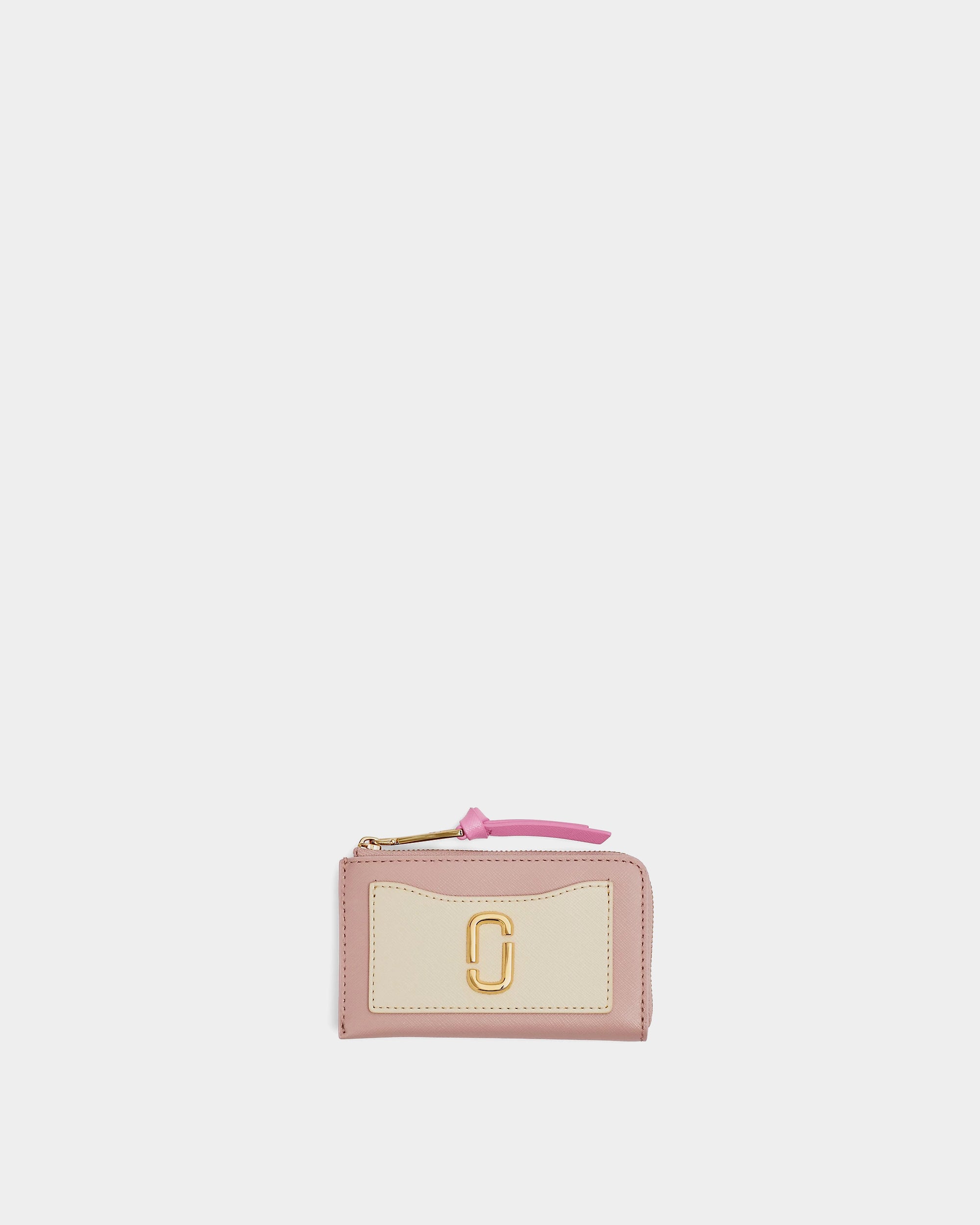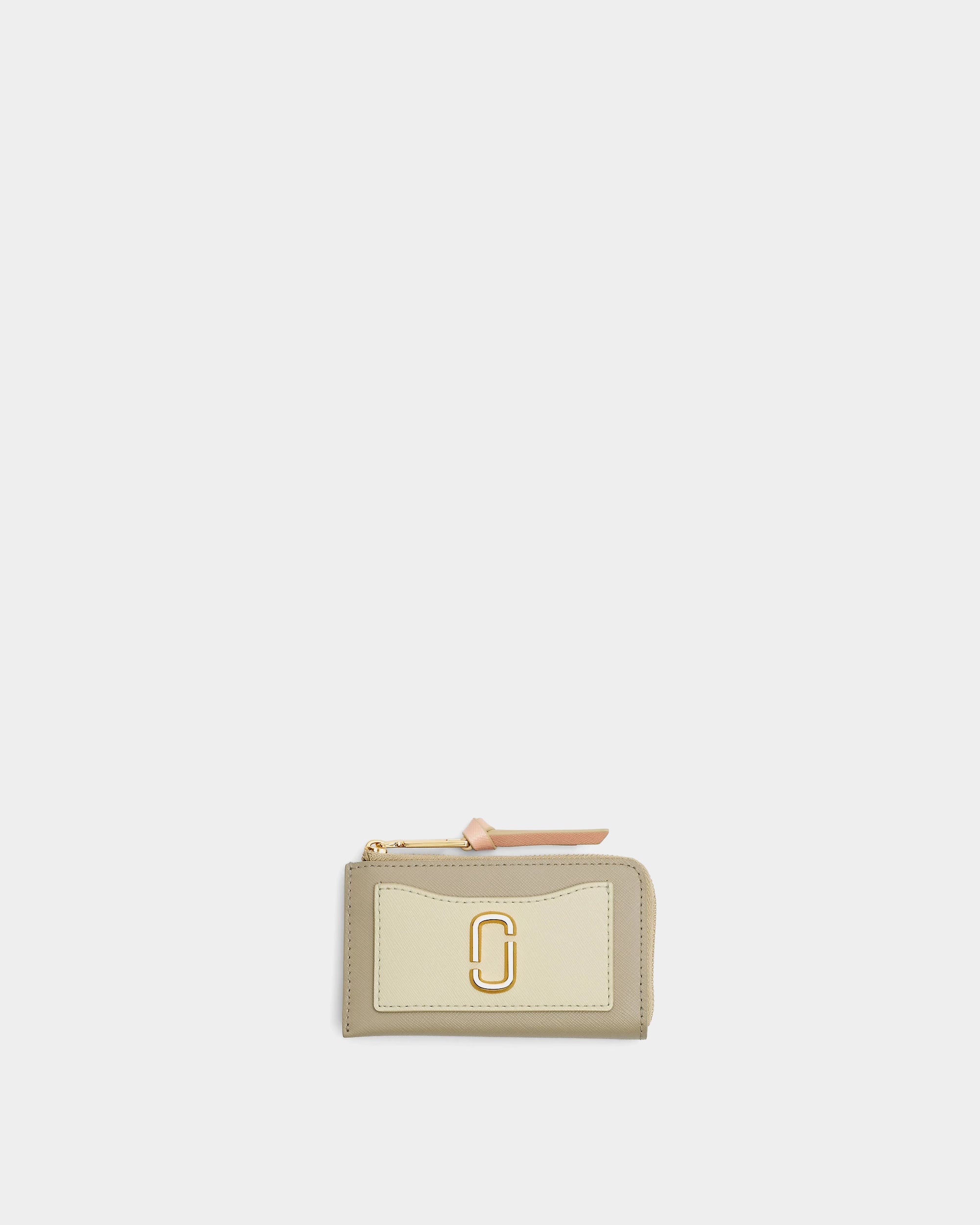 以標誌性的 Snapshot 設計延伸,結合卡其、米白與淡粉色拼接,搭配金色 J Marc Logo。輕薄型輪廓搭配頂部拉鍊開口,方便收納零錢、鈔票與卡片,外部附有卡片夾層,實用性與時尚感兼具,適合日常外出攜帶。