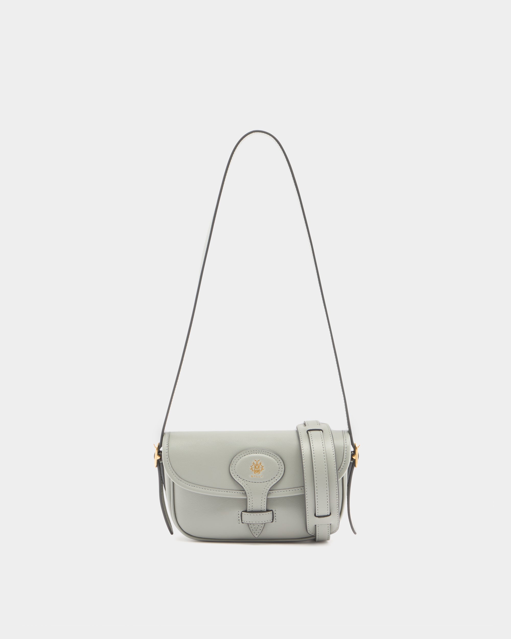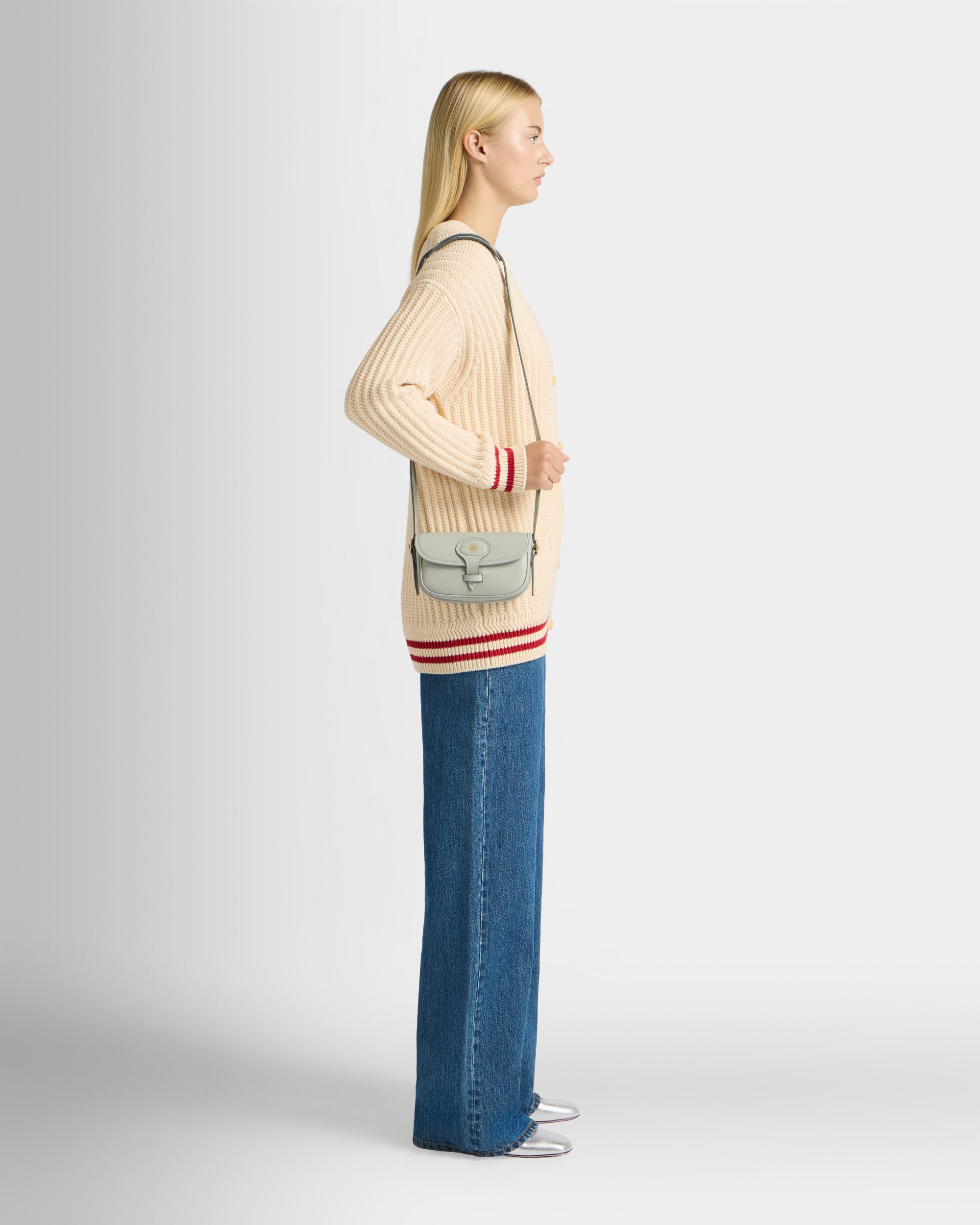 這款 Beckett 小型手袋採用冰川灰小牛皮製作,緊湊輪廓的翻蓋上飾有金色壓印 Bally Crest。可選兩種背帶,提供肩背與斜背的多種攜帶方式。