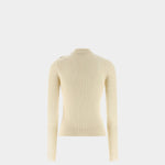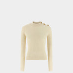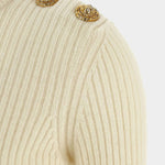 米色羅紋針織毛衣,搭配肩線三顆經典金色獅頭紐扣,展現低調奢華與修身剪裁。