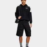 這款短褲採 100% 棉材質製作,屬經典工裝版型,膝上長度、大口袋設計,腰部中腰並附有腰帶環,整體為標準版型,呈現簡約休閒街頭感。
