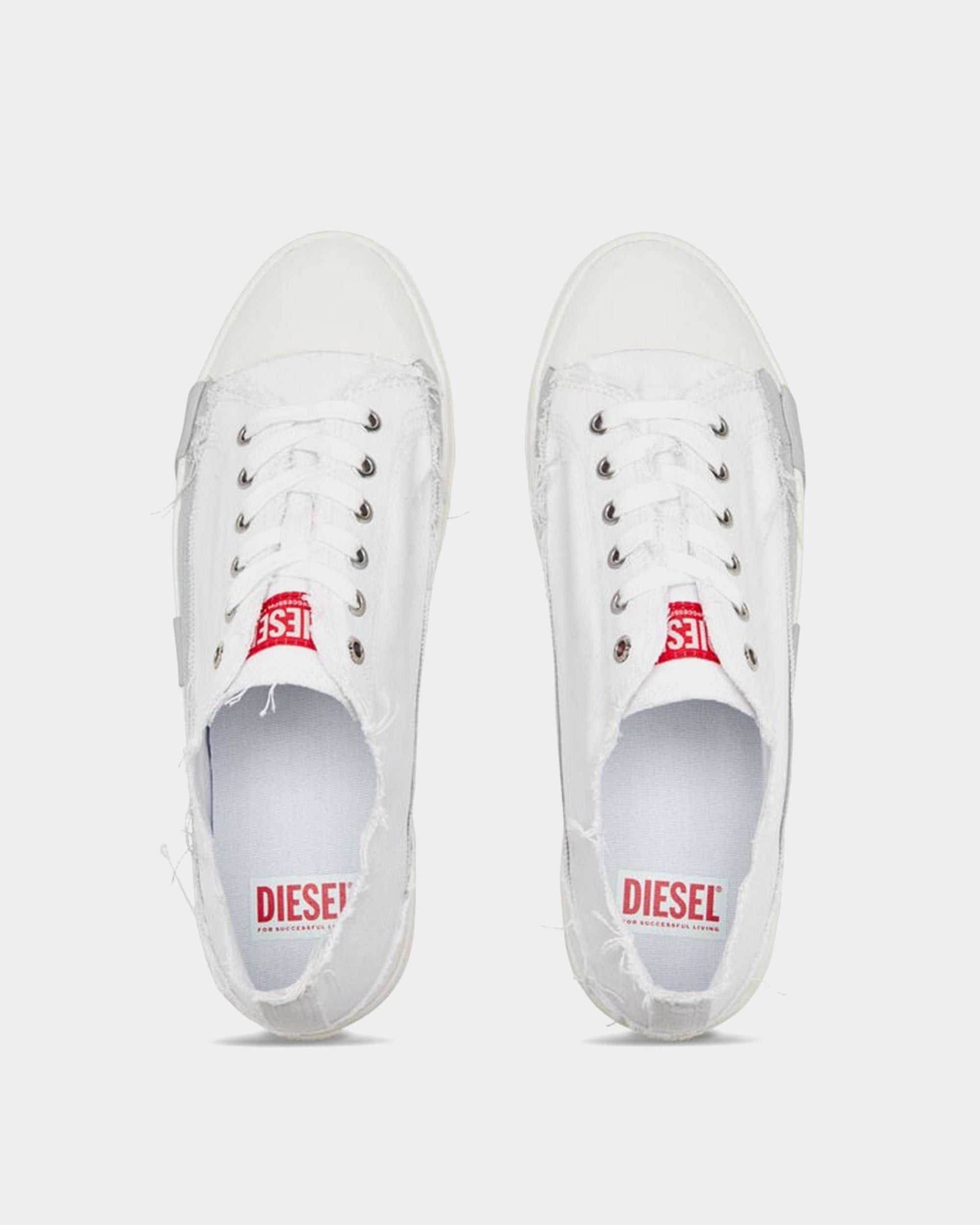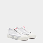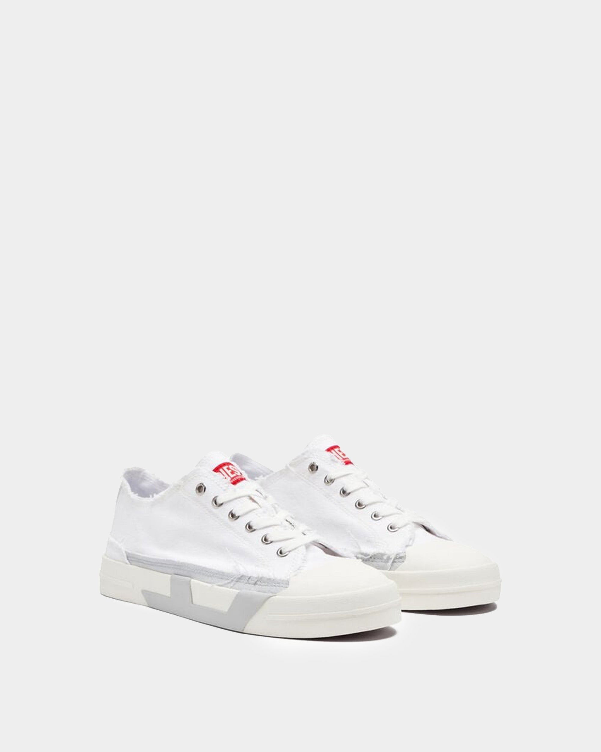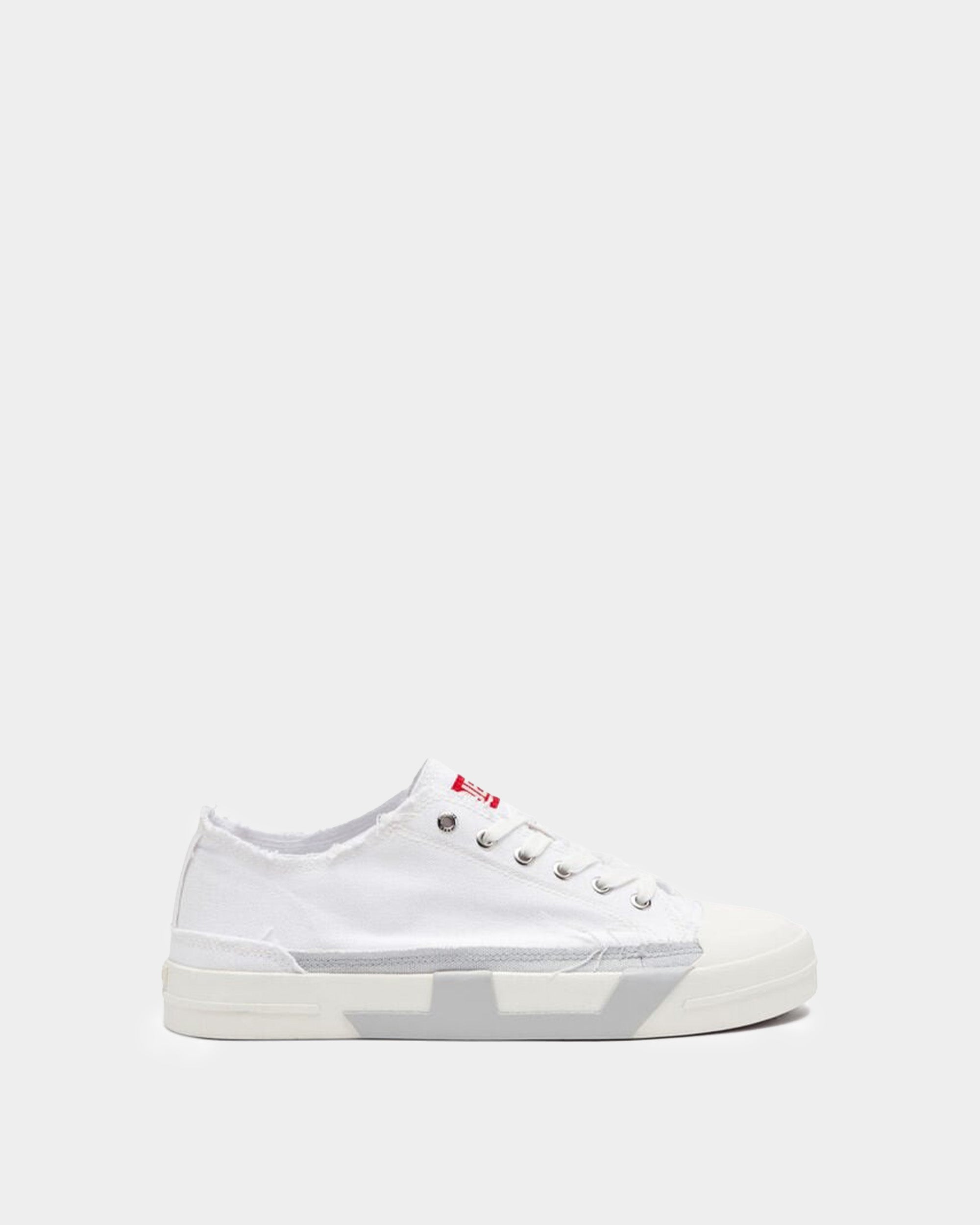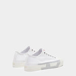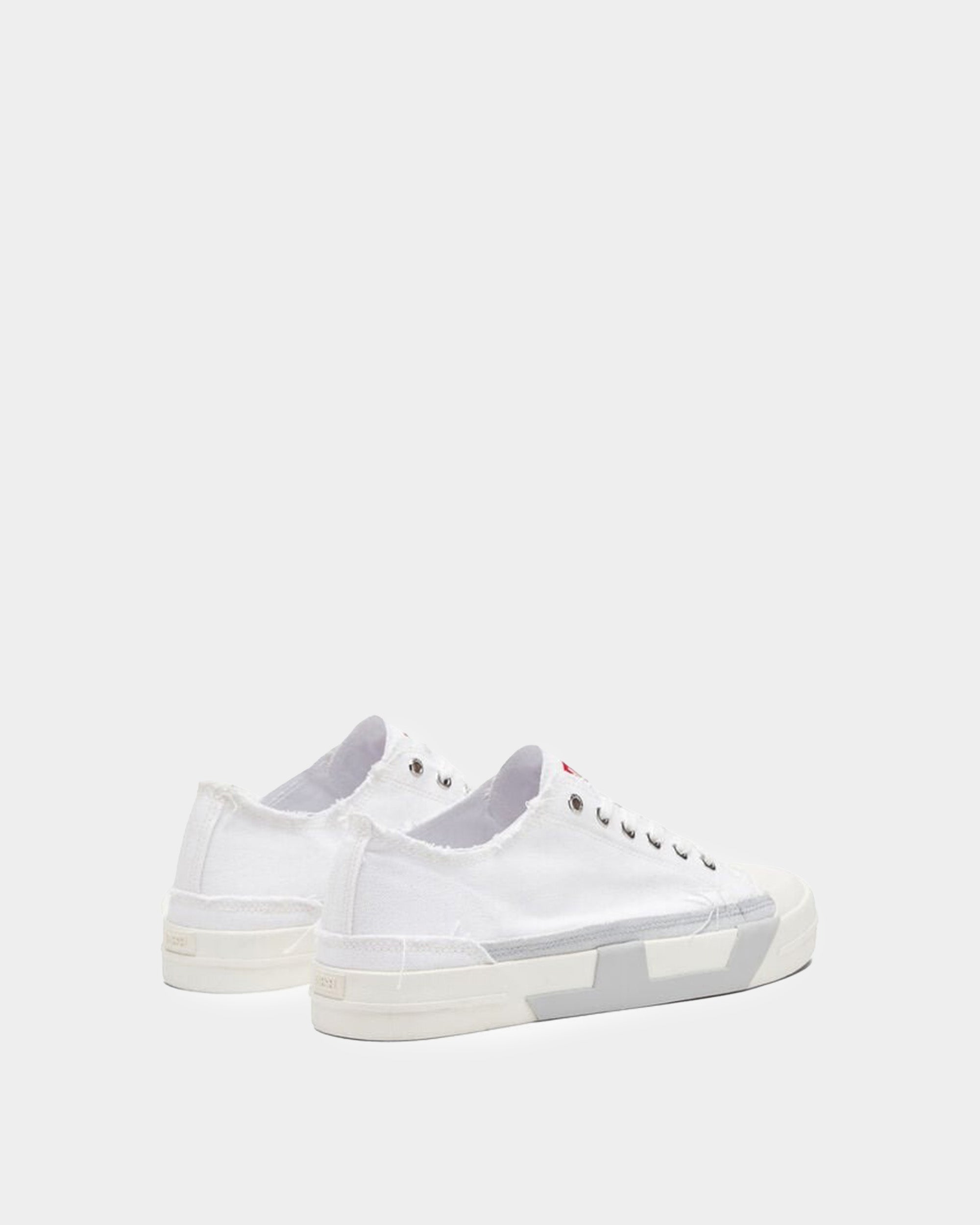 這是一雙 100% 棉帆布製成的低筒休閒鞋,採傳統綁帶設計,表面有破舊效果、污漬感刷色處理,呈現復古街頭風格,適合日常搭配休閒或街頭服裝。