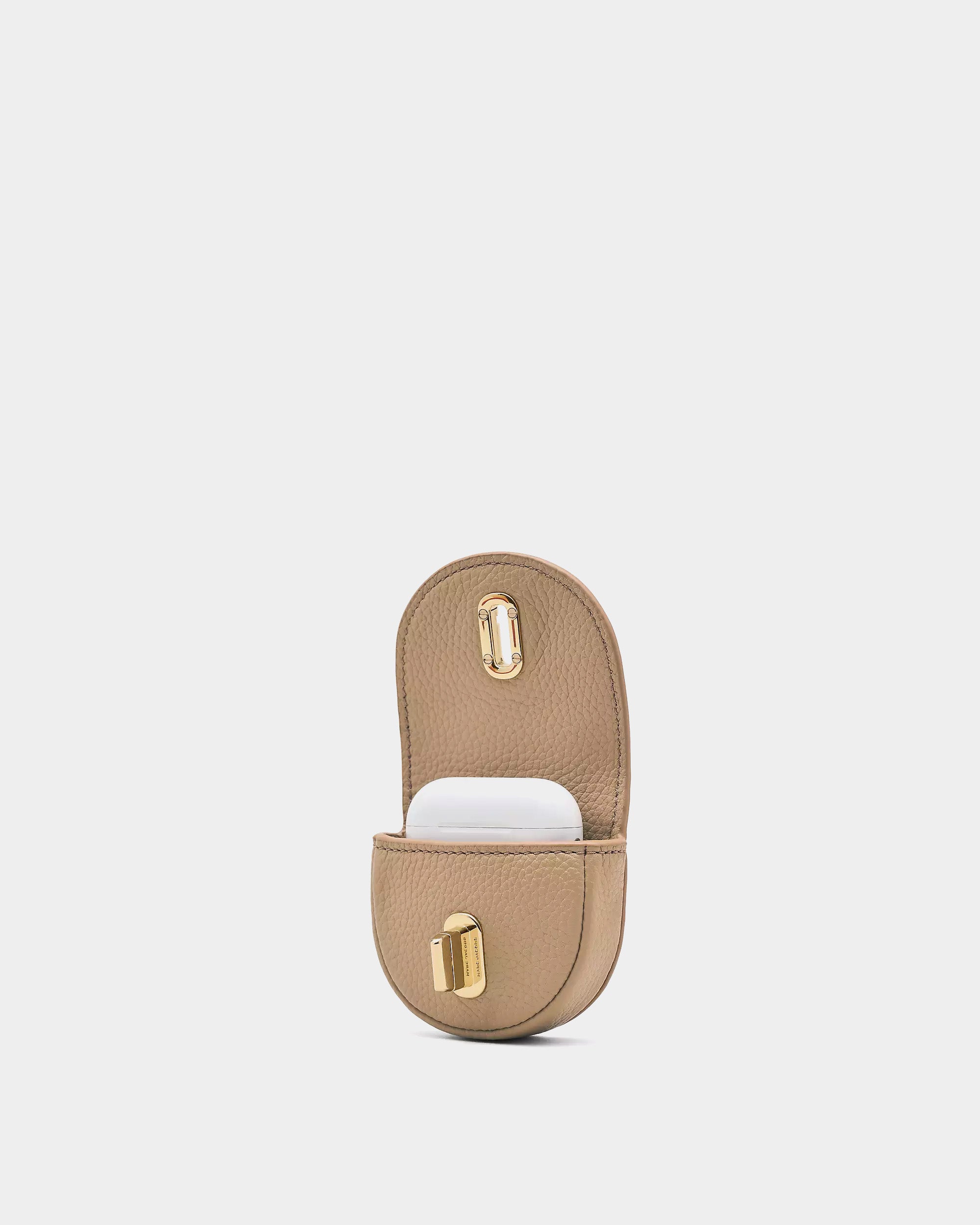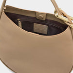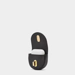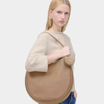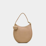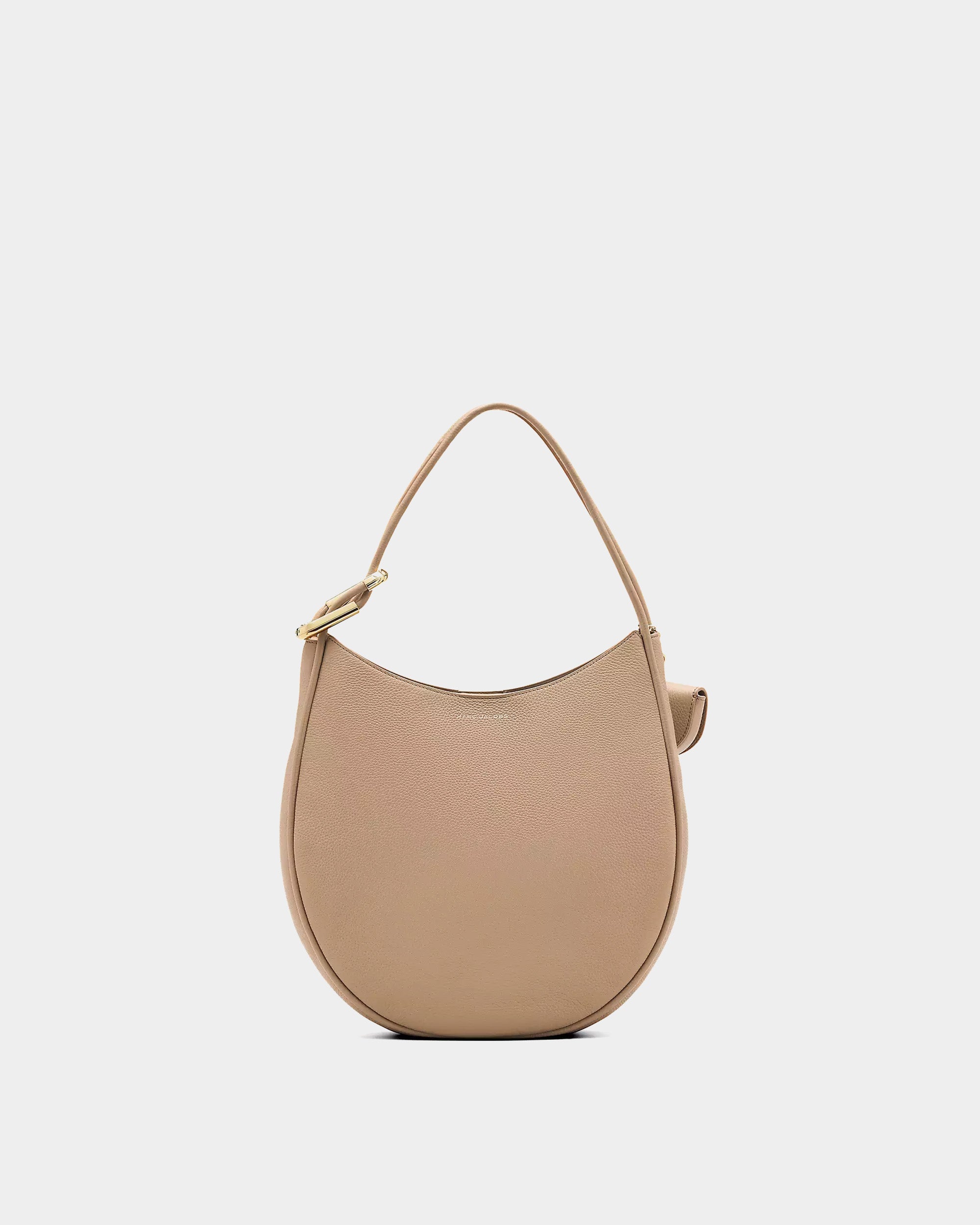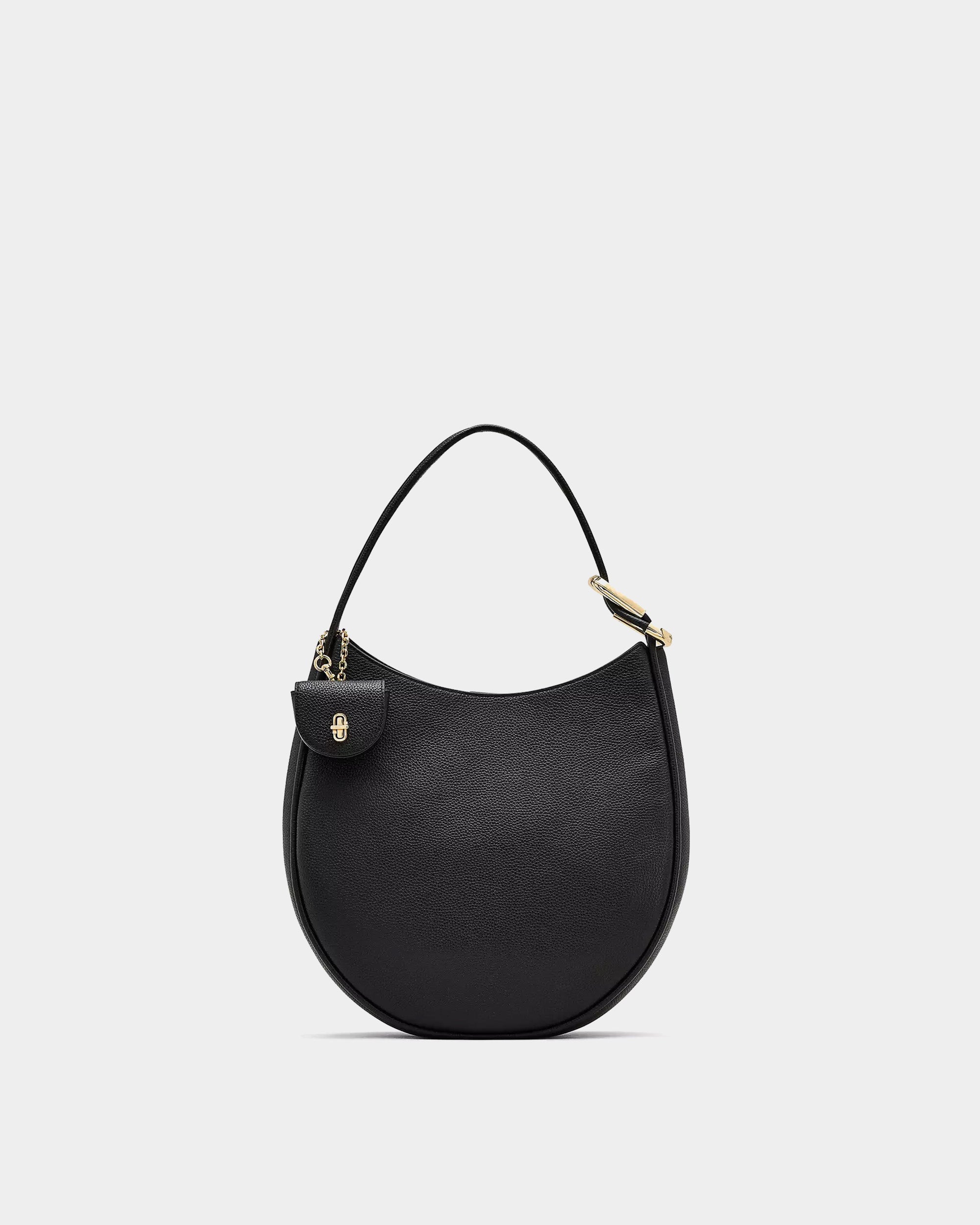 這款 The Large Dual Hobo 包採用全粒面牛皮製成,呈現圓潤的新月形輪廓,設計簡約卻充滿現代感。配有金色 Dual 鉸鏈裝飾與可拆式耳機盒吊飾,內部設有拉鍊袋與外部可拆式翻扣小袋,實用性與時尚感兼具。