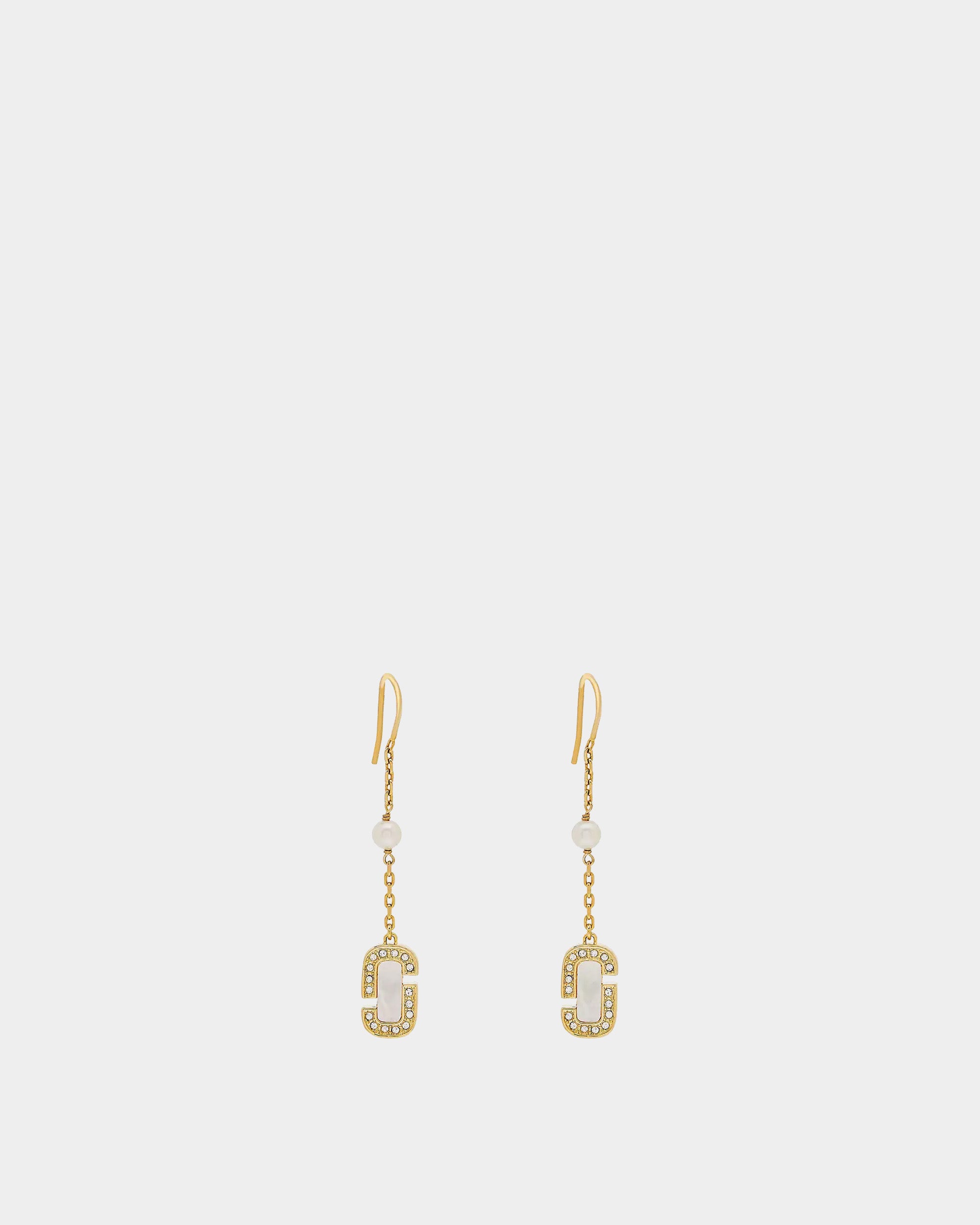 此款耳環採鍍金黃銅材質,搭配光澤母貝吊墜與點綴玻璃水晶細節,配備法式耳線設計,帶來 4 cm 長的垂墜視覺效果,流露出永恆優雅與無負擔奢華質感