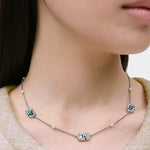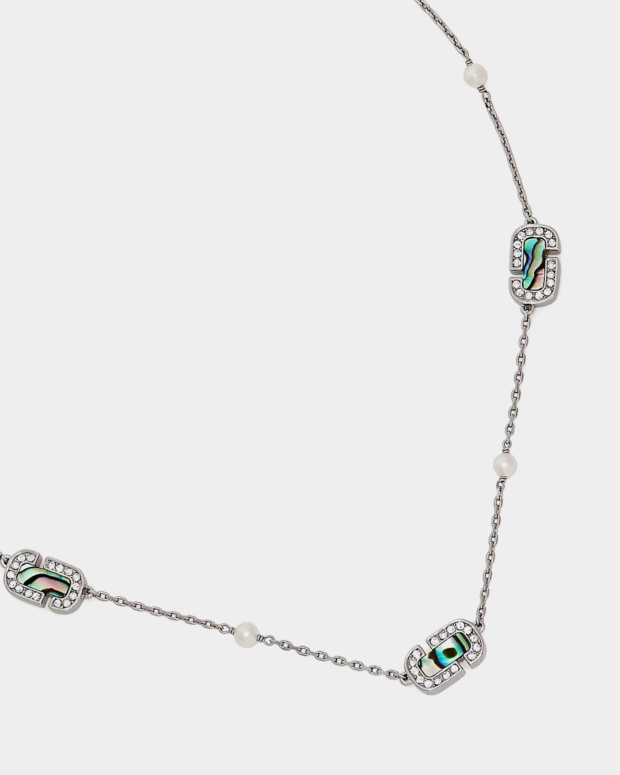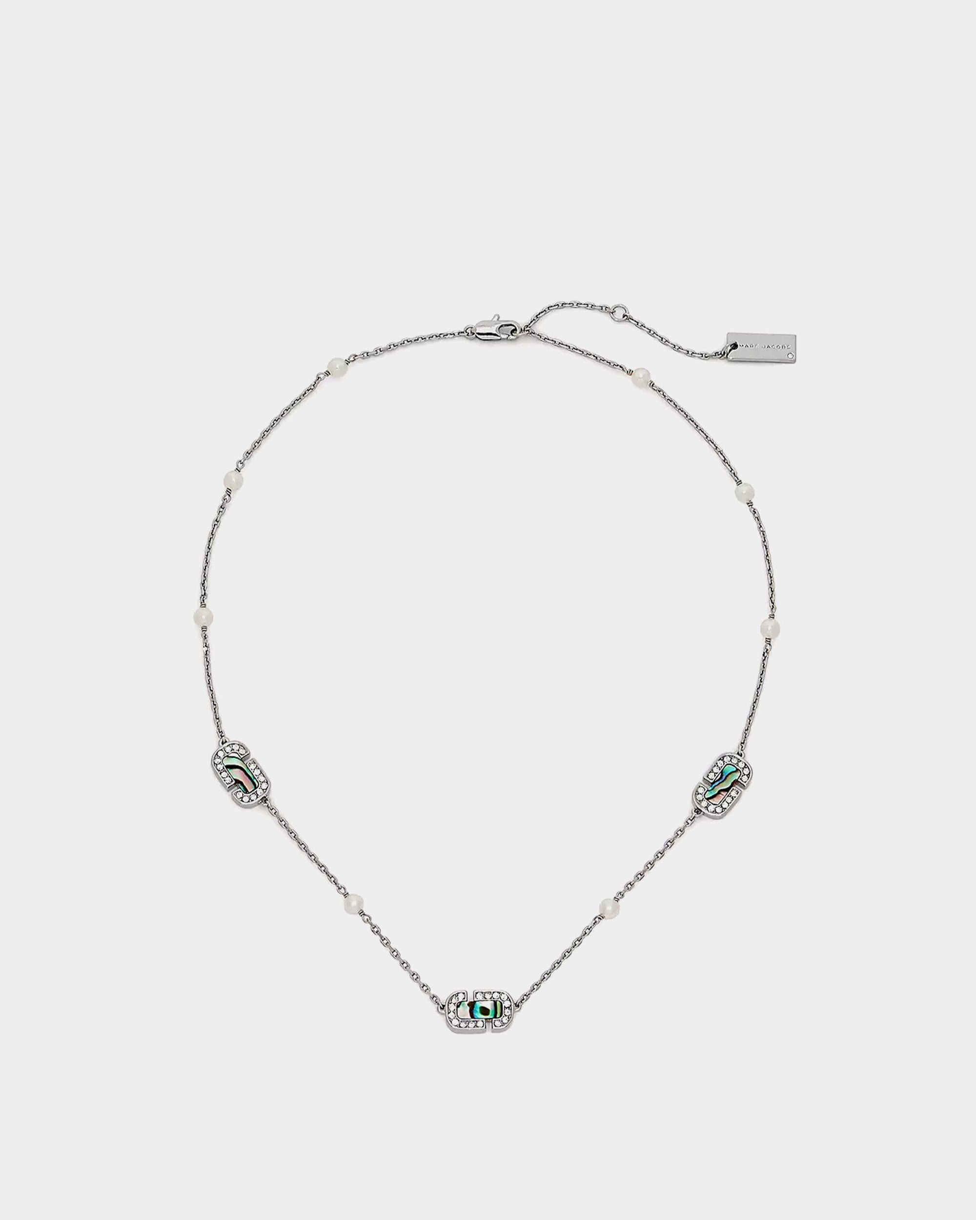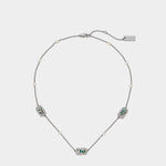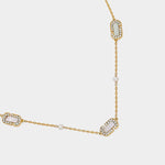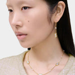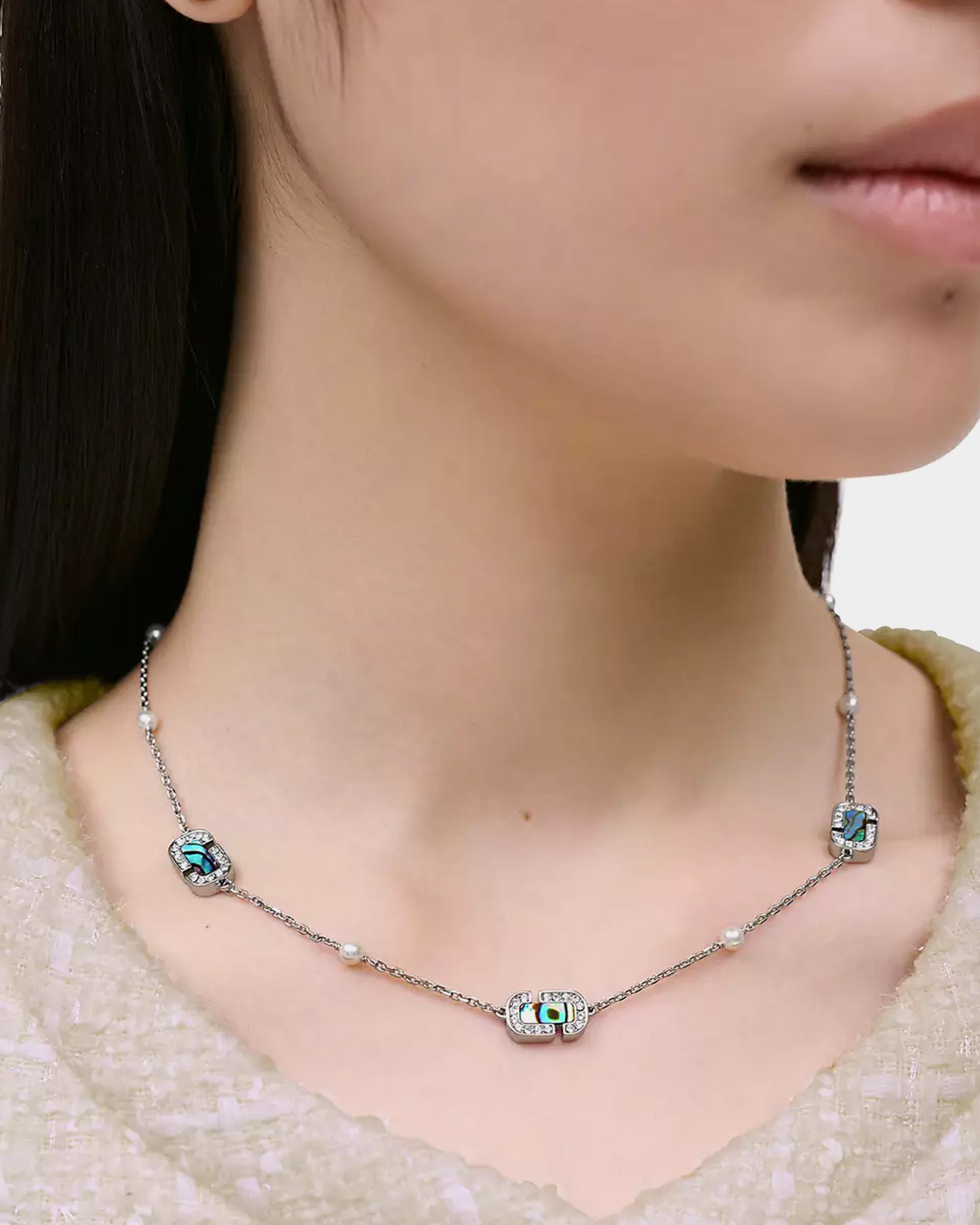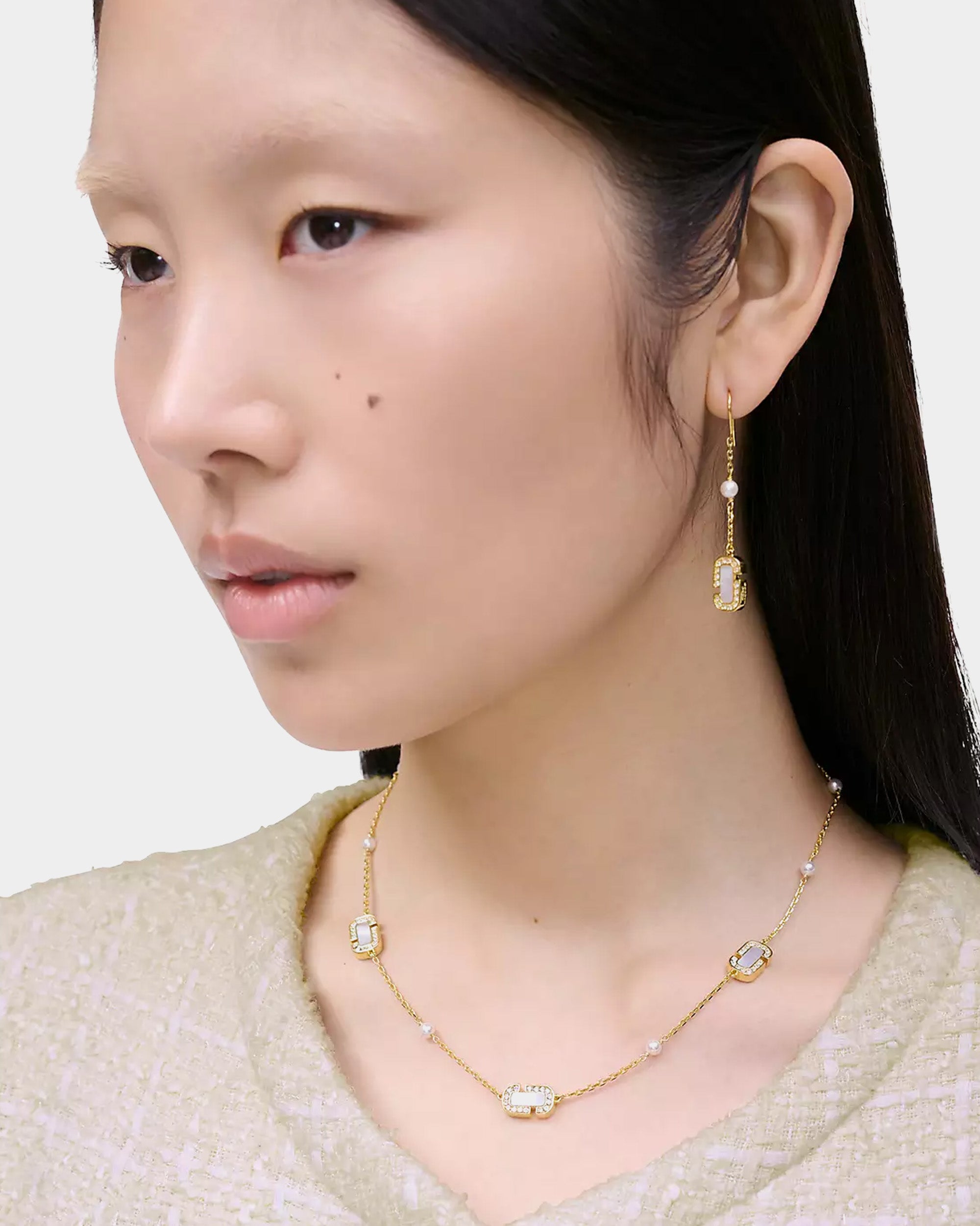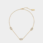 這款精緻的項鍊採用金色鍍銅材質,搭配三顆母貝圓環吊墜,並以閃亮的水晶點綴,展現現代優雅的設計感,適合日常佩戴或搭配晚宴裝扮。