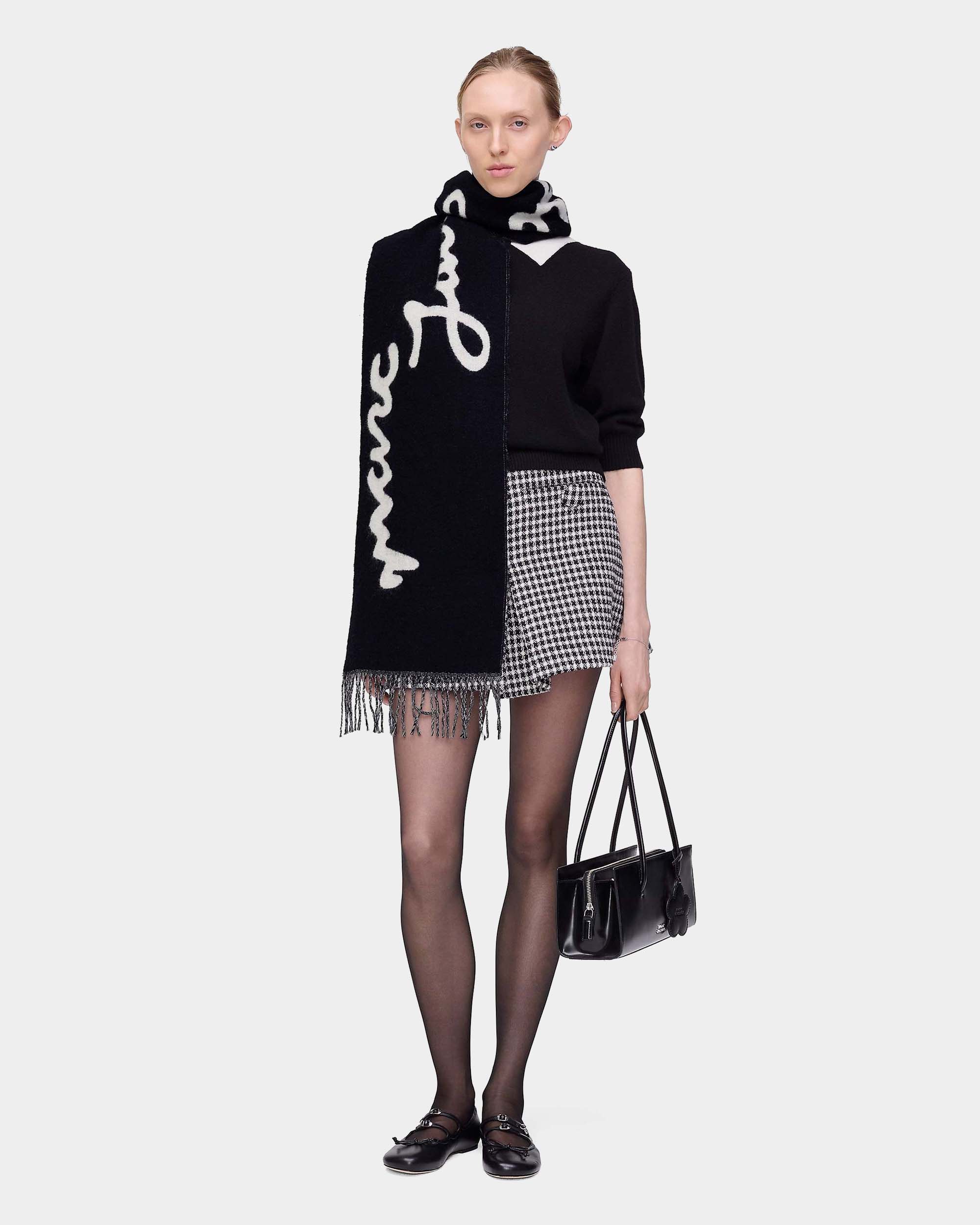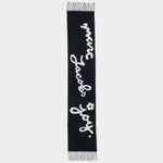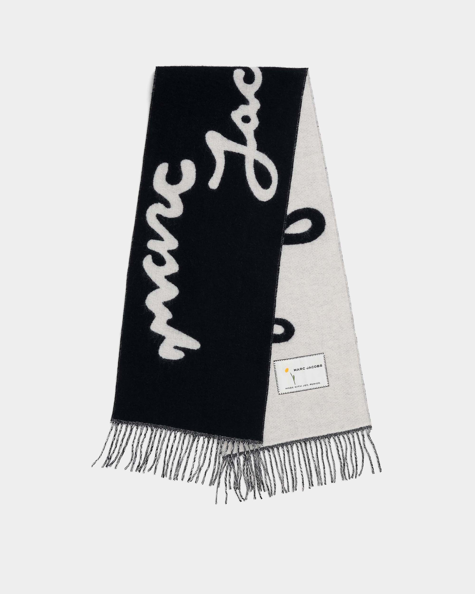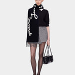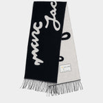這條圍巾採 100% 羊毛製作,長方形雙面設計,兩端附有流蘇 (fringe);黑白或雙色配色,印有品牌 Logo,質地保暖、觸感柔軟,男女皆適用,冬季搭配外套或大衣的通勤族非常推薦使用。