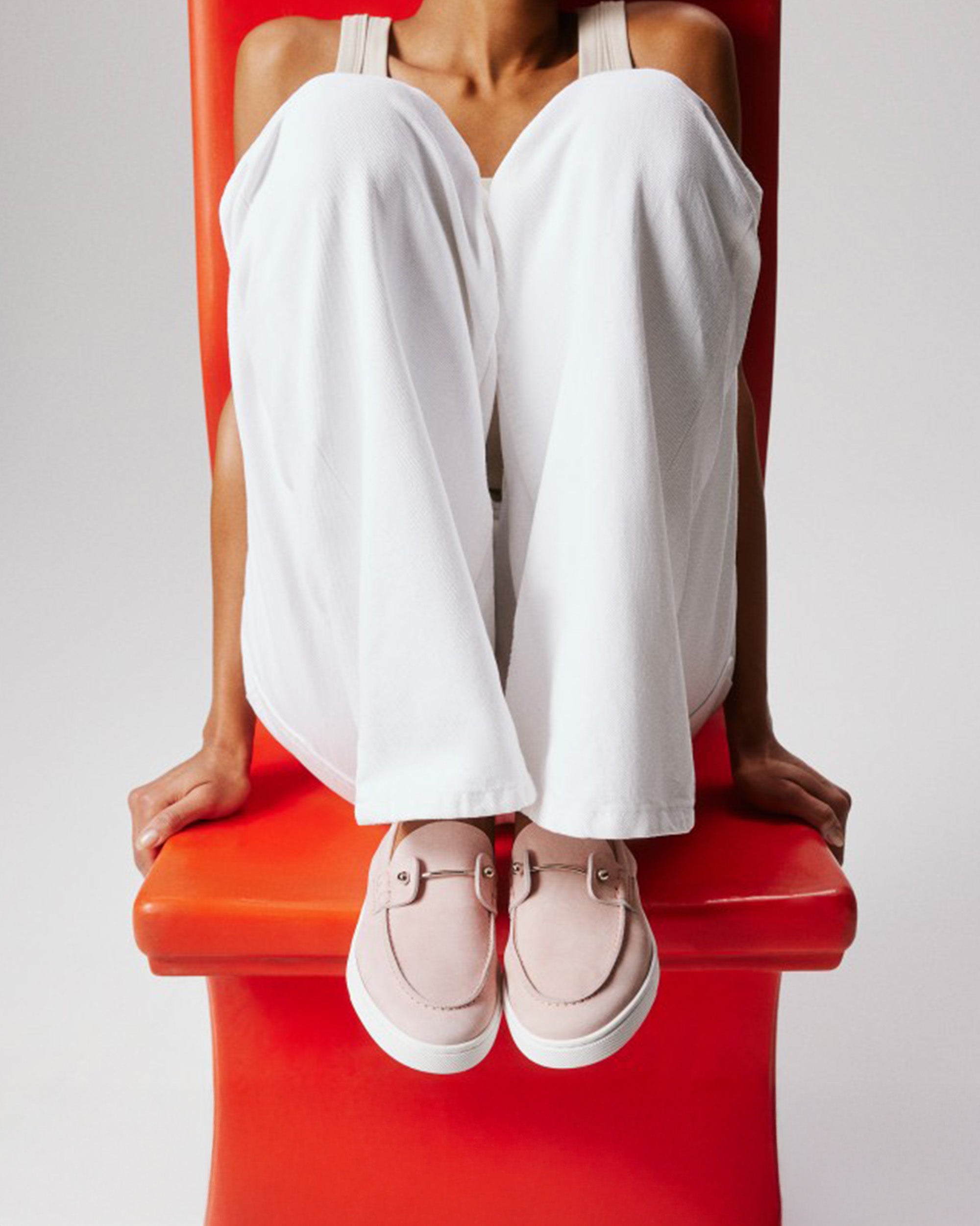 以柔軟麂皮打造,質地輕盈親膚,結合經典船鞋輪廓與休閒橡膠鞋底,展現自在舒適的日常氛圍;米色調百搭耐看,搭配標誌性紅底細節,讓這雙鞋成為日常通勤、休閒出遊甚至度假造型的理想選擇,完美平衡簡約實穿與奢華格調。