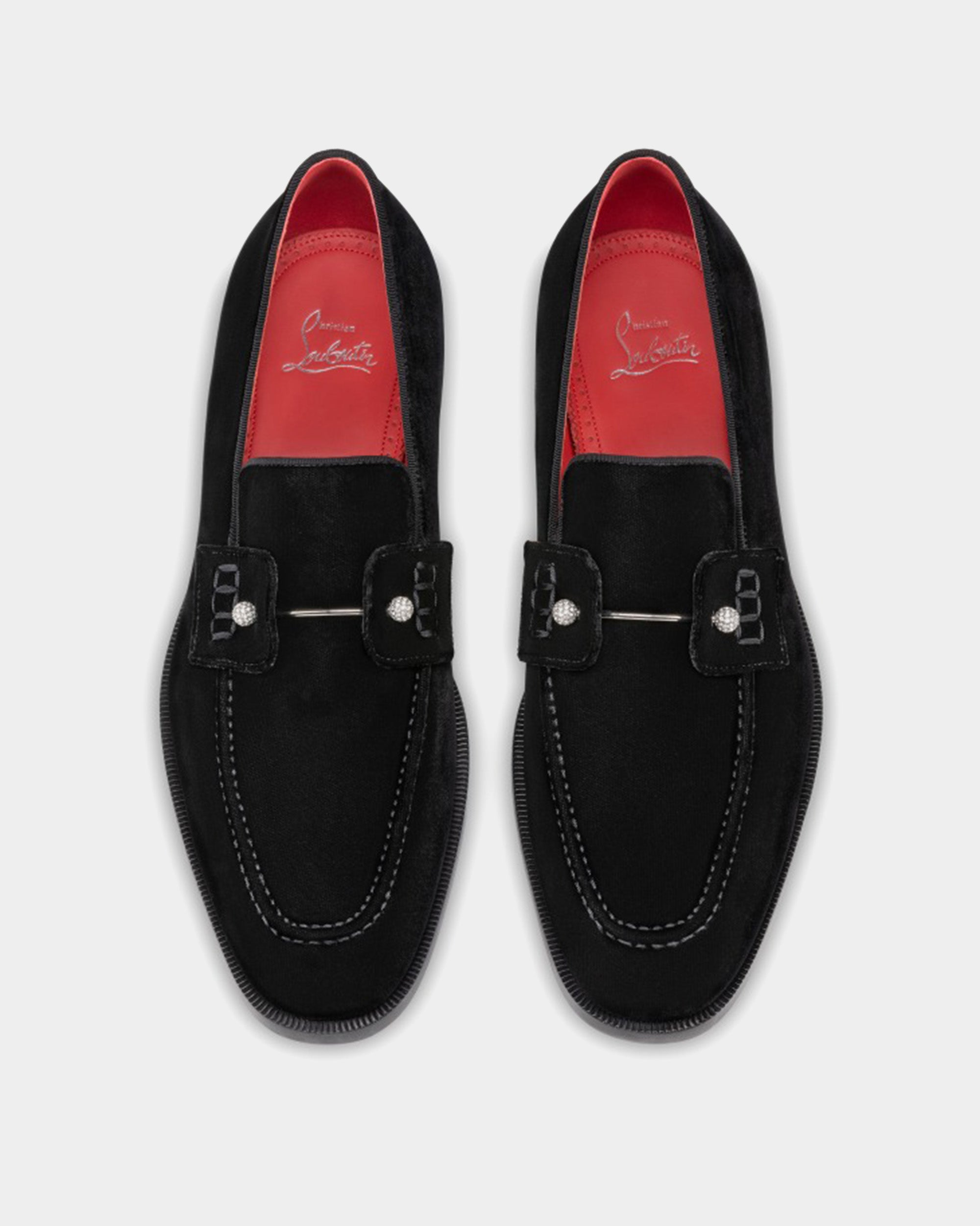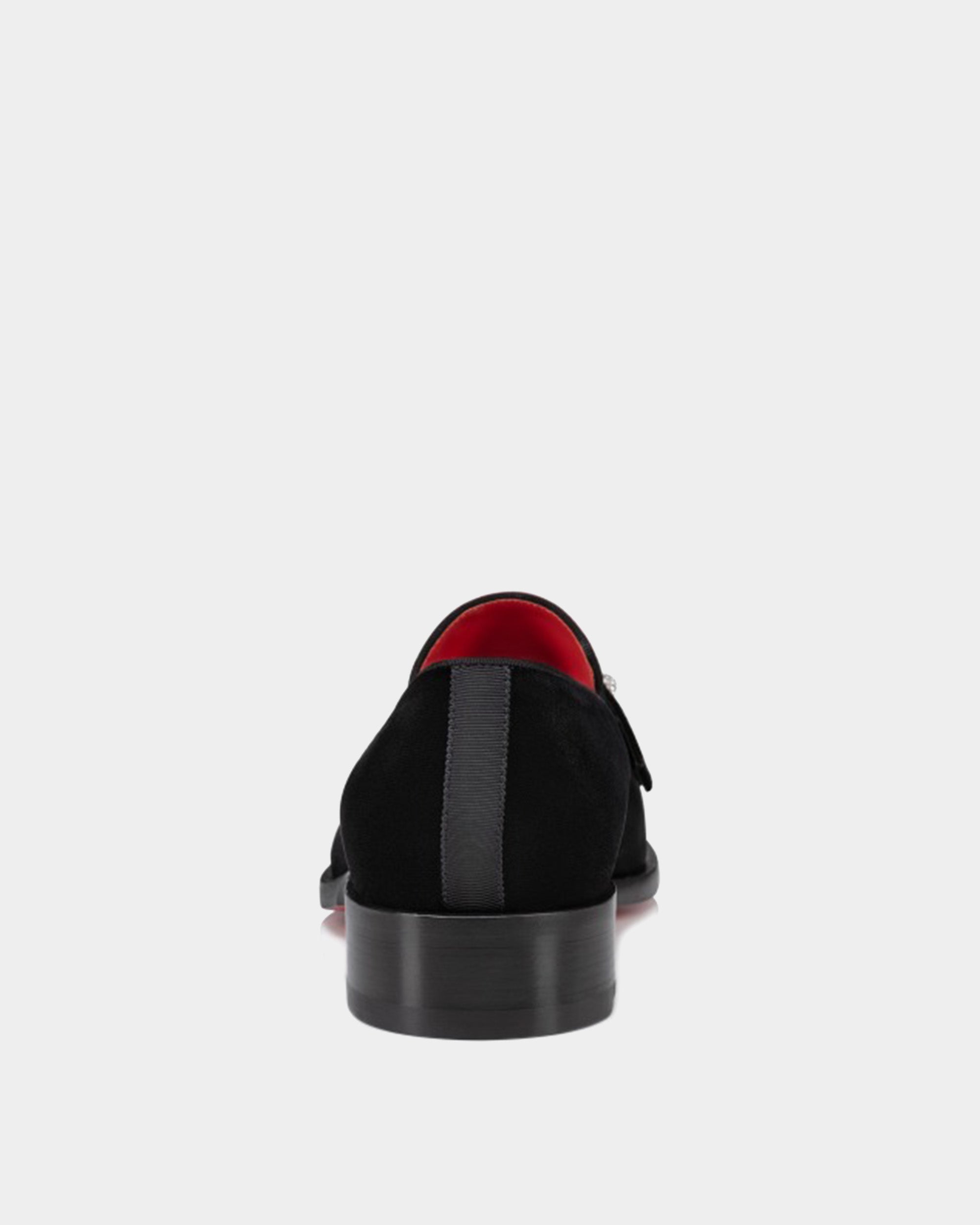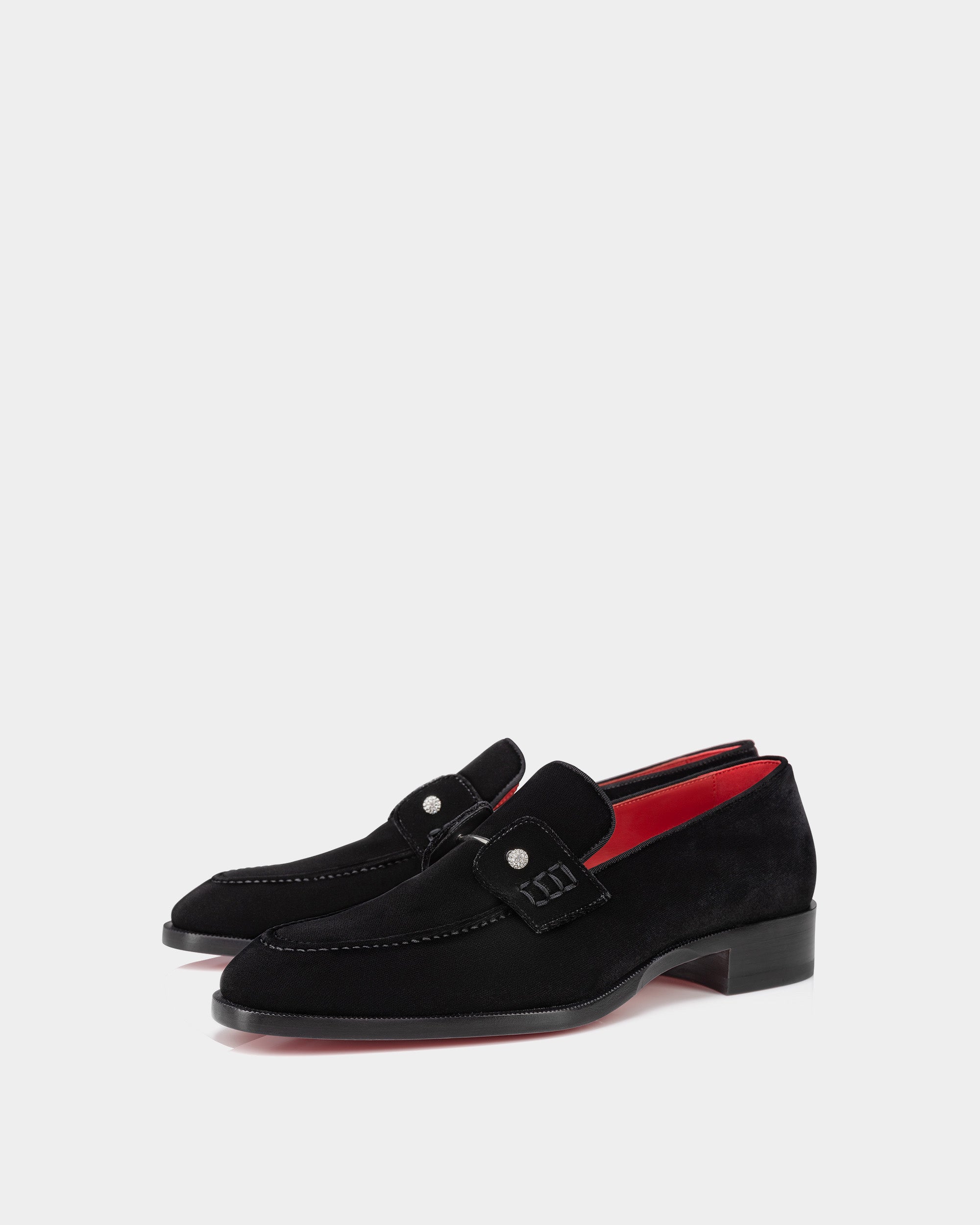 以柔軟天鵝絨材質搭配經典便士鞋型,鞋面飾有低調水鑽細節,展現內斂中的奢華;紅色皮革內裡與標誌性紅底相呼應,為正式西裝或晚宴造型增添獨特辨識度,是紳士衣櫃中不可或缺典雅單品。